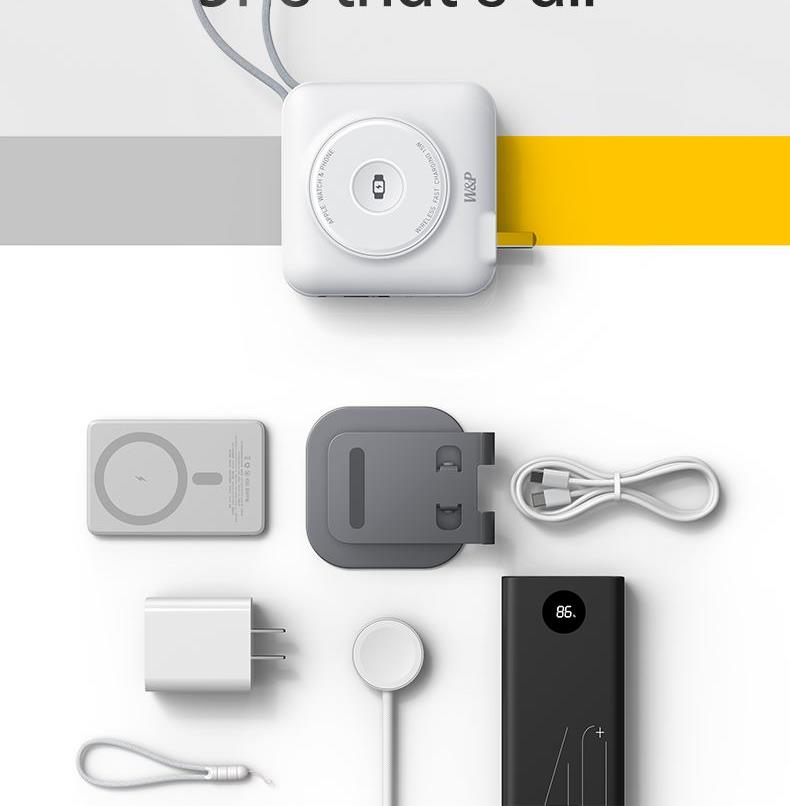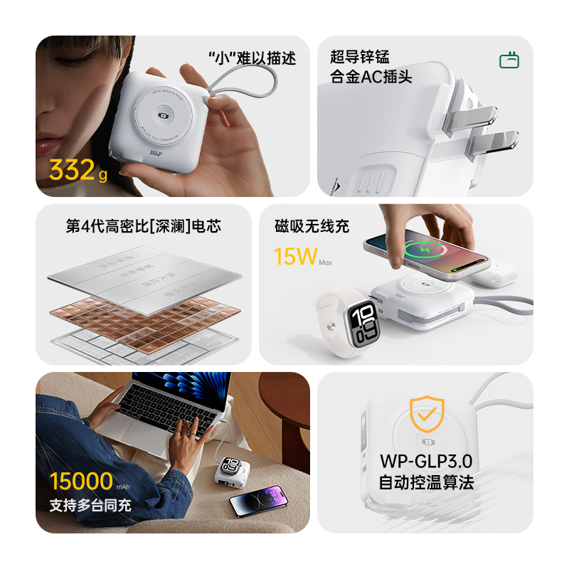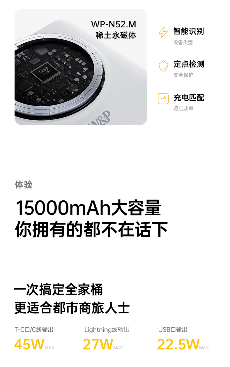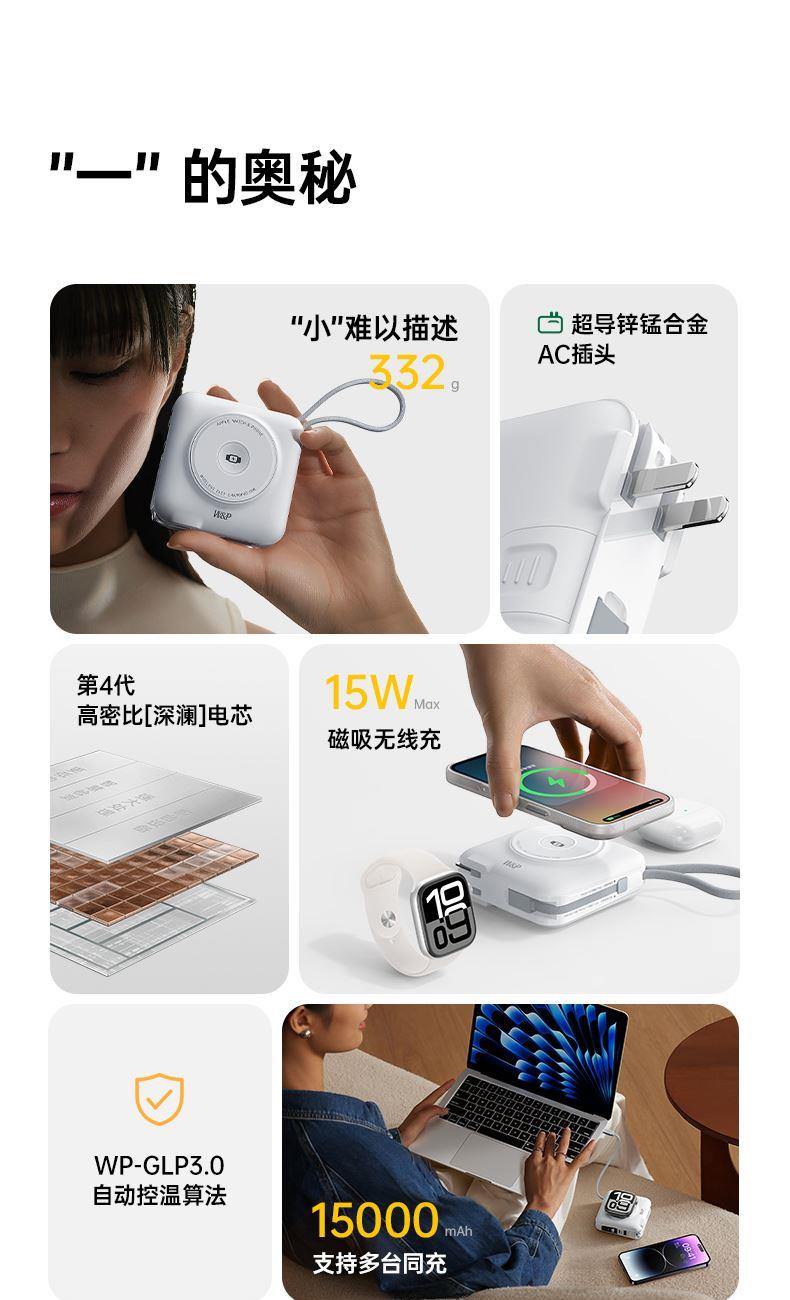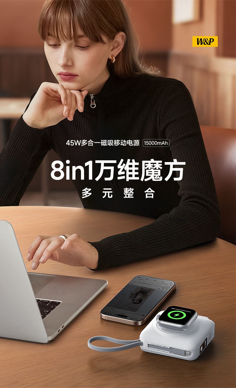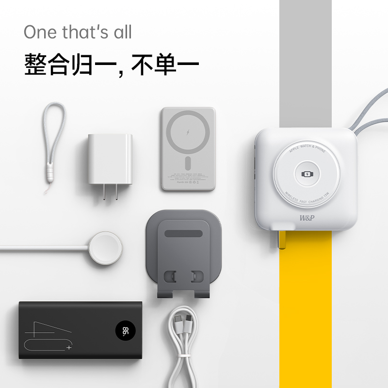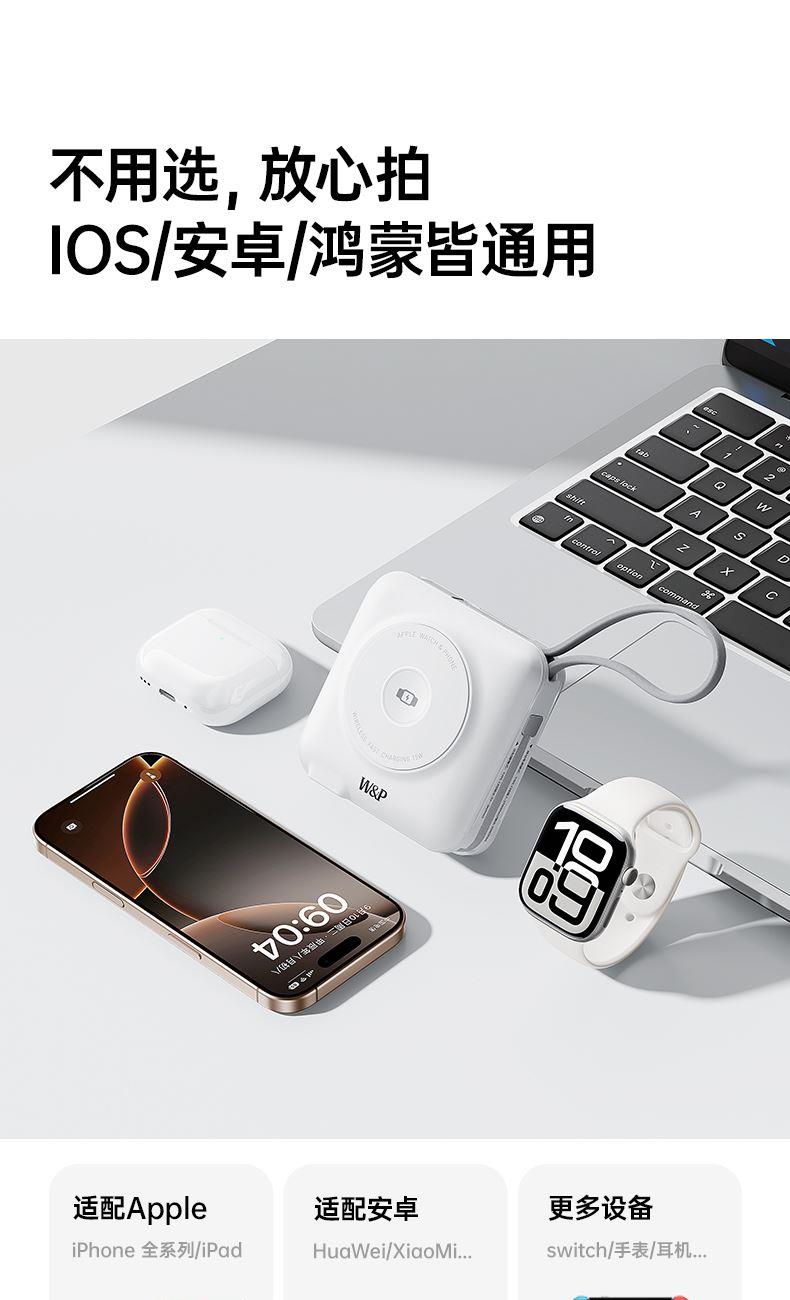 产品型号:WPD45W 产品尺寸:88*88*38.5mm 产品重量:约332g W&P磁吸充电宝,科技赋能移动生活; 45W快充,自带苹果线及TC线; 创新磁吸矩阵,兼容苹果安卓,三设备同时充; LED数字屏实时显示电量; 隐藏式双线+可折叠插头,满足多样场景; N52钕磁铁吸附力提升60%,稳固不断连; 15000mAh电芯,满足全天差旅需求。