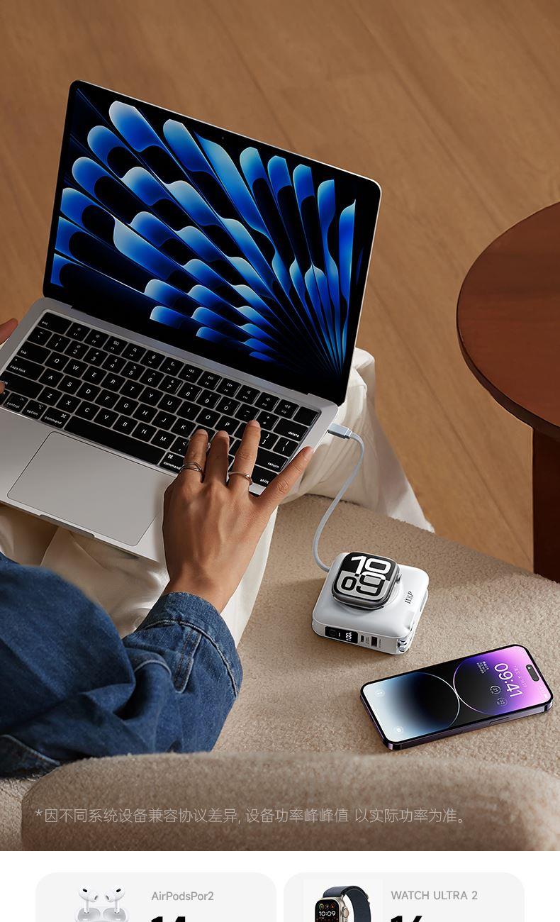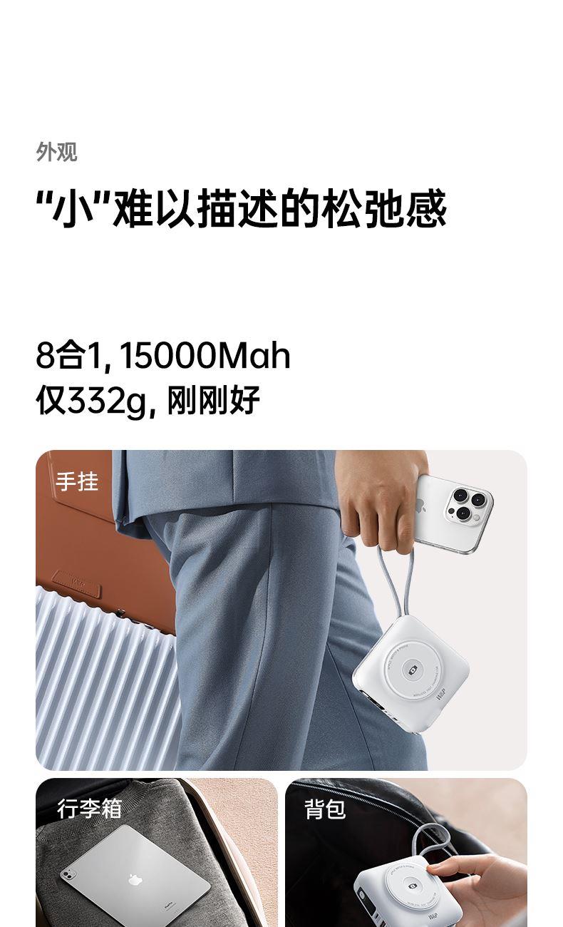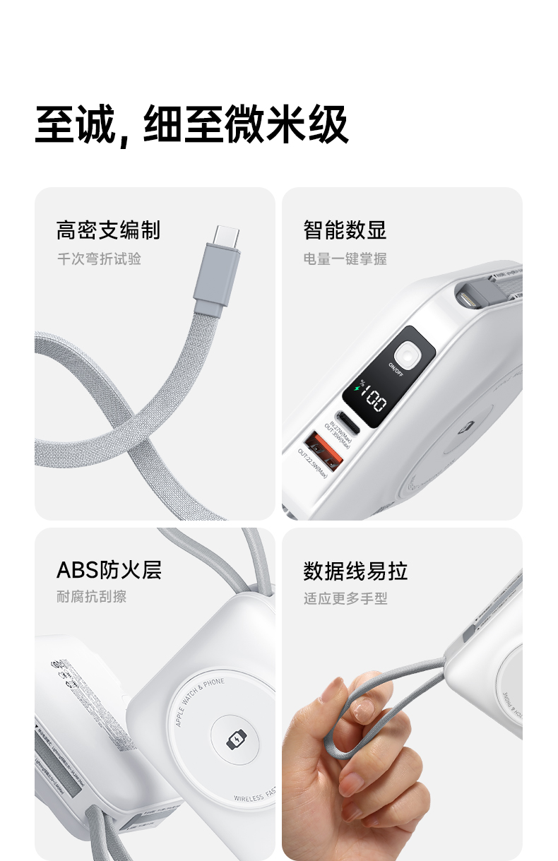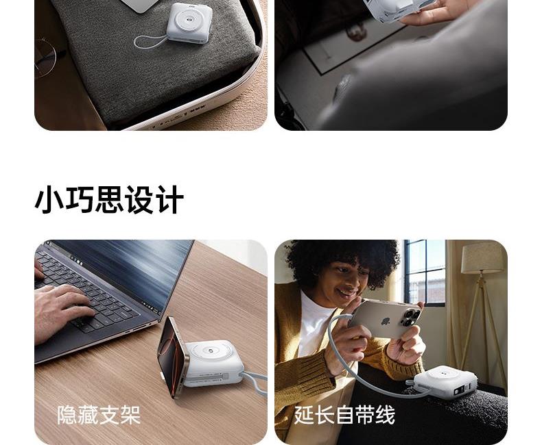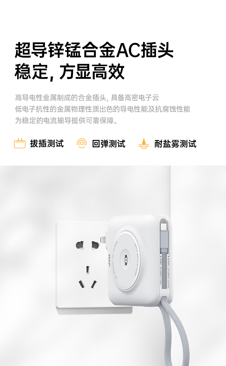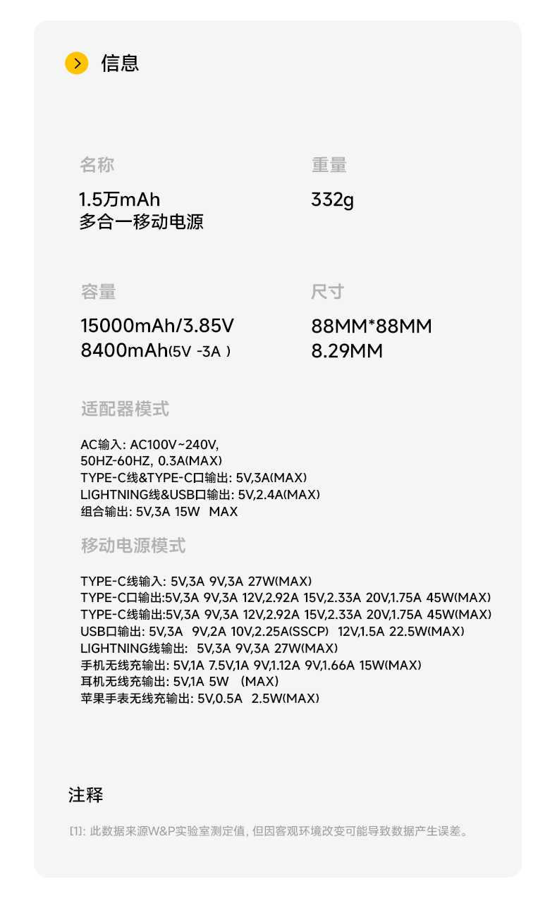 产品型号:WPD45W 产品尺寸:88*88*38.5mm 产品重量:约332g W&P磁吸充电宝,科技赋能移动生活; 45W快充,自带苹果线及TC线; 创新磁吸矩阵,兼容苹果安卓,三设备同时充; LED数字屏实时显示电量; 隐藏式双线+可折叠插头,满足多样场景; N52钕磁铁吸附力提升60%,稳固不断连; 15000mAh电芯,满足全天差旅需求。