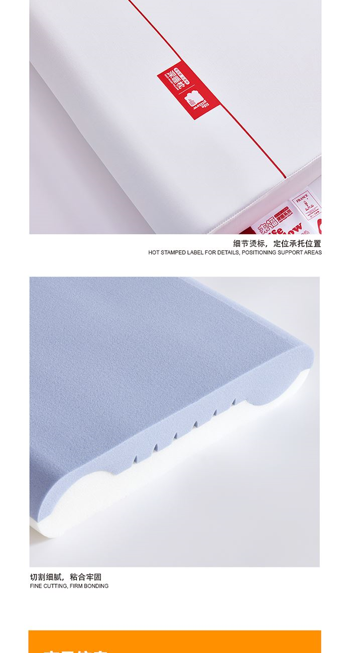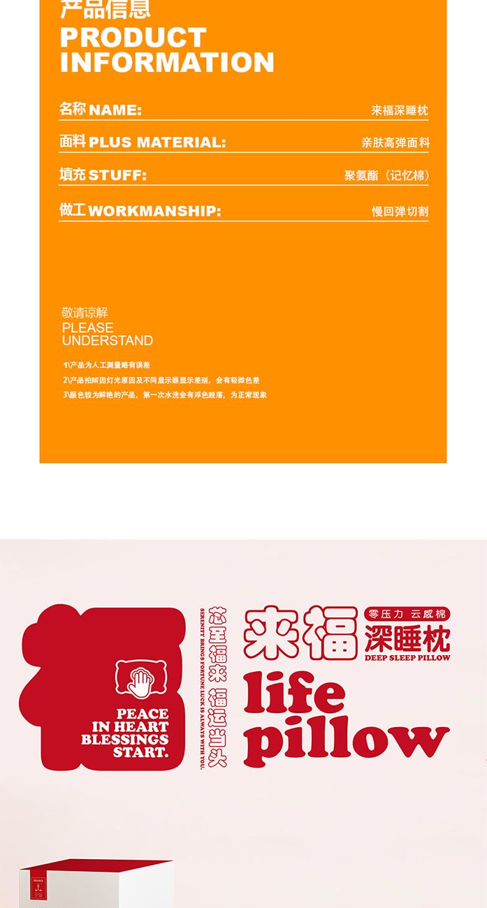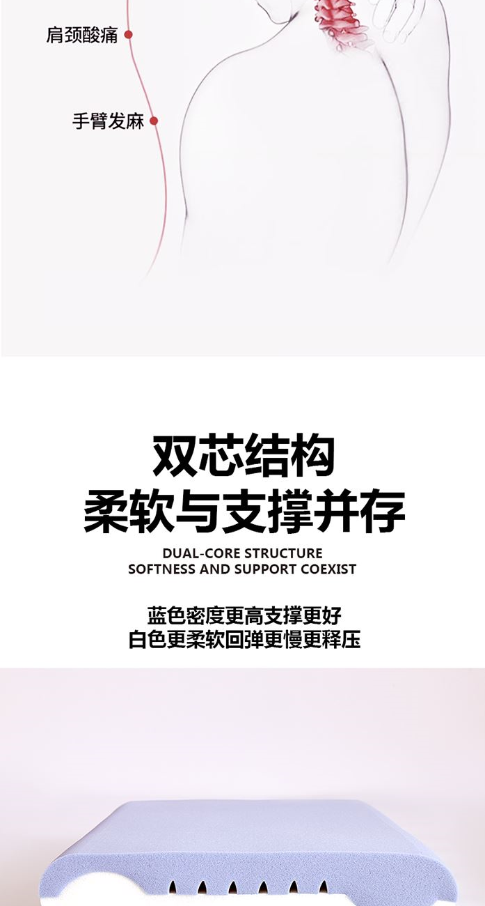 面 料:90%涤纶+10%氨纶 填 充:聚氨酯 工 艺:上下双层结构 规 格:40x70x8cm 重 量:900g 1、深睡双层设计,上层包裹层负责无限柔软,下层支撑层负责头颈不陷落。 2、压力分布均匀,即使睡姿变化,也可支撑,没有悬空区,让压力层层消散。 3、“来福”主题设计,芯至福来,传达美好寓意。