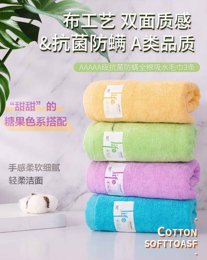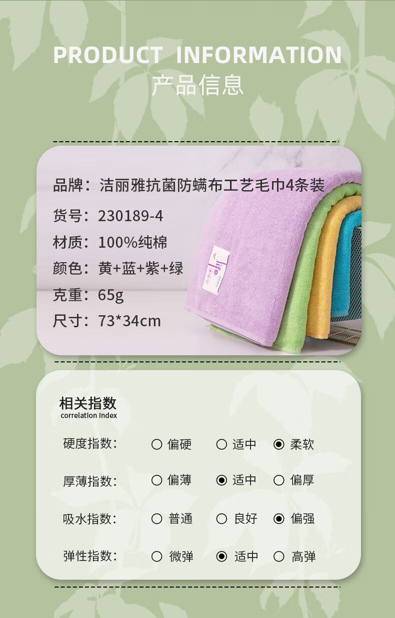 型 号:230189M 组 合:4条(EVA袋装) 材 质:棉 规 格:73*34cm 克 重:65g 颜 色:黄、兰、紫、绿、湖兰