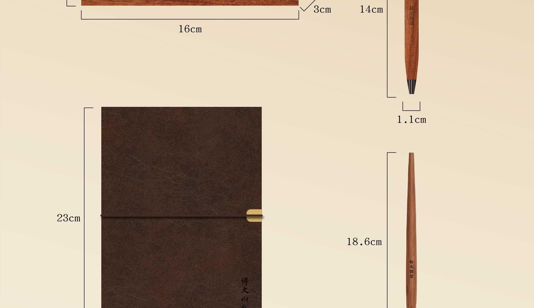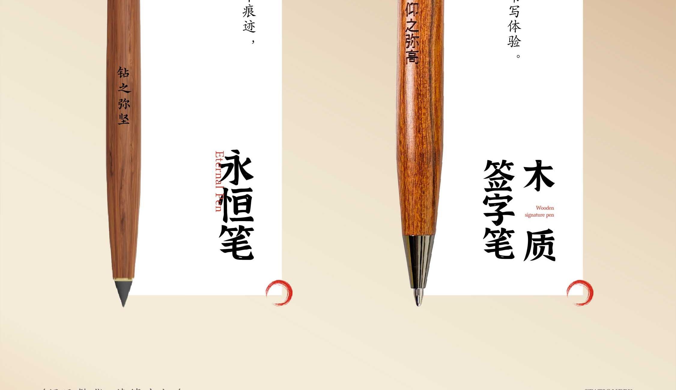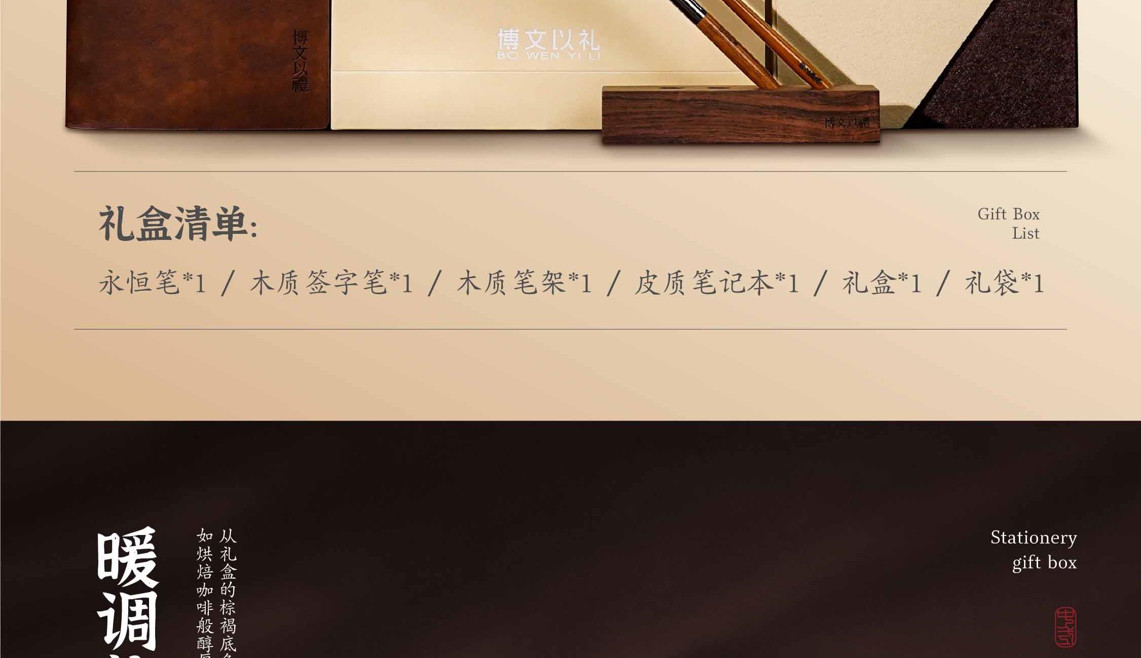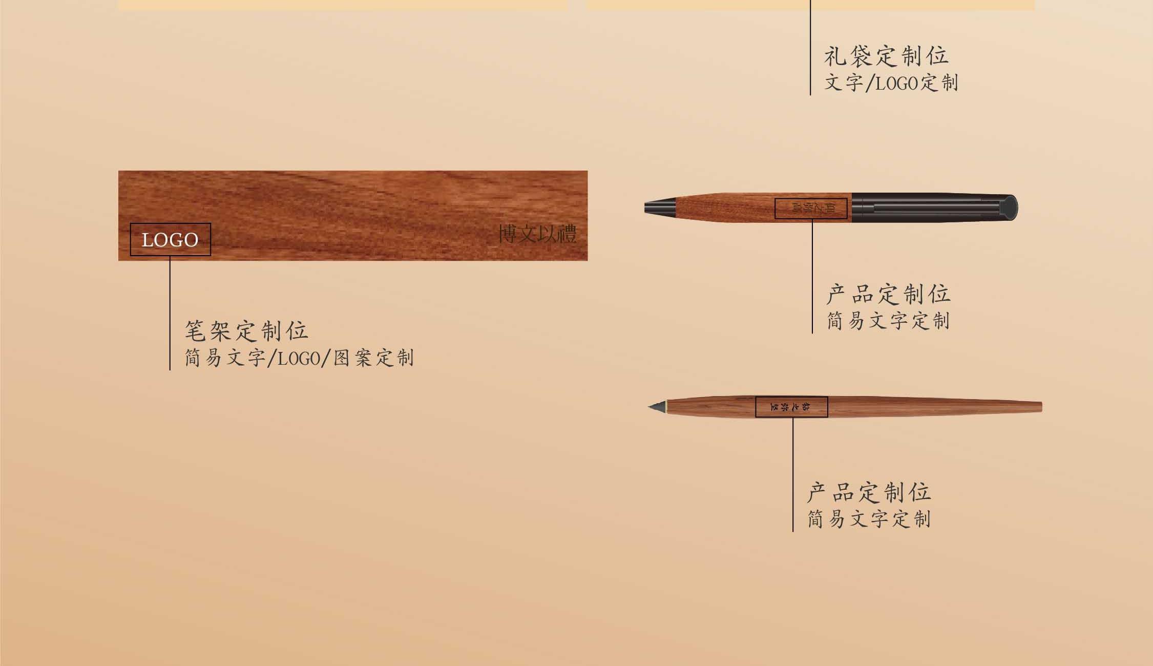 礼盒内容物 ① 永恒笔 ② 木质签字笔 ③ 木质笔架 ④ 皮质笔记本 ⑤ 礼盒 ⑥ 礼袋