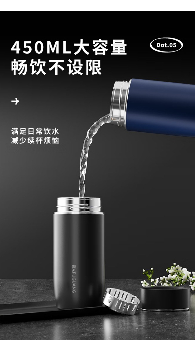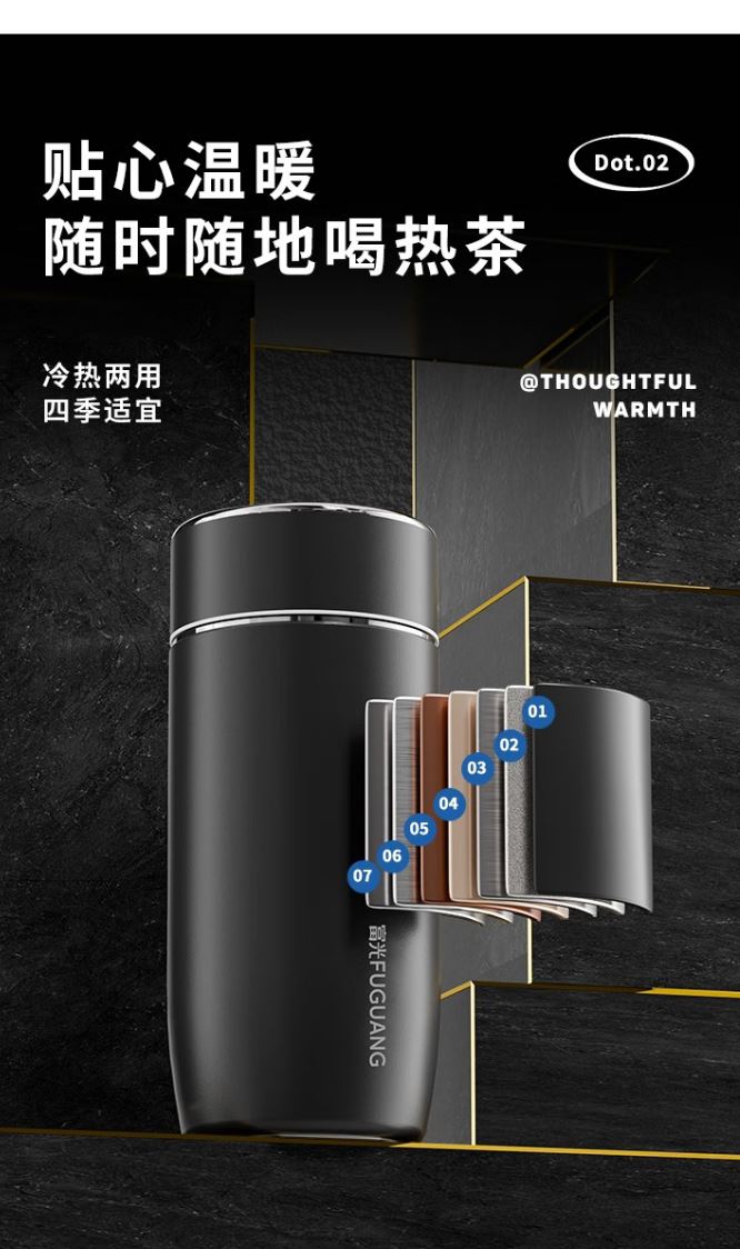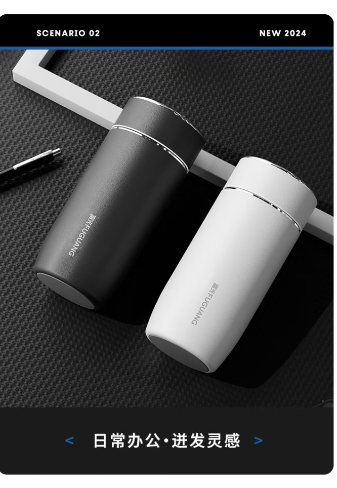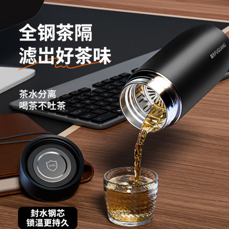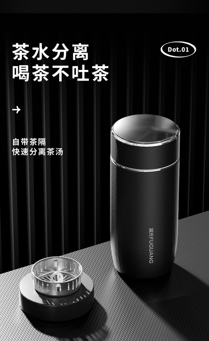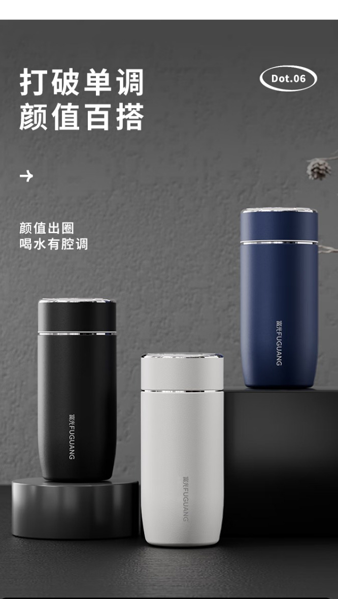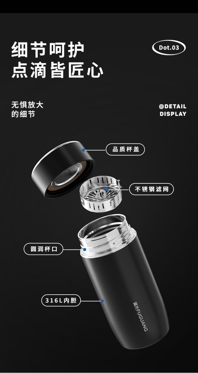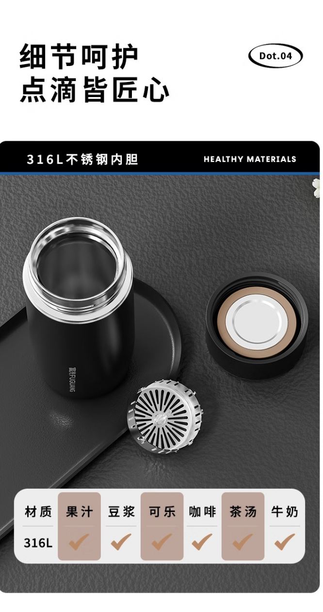 尺寸:5.5*6.8*16.2mm 材质:316奥氏体不锈钢内胆,不锈钢手捏滤网。 无尾真空超长保温。 圆润杯口,自带茶隔,快速分离茶汤。 包装:单瓦盒
