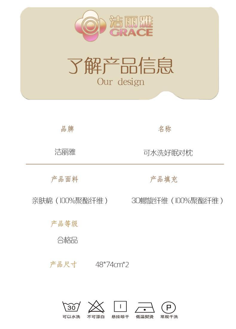 规格:48*74cm*2 面料:亲肤棉(聚酯纤维) 填充:3D螺旋纤维(聚酯纤维) 执行标准:GB/T22796-2021 安全类别:GB18401-2010 B类 1.柔软舒适,优选亲肤棉面料,良好的呵护颈椎,舒适的睡眠时光。面料透气网眼,不闷热,稀释透气。惊喜绗缝,优质绗缝工艺,不抛料,品质保障。 2.枕头高弹力,贴合人体脊椎生长曲度,仰睡侧睡都可以,给您更好的承托力。