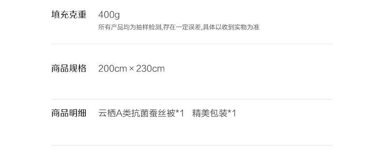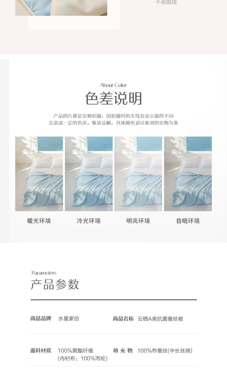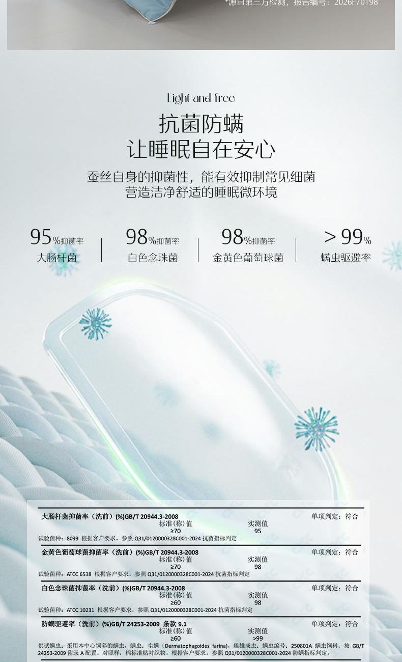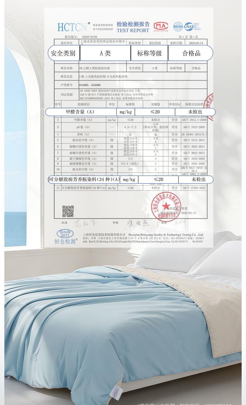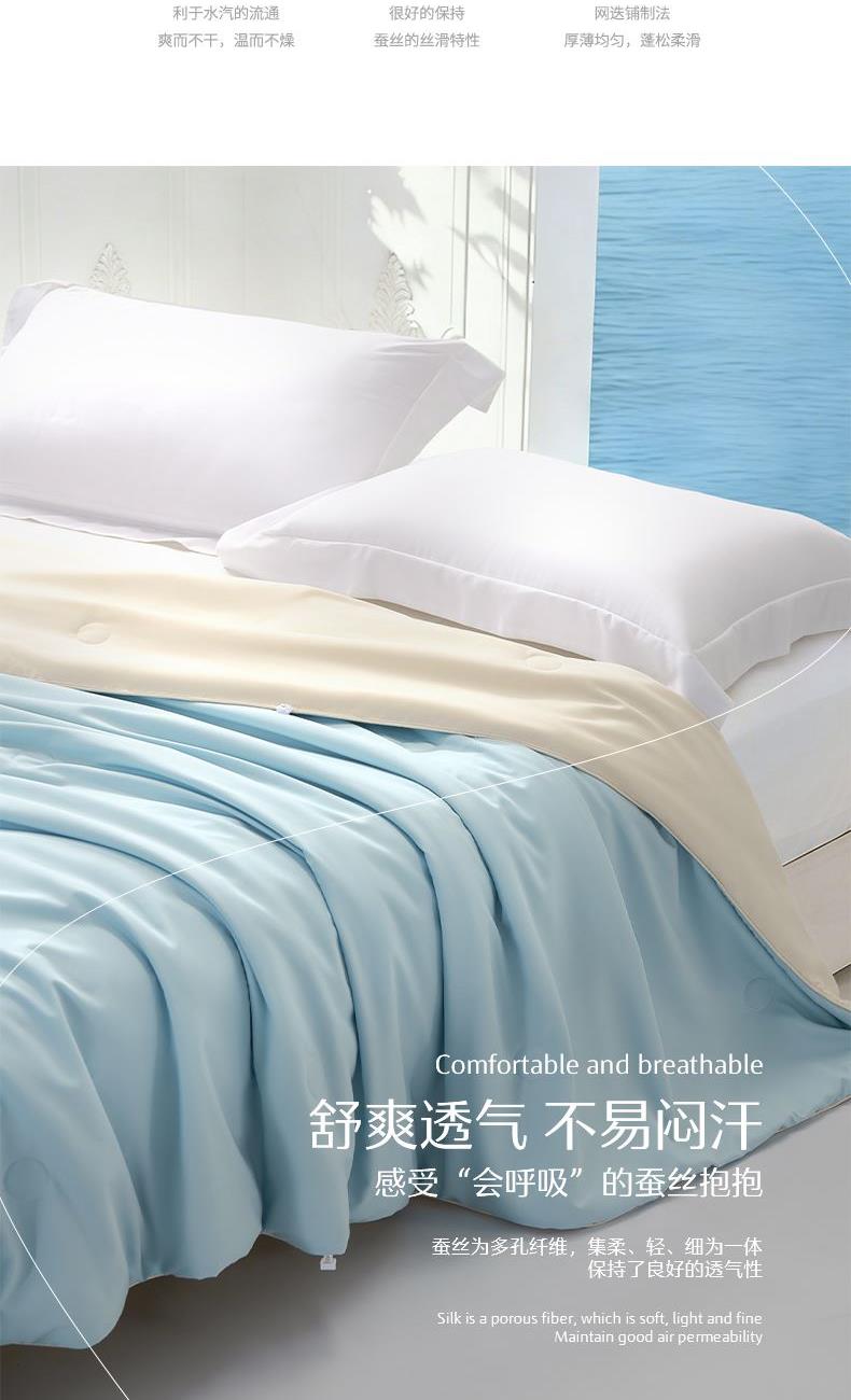 1.【A类安全标准】 A类安全标准,守护睡眠健康。 2.【柞蚕丝填充,自然有机,健康舒适】 柞蚕丝填充,轻盈透气、调温保暖。 3.【品质面料,柔软透气更亲肤】 高品质面料,触感柔软细腻,亲肤透气 4.【水星防螨科技,抑制细菌螨虫,健康舒适】 水星科技防螨,守护睡眠健康。
