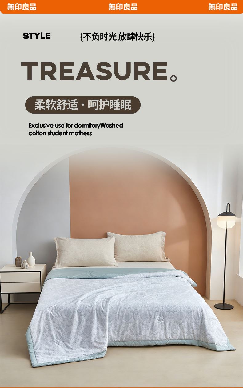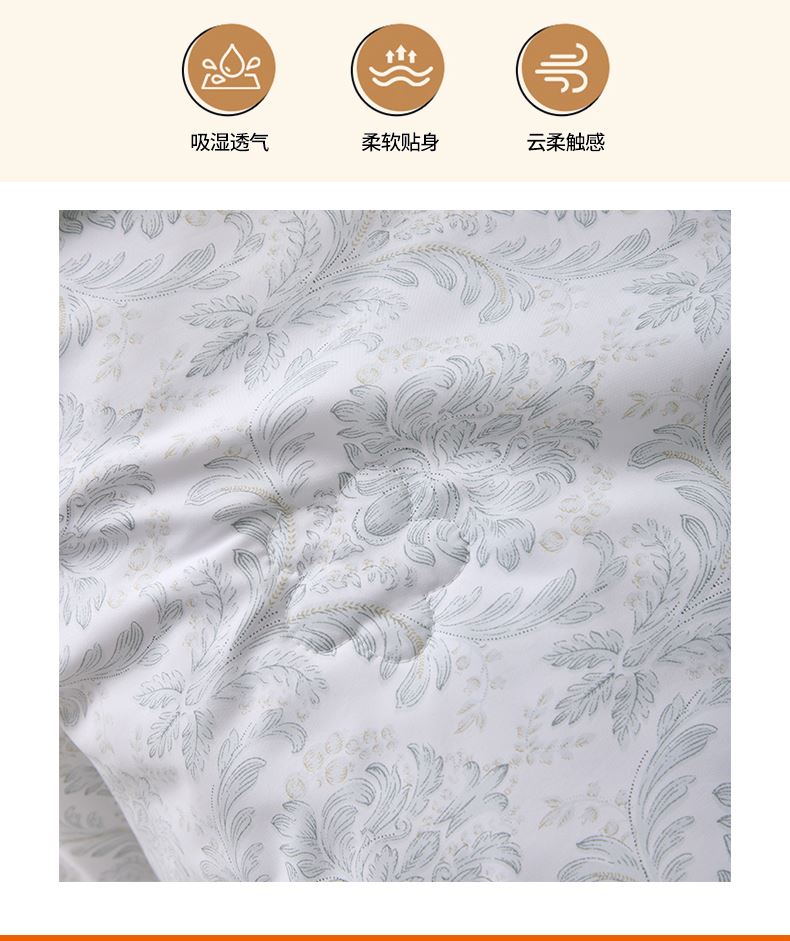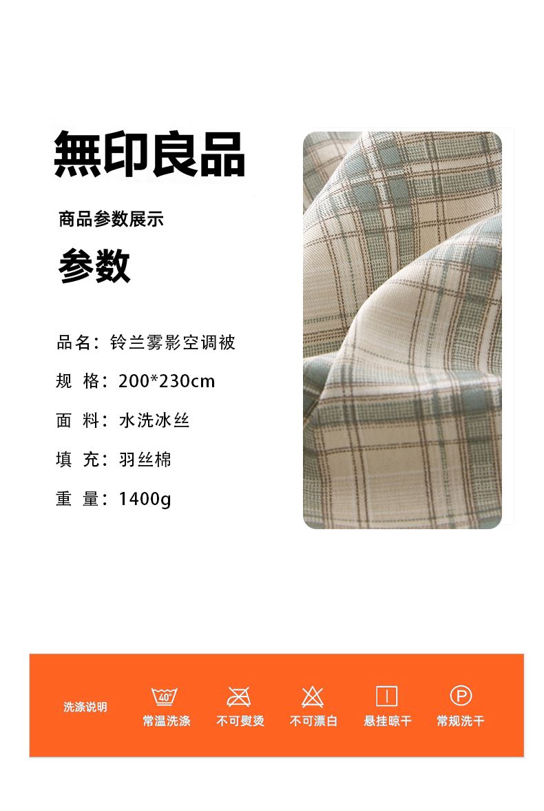 规格:200*230cm 面料:水洗冰丝 填充:羽丝棉 克重:1400g 执行标准:GB/T22796-2021 安全类别:GB18401-2010 B类 1.严选高密水洗冰丝为原材料,搭配凉感因子,纤维柔软蓬松,织物贴身舒适; 2.填充物选用优质A类整张羽丝棉纤维手感犹如羽绒般,轻盈蓬松,柔软舒适 3.采用单边暗合缝制,定点绗缝工艺,日式简约设计风格,简约时尚,让您感受科技生态睡眠!
