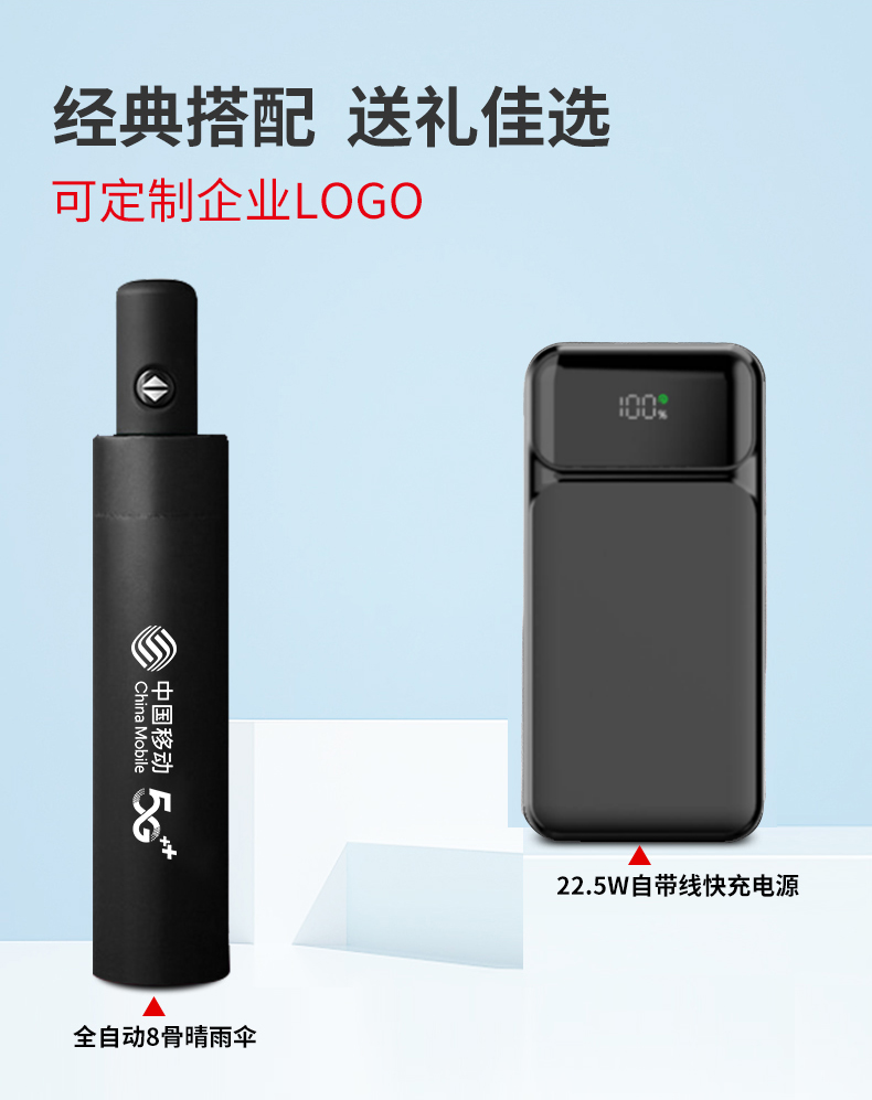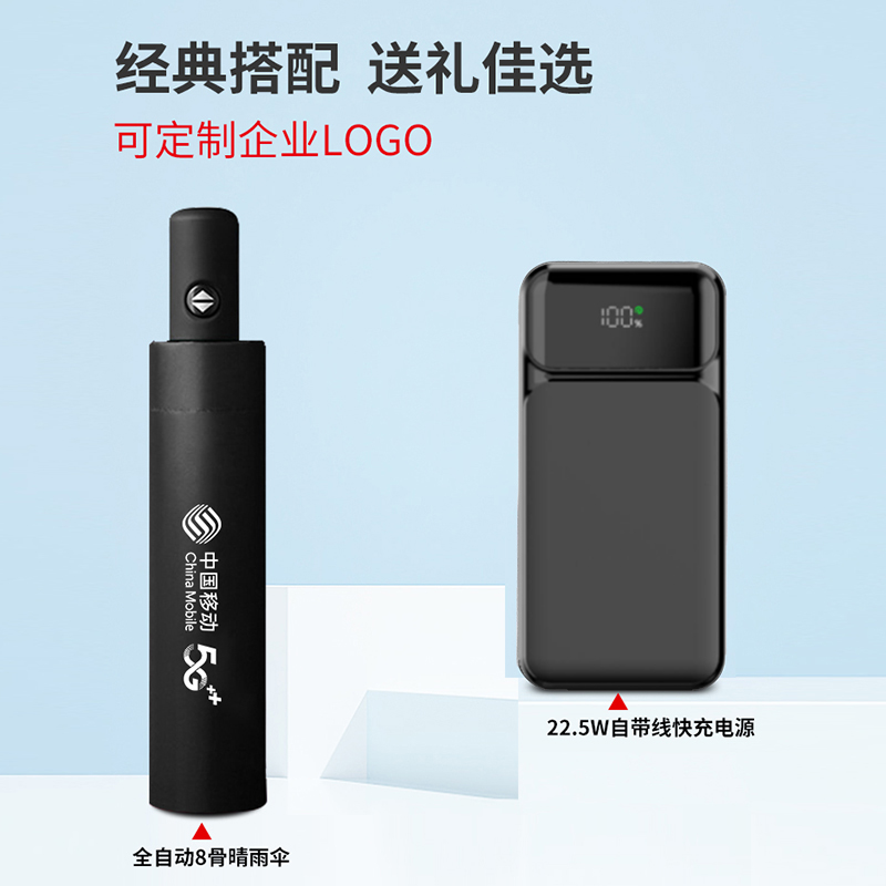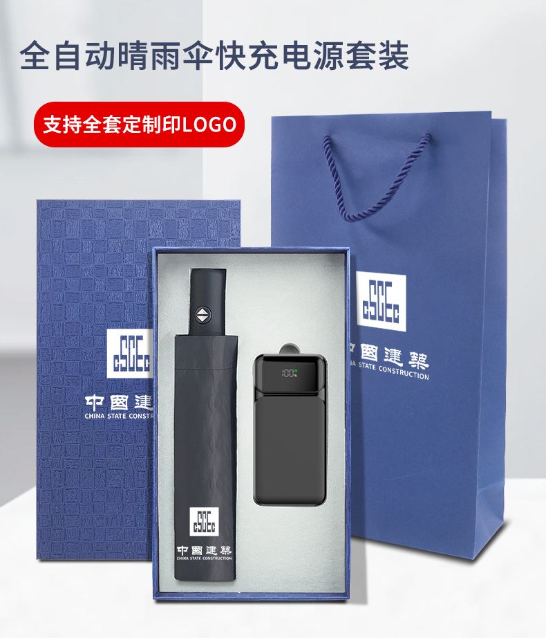 礼盒配置 : 1、22.5W超级快充10000mAh自带线移动电源 2、全自动8骨三折伞 尺寸:280*56mm 3、包装盒尺寸:182x326x75mm 4、手提袋尺寸:192x346x85mm 5、颜色:黑色 6、重量:28kg/箱