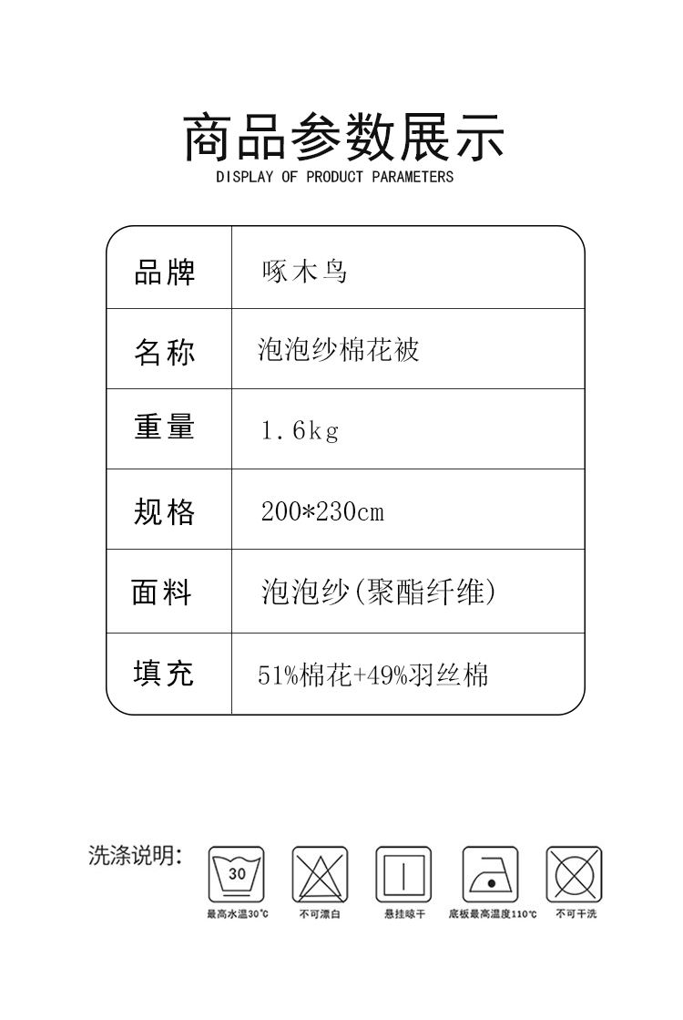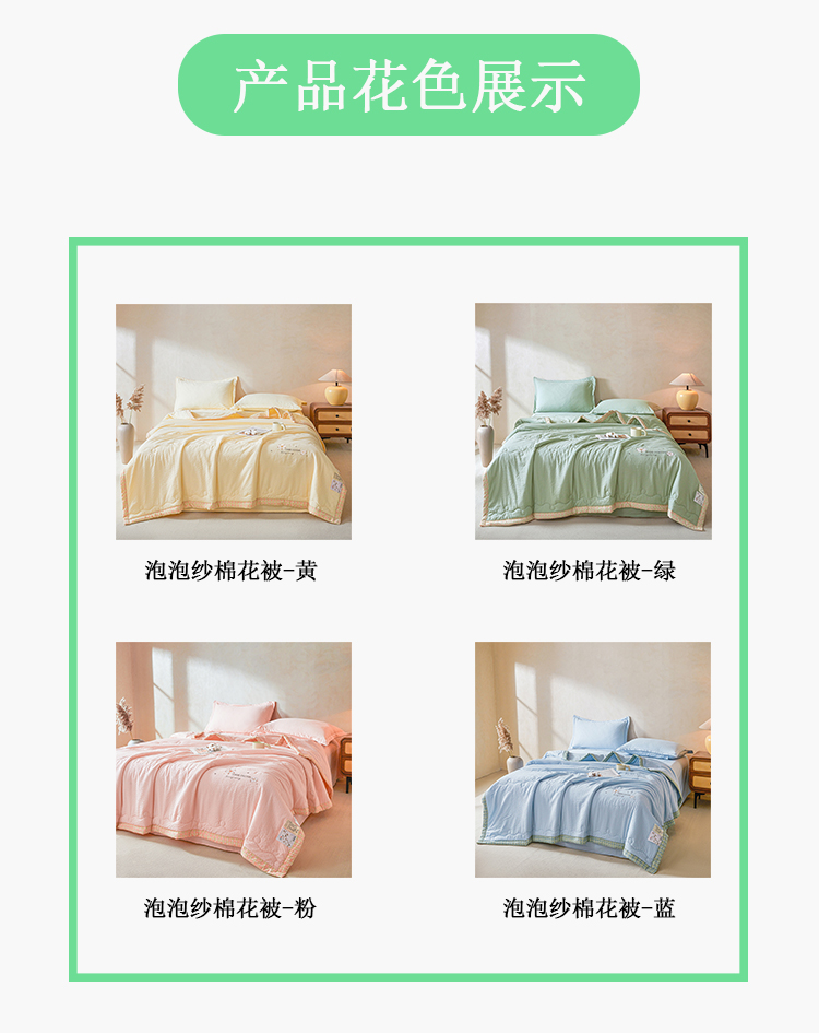 规格:200*230cm 面料:泡泡纱(聚酯纤维) 填充:51%棉花+49%羽丝棉 重量:1.5kg 卖点: 1、棉花填充,睡得安心,轻薄不压身,裸睡也舒服 2、水洗绵面料,软糯亲肤不扎身,透气不闷汗,夏天盖着超清爽。 3、简约耐看,夏天卧室必备