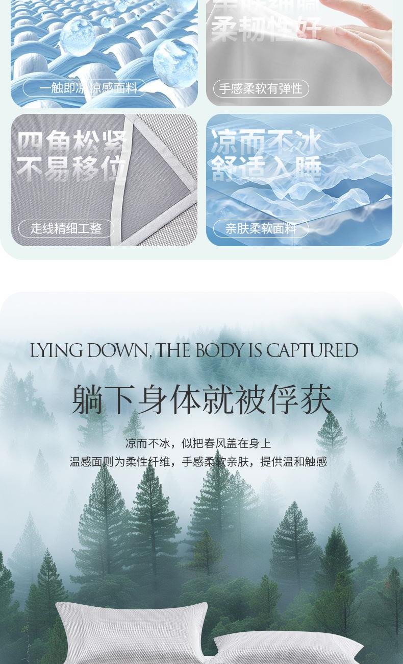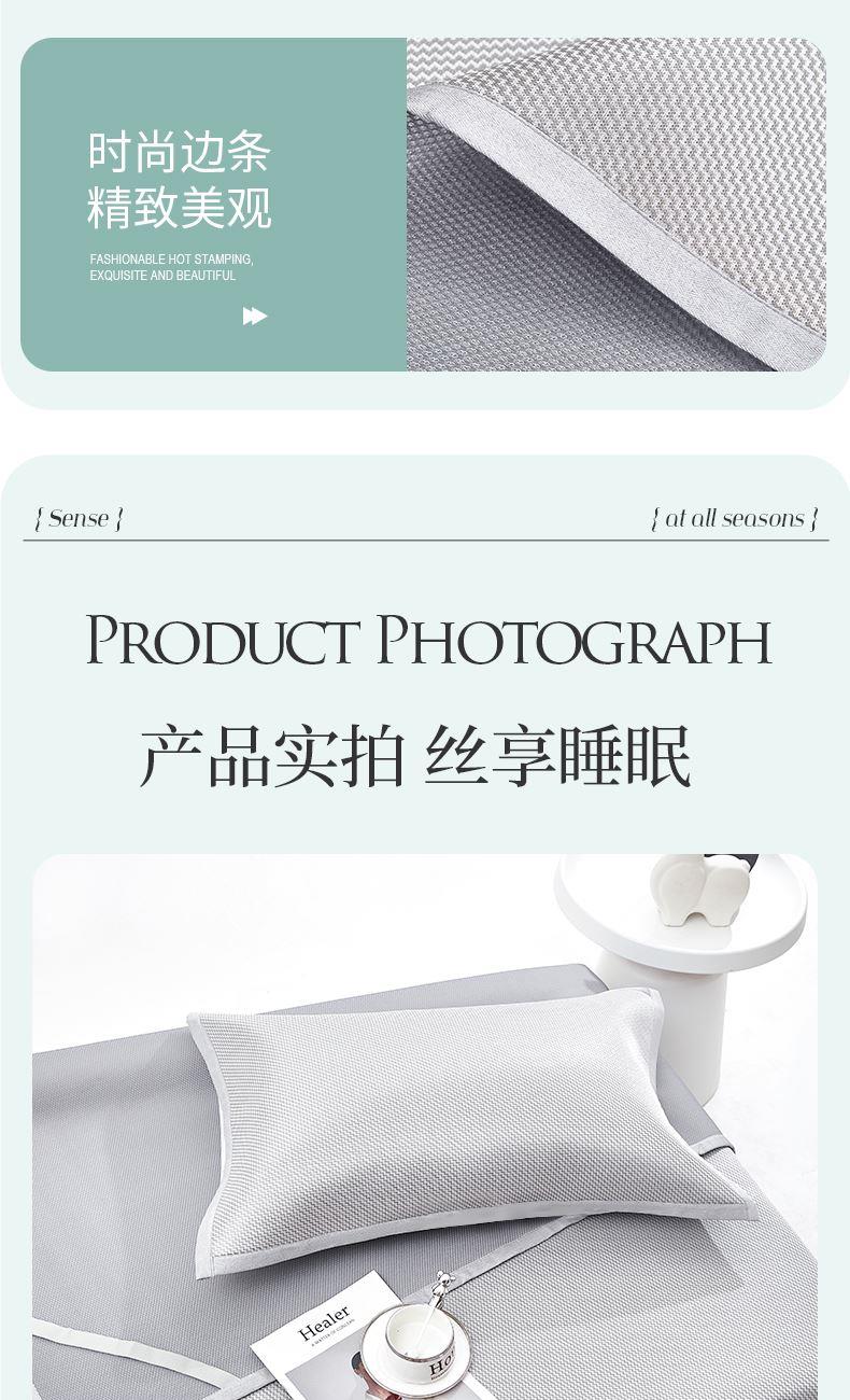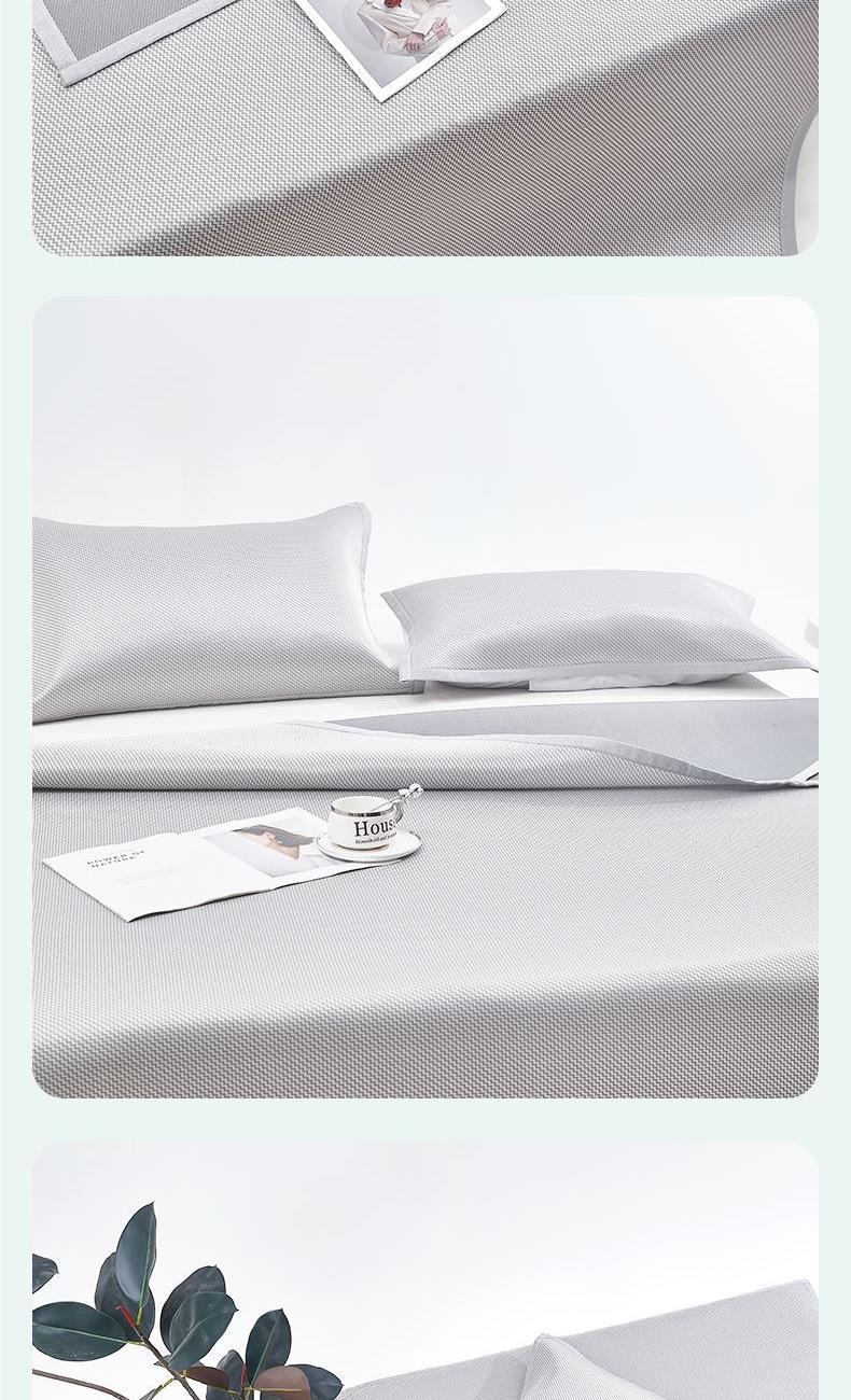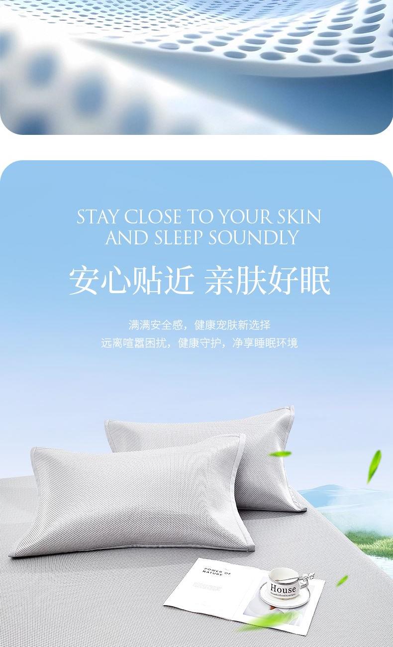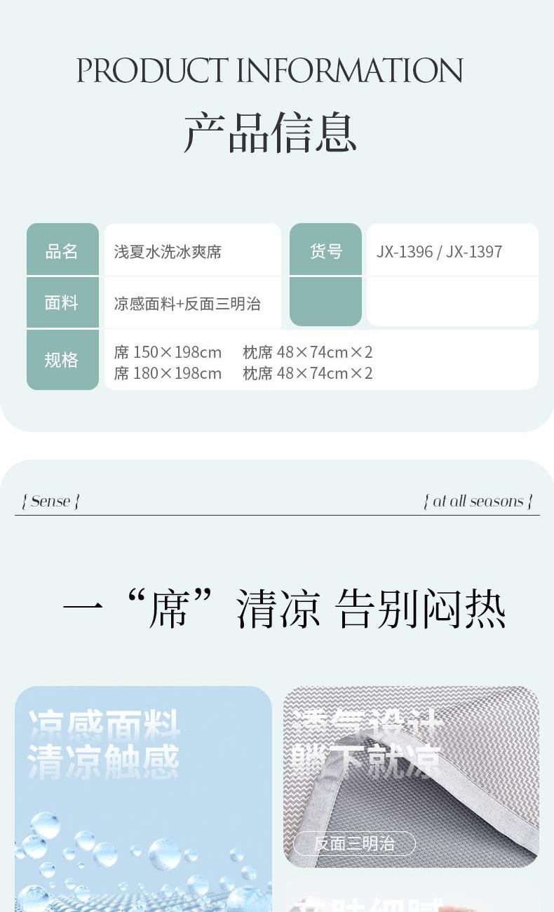 货 号:JX-1397 规 格:席180×198cm (1.8米) 枕席48×74cm×2 材 质:凉感面料+反面三明治 反面三明治设计,丝滑舒适 凉感面料为中空结构,细腻柔滑的触感,干爽透气,吸汗吸湿,凉而不冰,瞬间赶走疲惫、新一代降温放热材质,从而给予很好的热传导性,能增加皮肤的冷感,轻松可水洗。