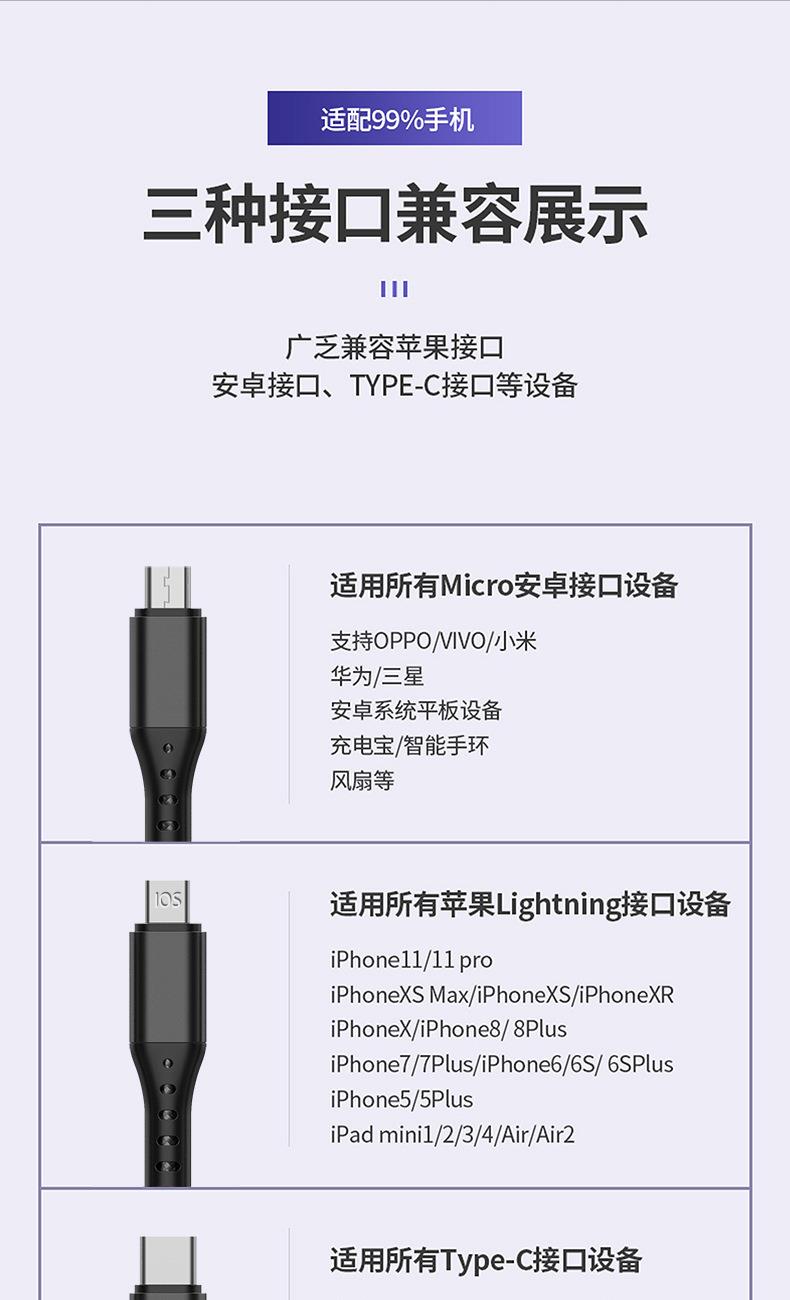 克 重: 45g 线 长:1.2 米 材 质:PVC 铝合金 输 出:5A 接口:micro/TYPE-C/苹果 协 议:SCP QC3.0 铜丝:30*2+10*2 0.1复合铜 颜 色:红色/灰色 type-C支持快充100W 尼龙编织材质、耐拉耐折,易收纳,携带方便 适用范围:适用于市面上所有常见手机