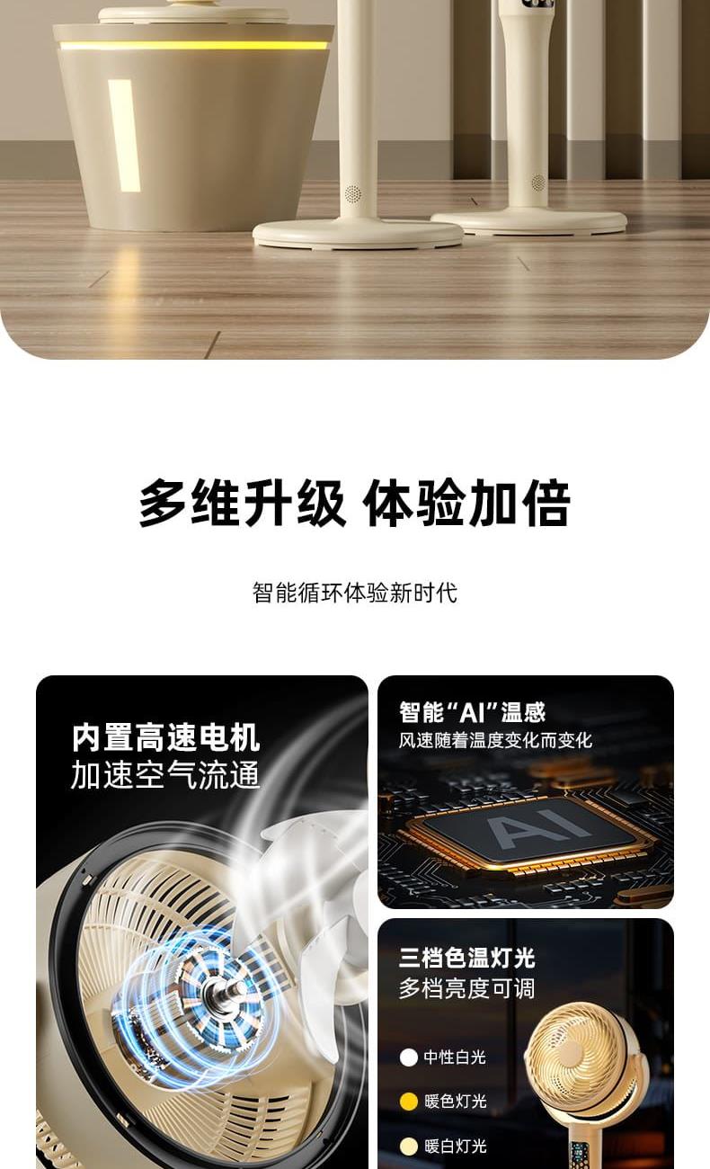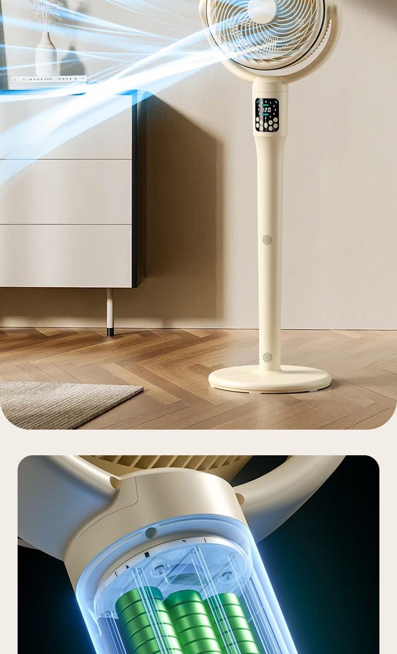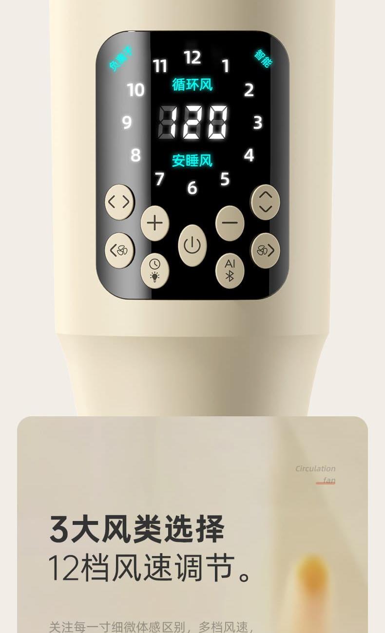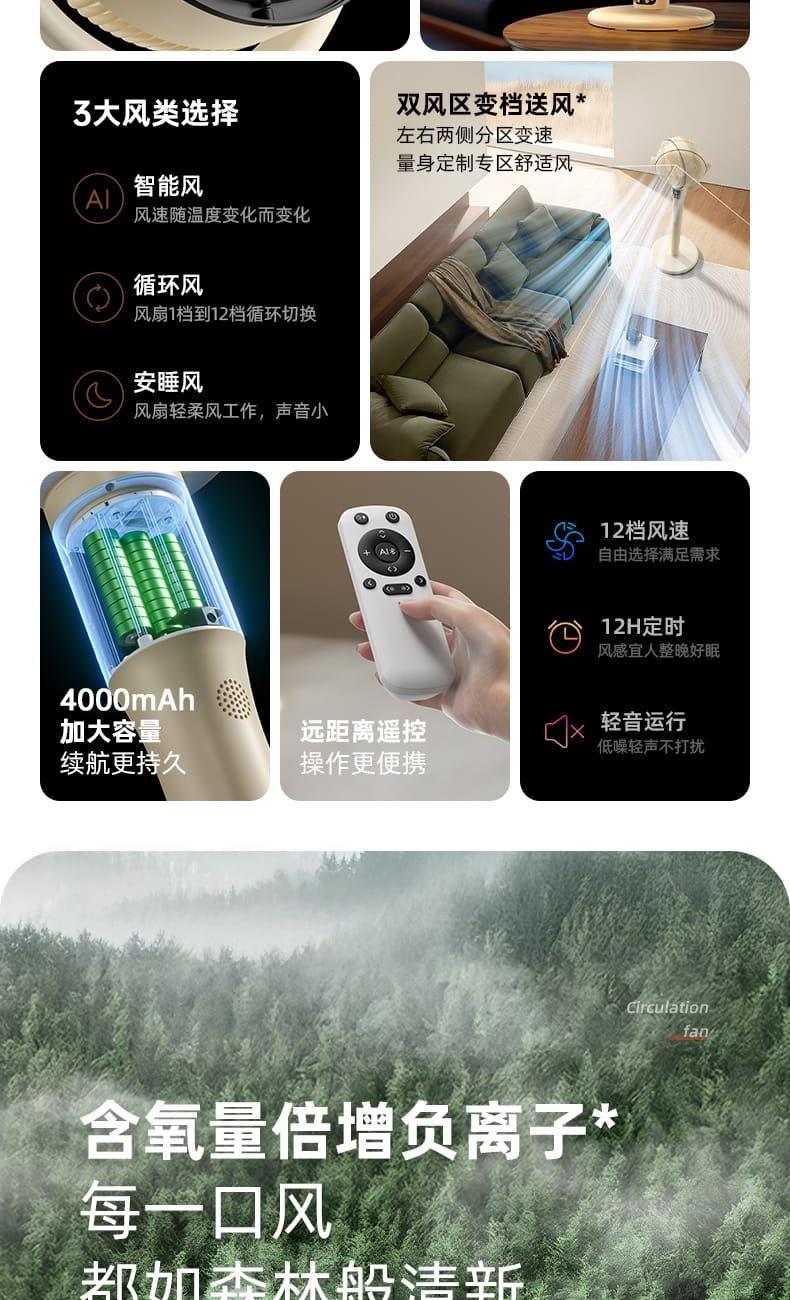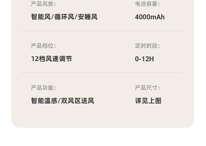 电池容量:4000mAh 产品尺寸:103*34*29cm 包装尺寸:43*33*19cm 外箱尺寸:67.5*45*59cm/6pcs 产品重量:2600g 整箱重量:18kg 产品颜色:白色、卡其色 4000mAh大电池,带负离子净化 智能AI温感,双风区变档送风 12档风速,3大风类,3档夜灯可调 上下左右自动摇头,3D循环送风 12小时定时,带远程遥控 3段高度可调,可桌面可落地使用