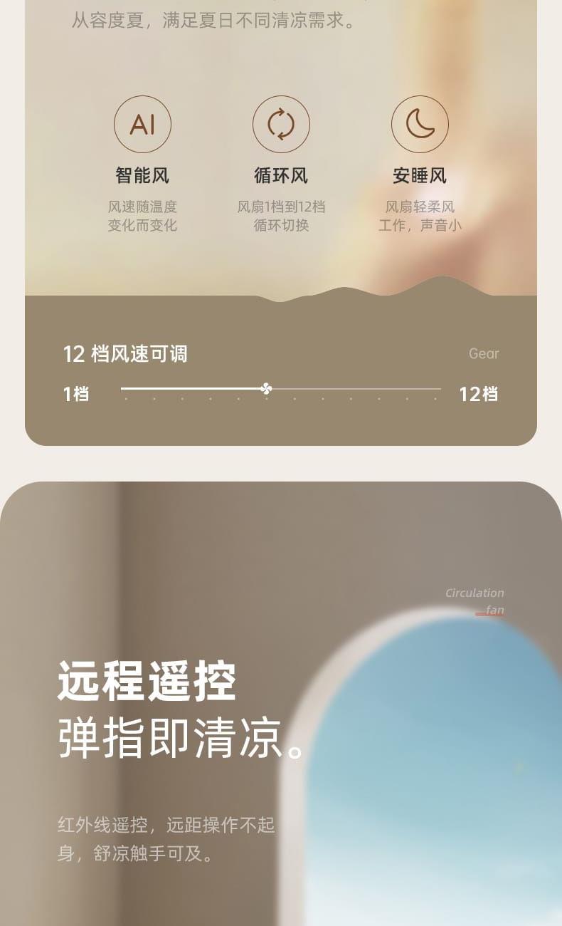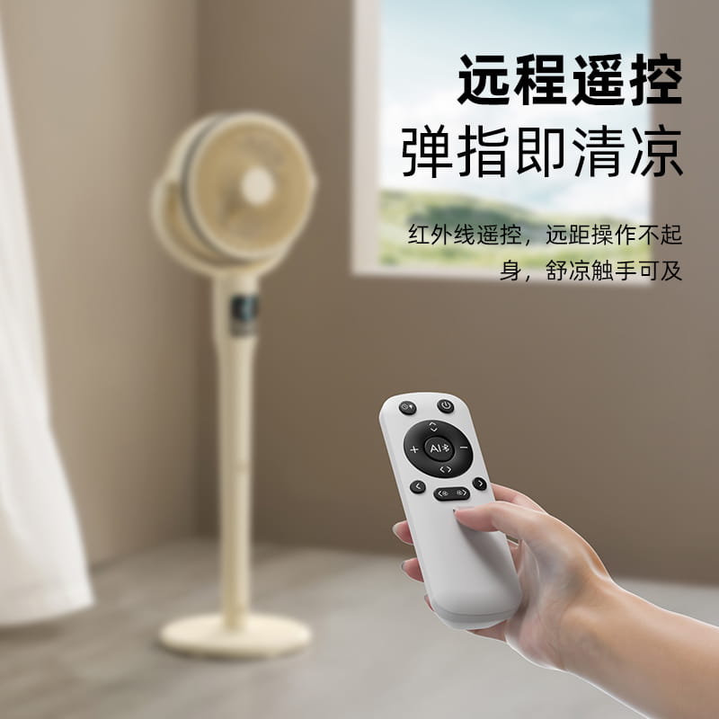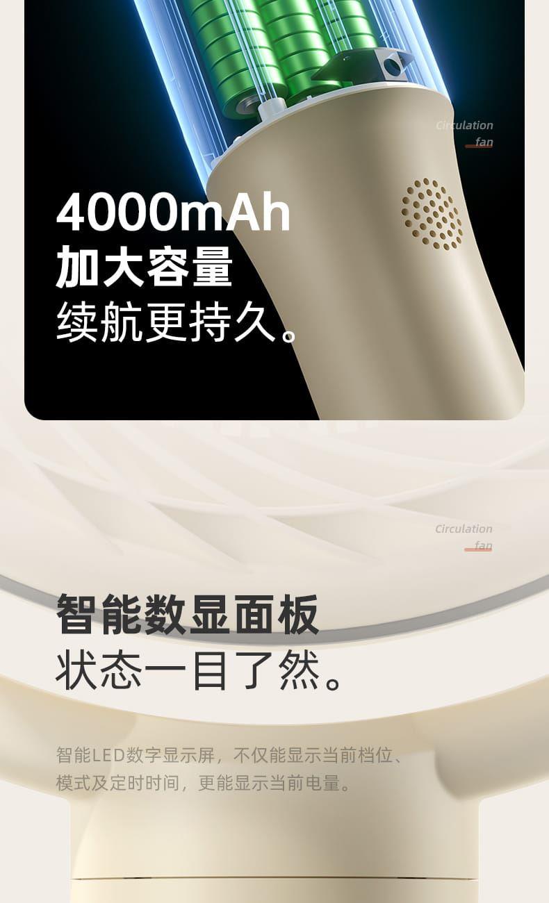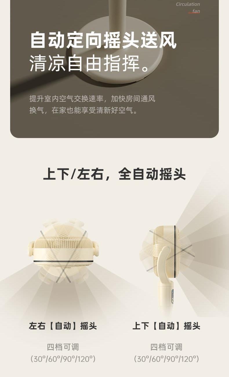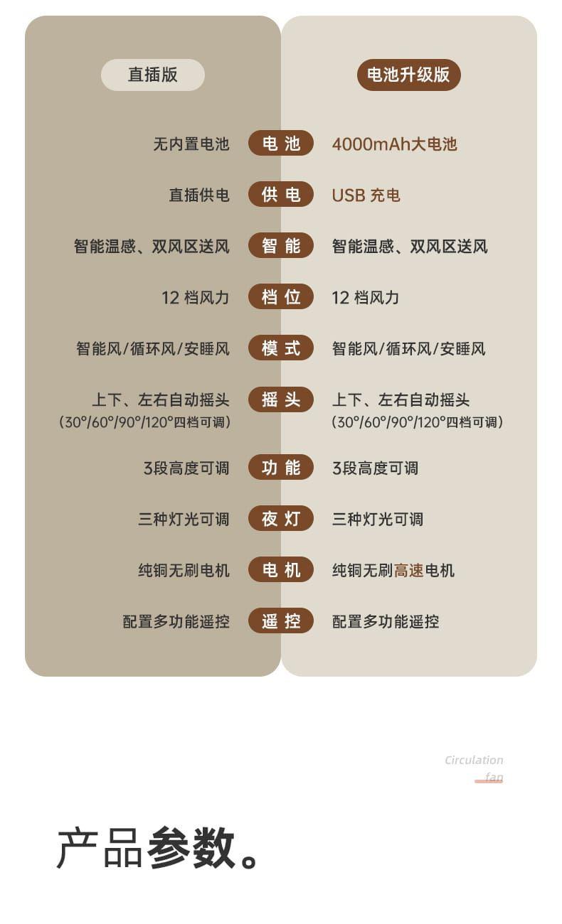 电池容量:4000mAh 产品尺寸:103*34*29cm 包装尺寸:43*33*19cm 外箱尺寸:67.5*45*59cm/6pcs 产品重量:2600g 整箱重量:18kg 产品颜色:白色、卡其色 4000mAh大电池,带负离子净化 智能AI温感,双风区变档送风 12档风速,3大风类,3档夜灯可调 上下左右自动摇头,3D循环送风 12小时定时,带远程遥控 3段高度可调,可桌面可落地使用