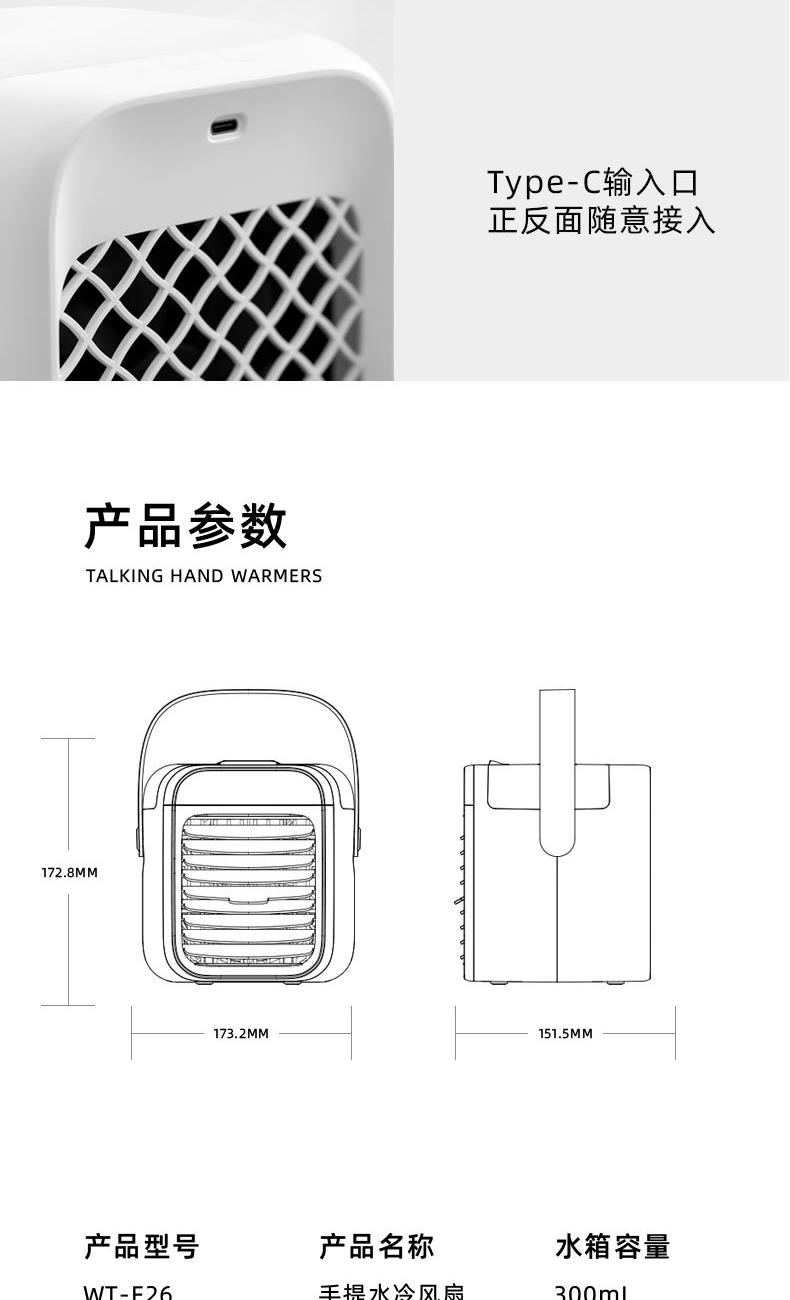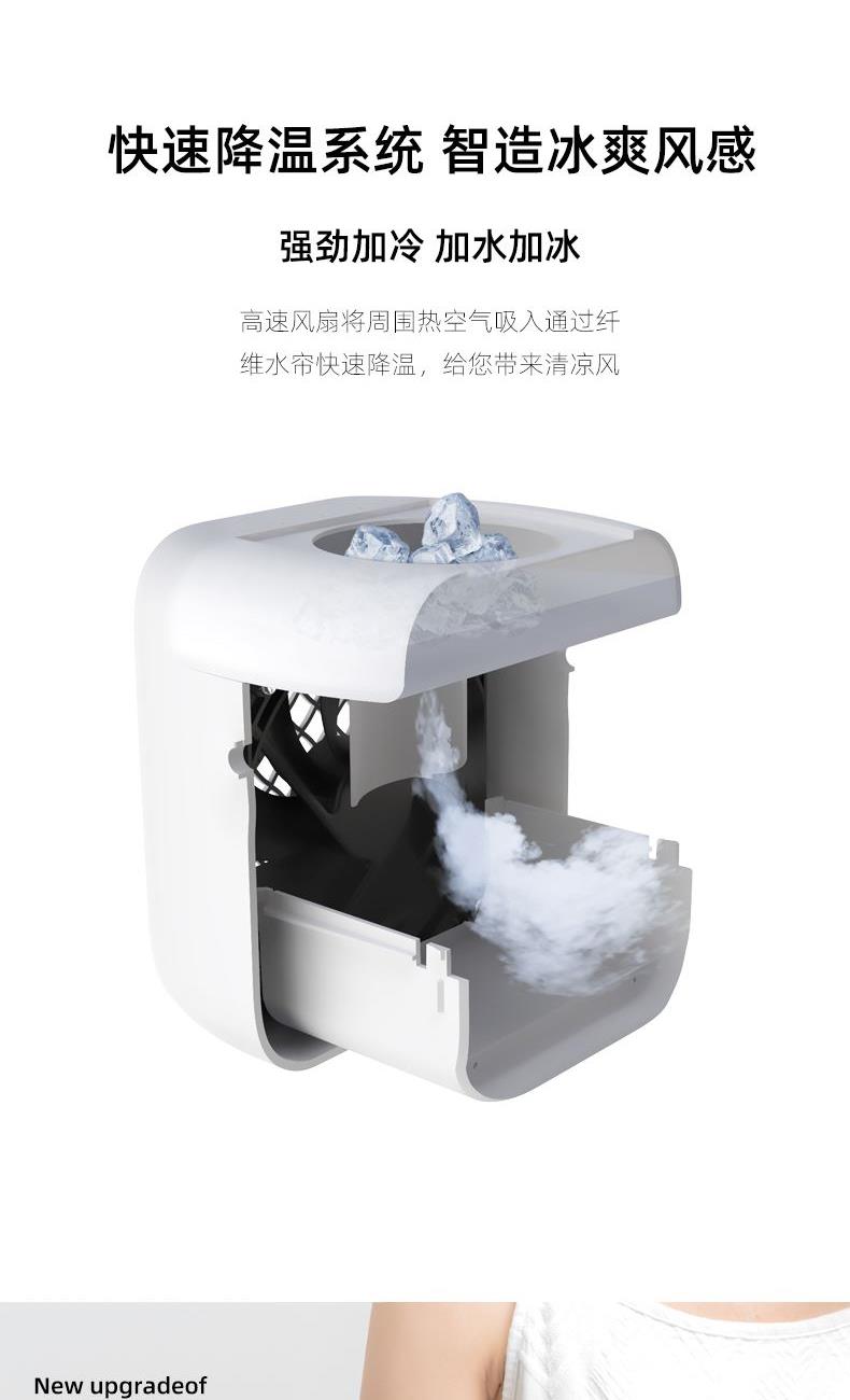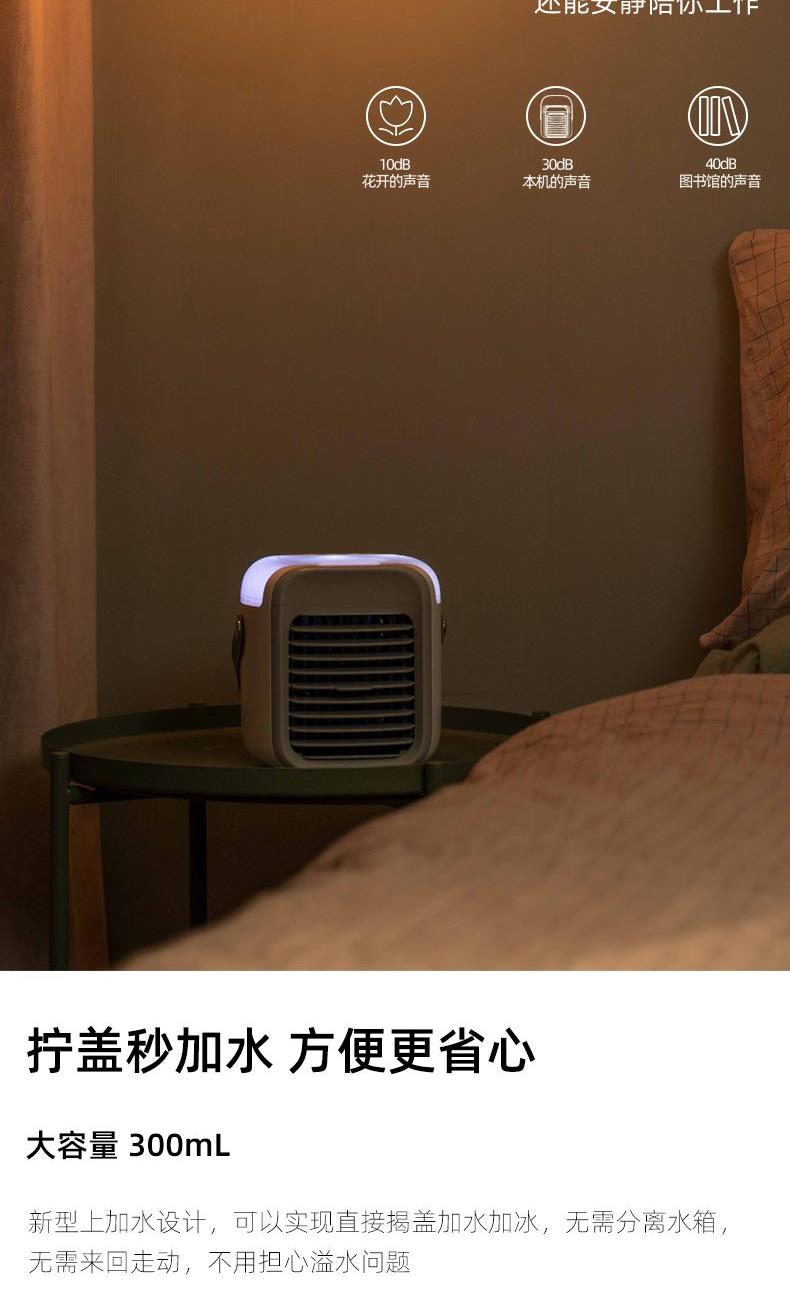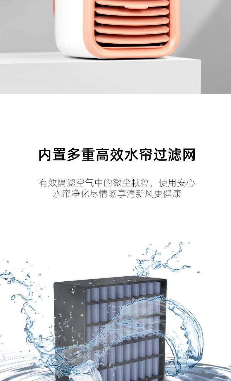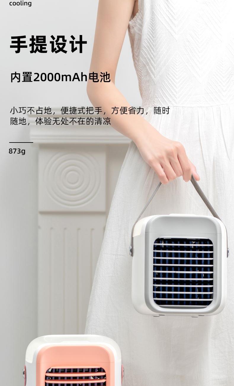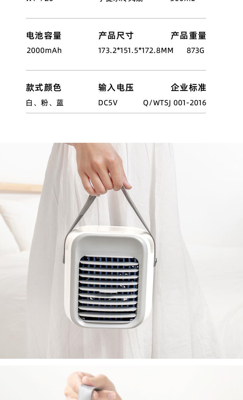 电池容量:2000mAh 款式颜色:粉 水箱容量:300mL 产品尺寸:173.2*151.5*172.8MM 产品重量:873G 输入电压:DC5V 即开即凉,快速制冷,水帘循环过滤出风,冷风更洁净 加水加冰即用,一机 = 空调 + 风扇 + 加湿器 + 补水仪 多档位风速调控,满足不同清凉需求 低噪静音运行,安静不扰人 内置 2000mAh 大电池,持久续航 小巧不占地,随身便携,静享清凉