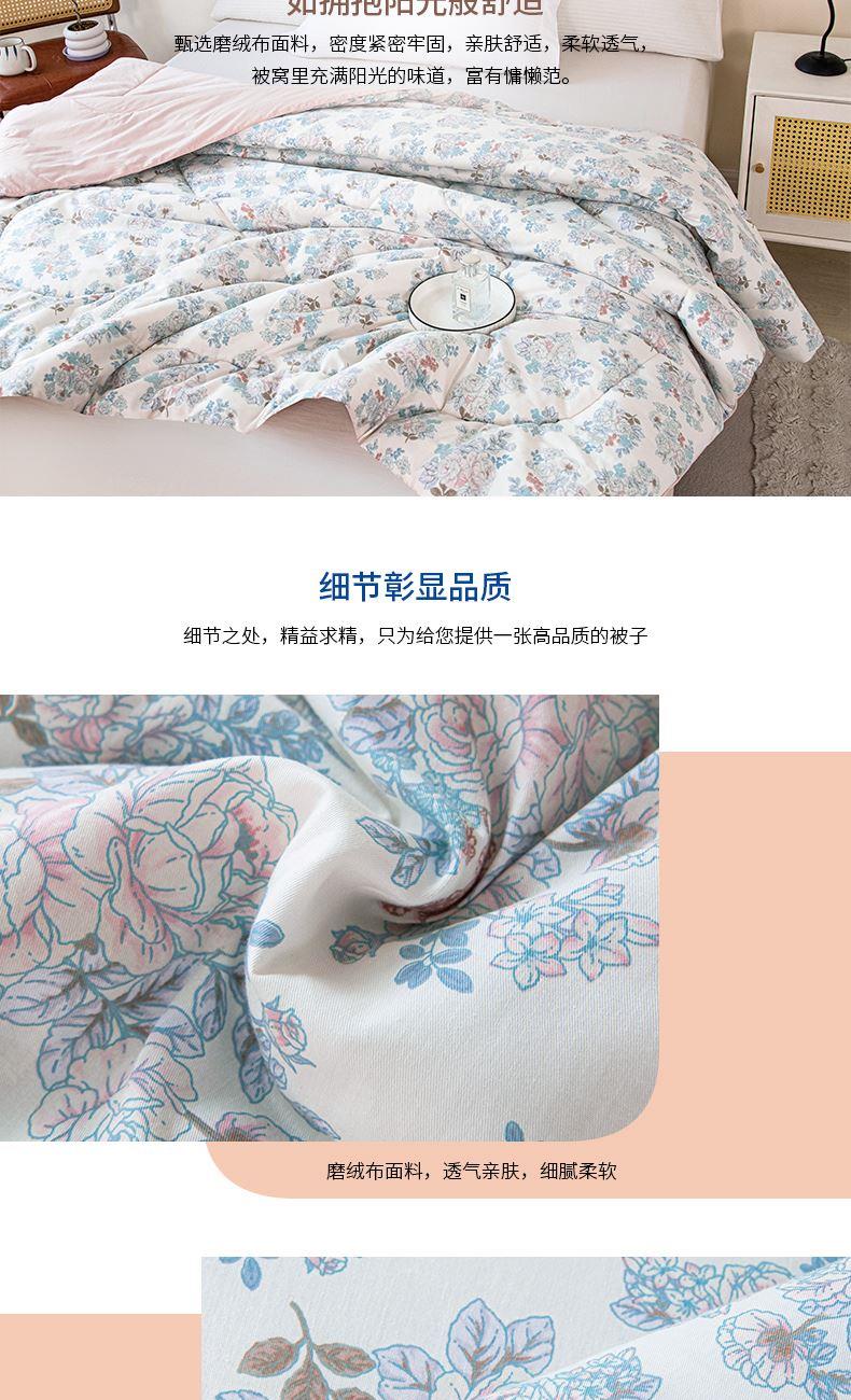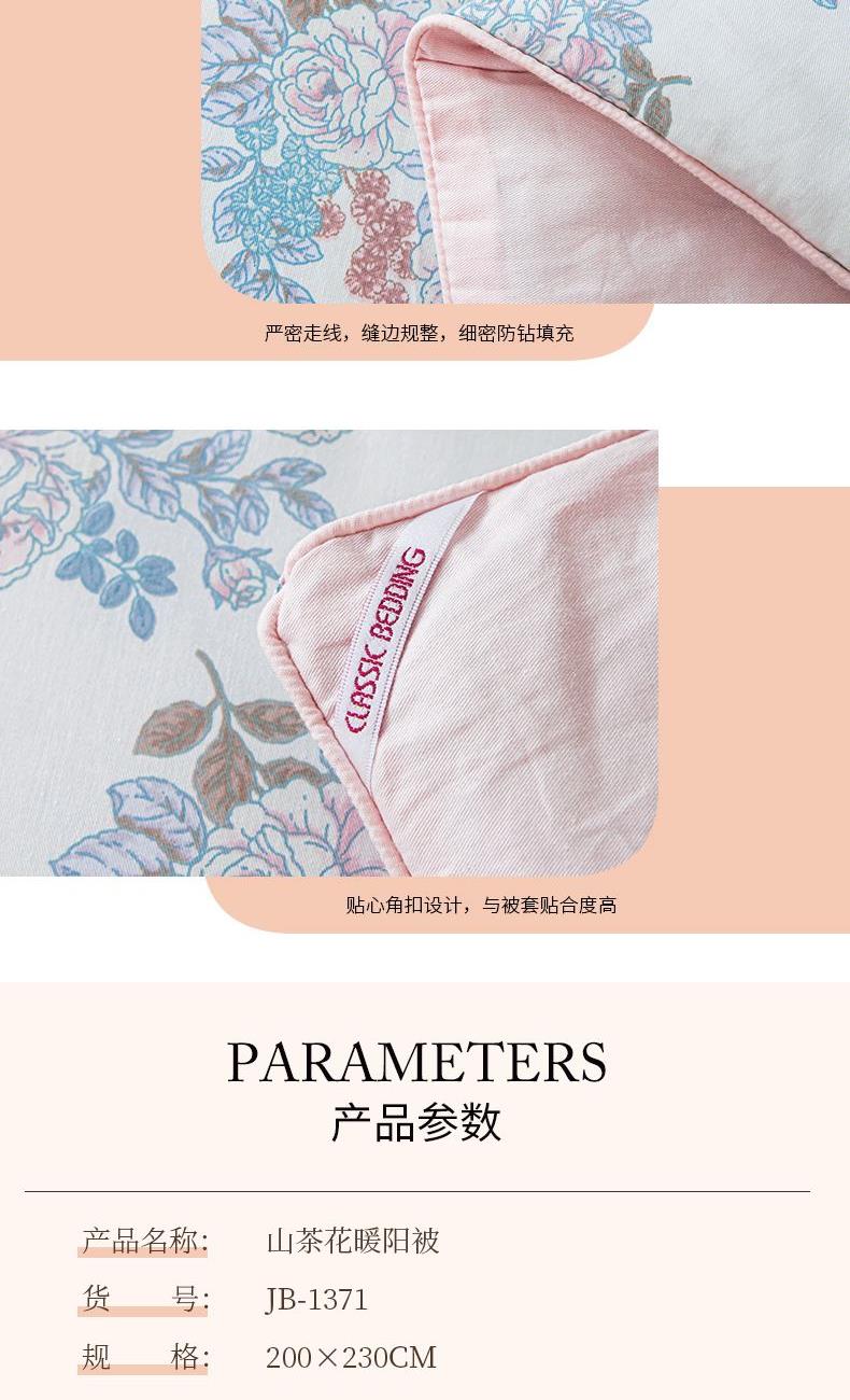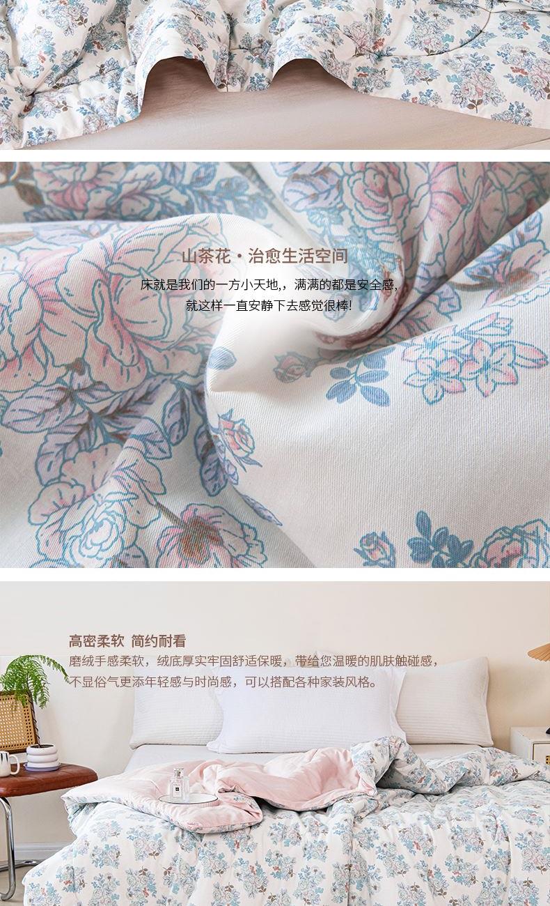规 格 : 200×230cm 面 料 : 磨绒布 填 充 : 超细旦纤维 克 重 : 2500G 甄选山茶花磨绒布面料,亲肤透气,柔软细腻的触感带来整夜舒爽睡眠的体验,保暖纤维使被芯内温度保持舒适,让被窝里充满阳光的味道,软糯宠爱肌肤睡起来更舒服