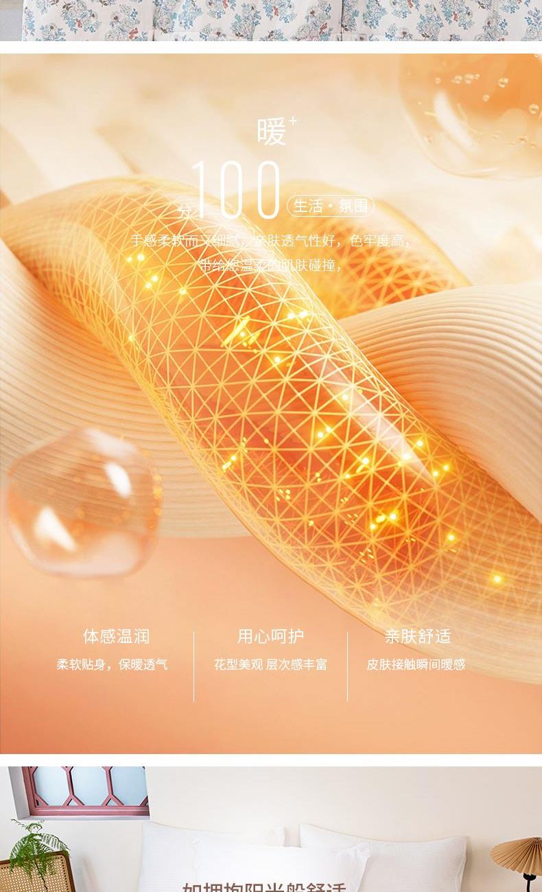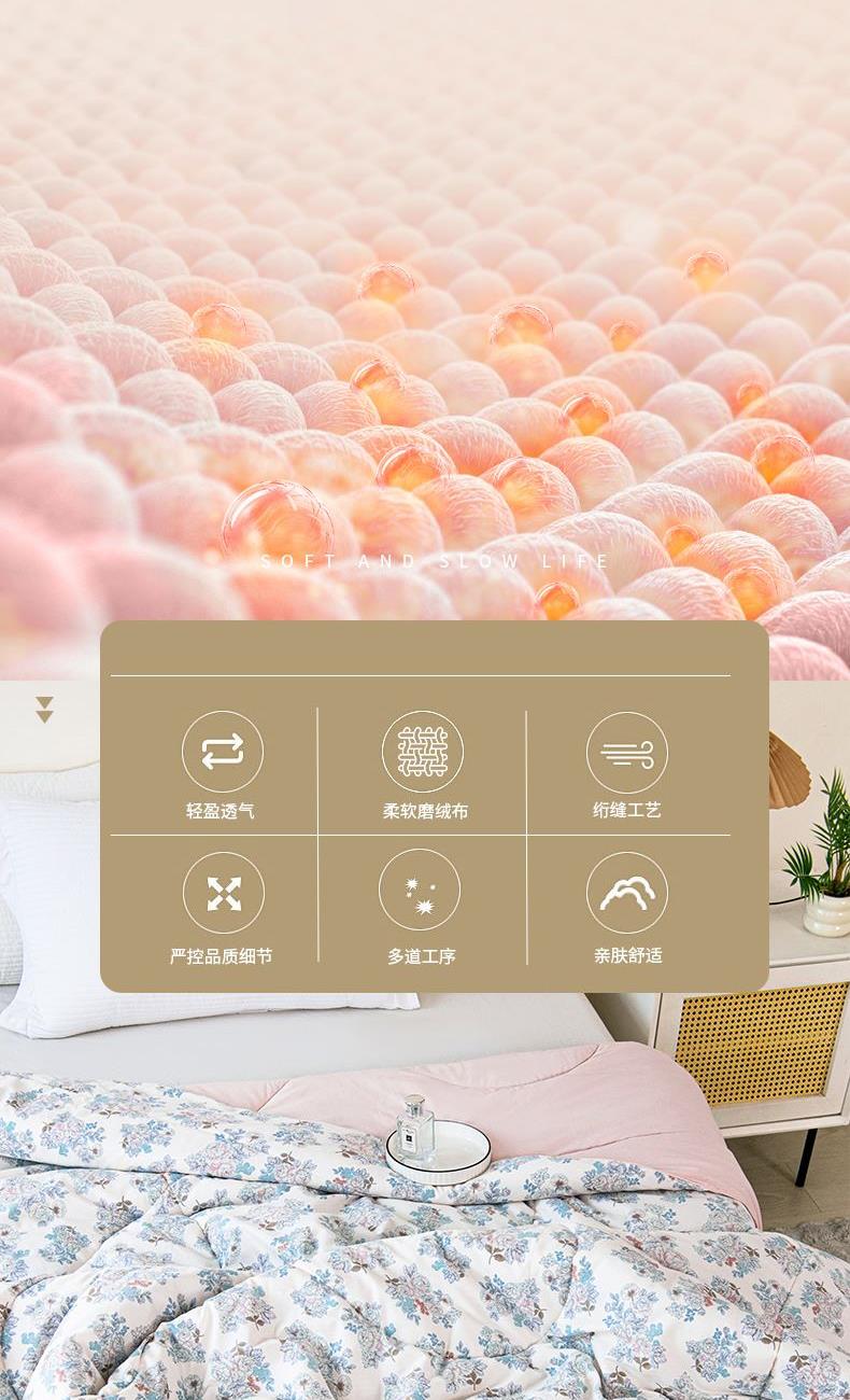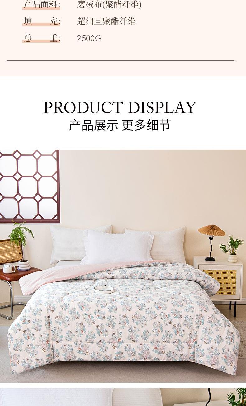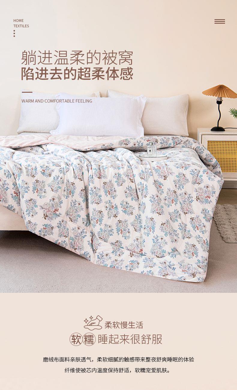 规 格 : 200×230cm 面 料 : 磨绒布 填 充 : 超细旦纤维 克 重 : 2500G 甄选山茶花磨绒布面料,亲肤透气,柔软细腻的触感带来整夜舒爽睡眠的体验,保暖纤维使被芯内温度保持舒适,让被窝里充满阳光的味道,软糯宠爱肌肤睡起来更舒服