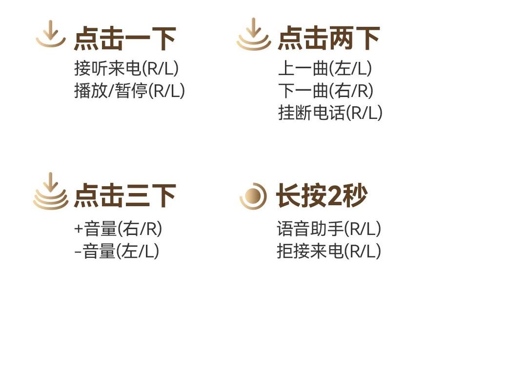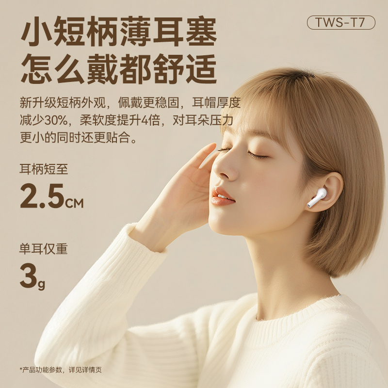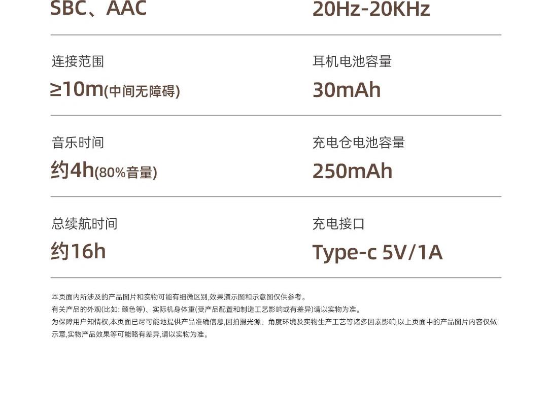 蓝牙版本 :V6.0 传输半径 :15米 电池容量 :30Ah 充电仓容量 :250mAh 蓄电次数 :约4次 待机时间 :约100H 使用时间 :约4H 使用时间 :约16H(配合充电仓使用) 充电时间 :约1.5H 颜色 :白色 产品尺寸 : 56.5mm*48mm*28mm 产品重量 :21g . 稳固入耳,狂甩不掉,户外运动新体验 · 品质降噪麦克风,HD高清通话,字句清晰 · 蓝牙6.0无线稳定连接,覆盖范围广,功耗低,兼容性强 · 开机配对,取出即连,回连无需多余操作 · 连接稳定不断线,高清视频低延迟 · 续航持久,连续通话/音乐时间满足日常使用频繁人群 · 生活防水,防雨防汗,可边运动边享受音乐 . 触控按键,激活语音助手/接听电话/音量调节/歌曲切换轻松操作 . 专为运动而生,人体工学适配耳廓
