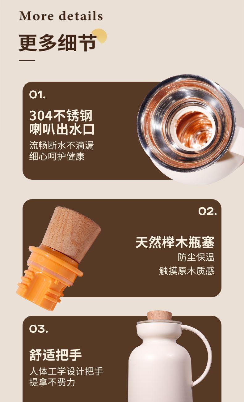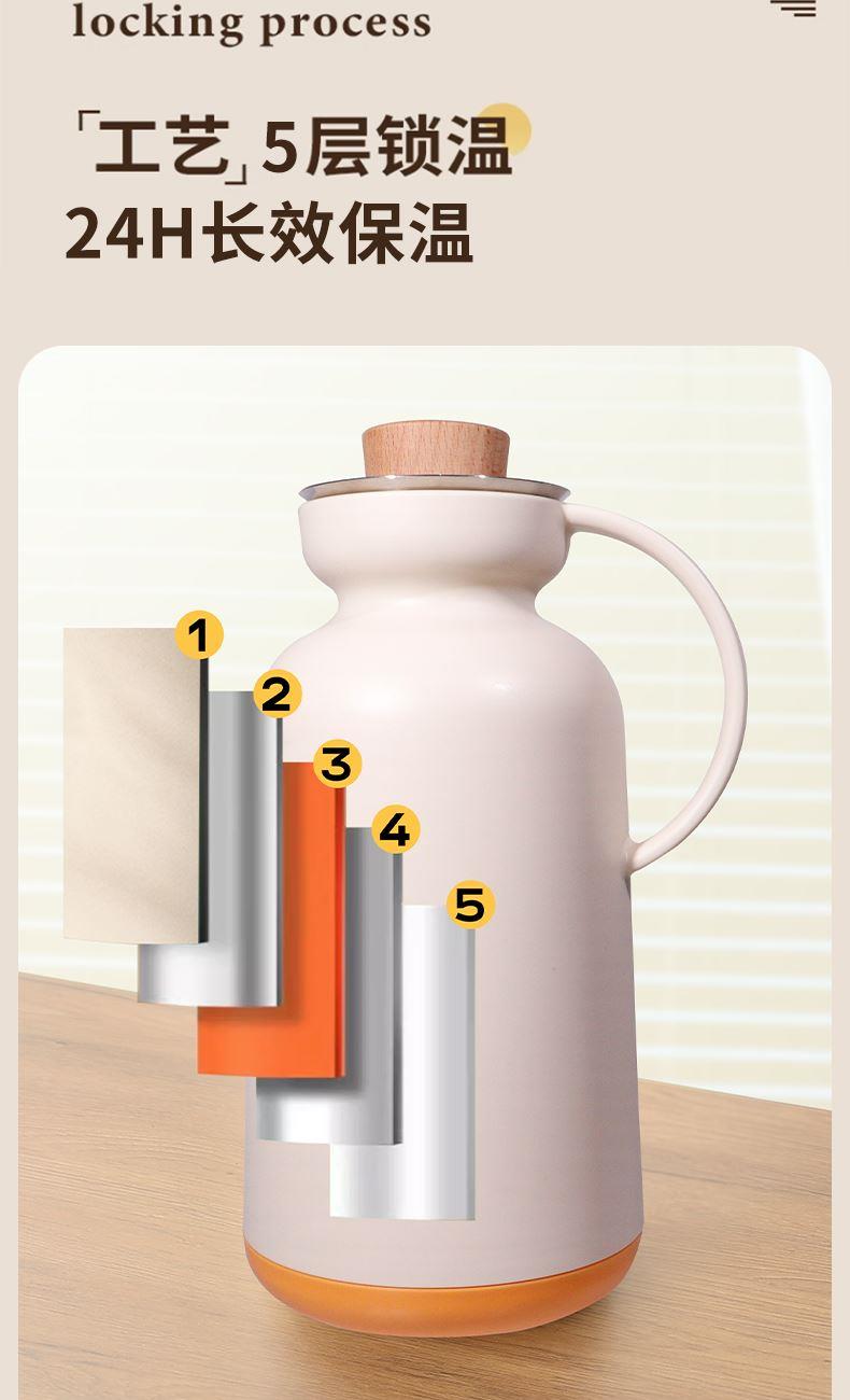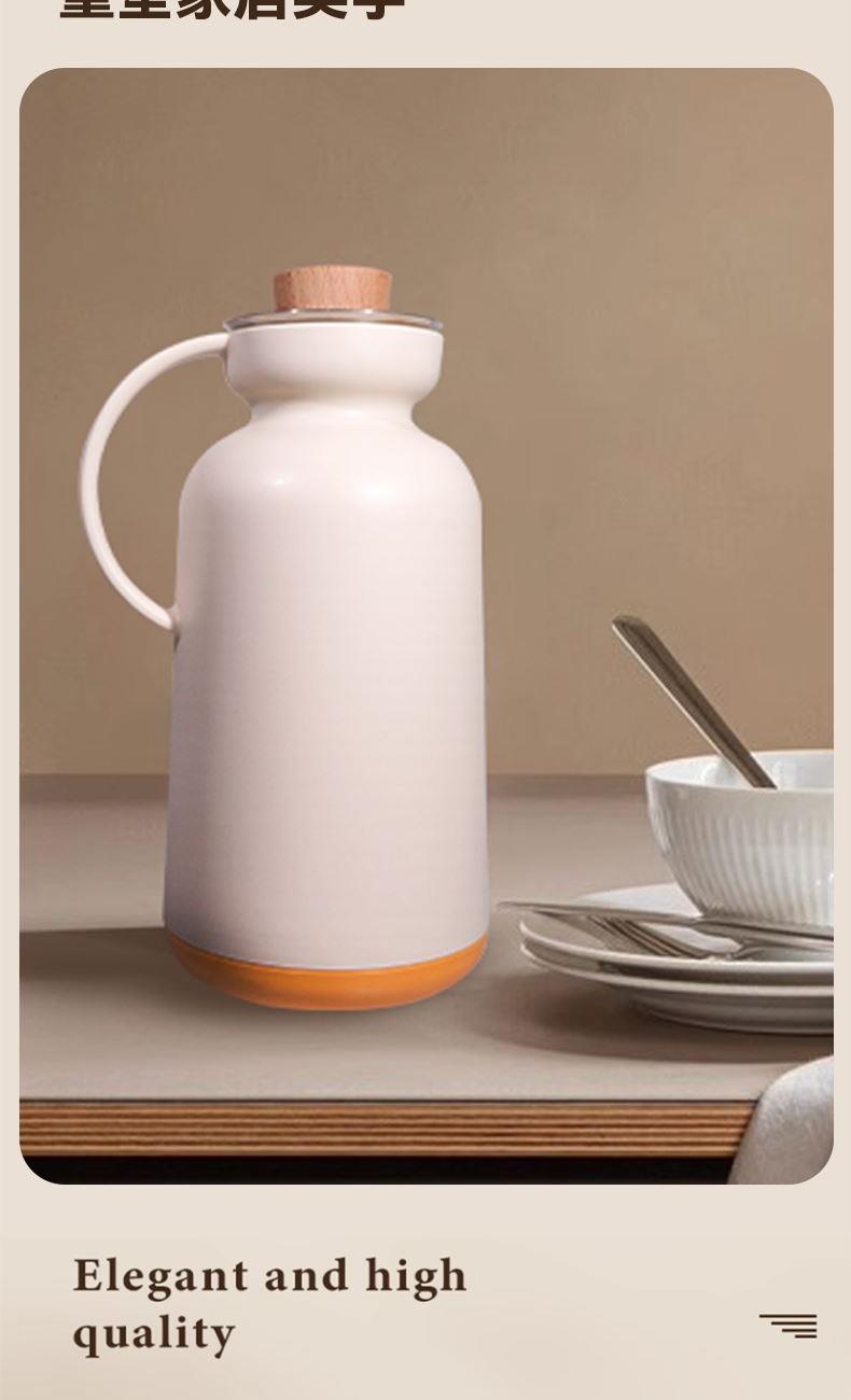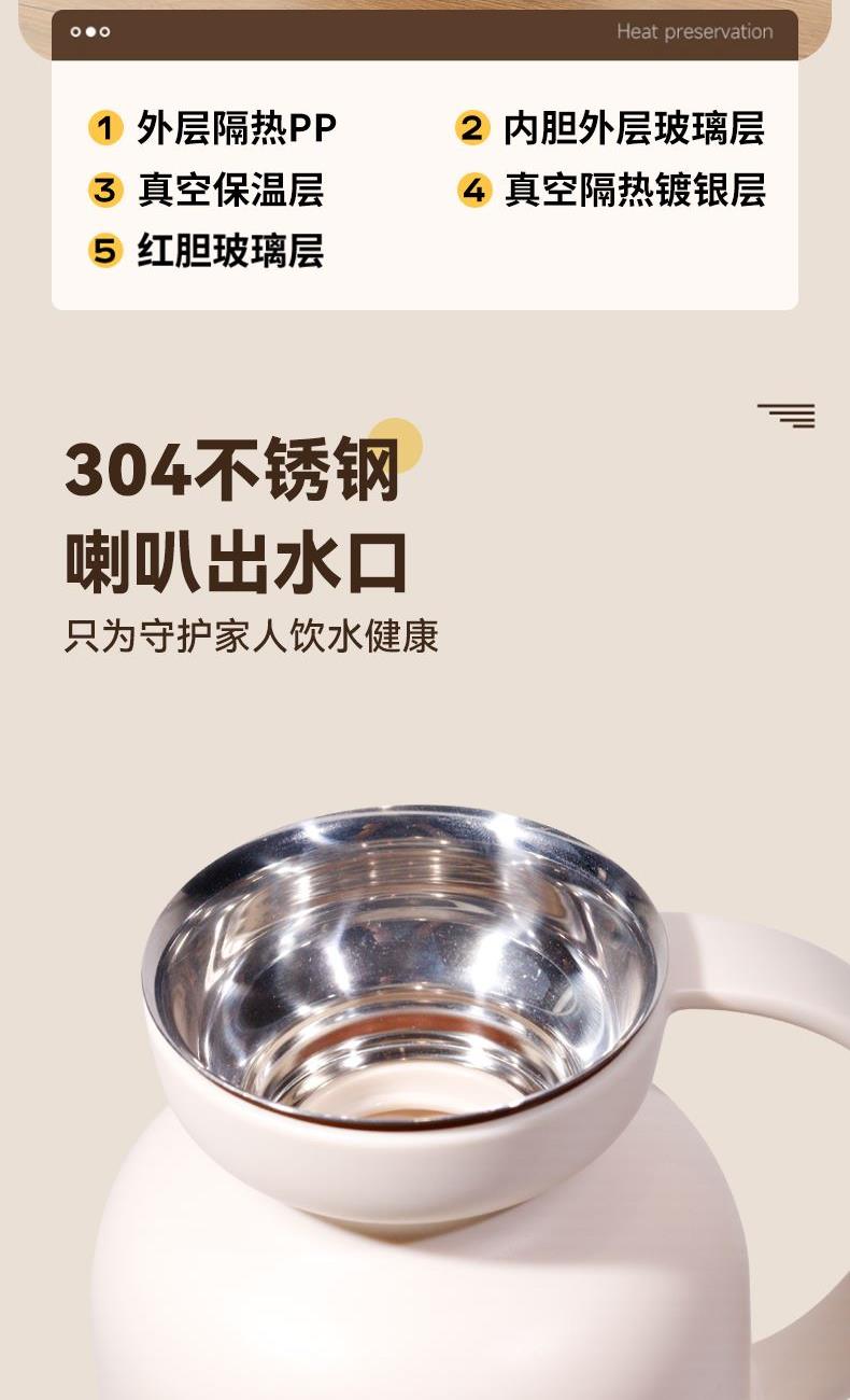 产品材质:PP+玻璃内胆 容 量:1000mL 净 重:0.648kg 彩盒尺寸:28.5x14x13cm 外箱尺寸:54.5x44x30cm 产品条码:6970070173000 执行标准:GB/T 11416-2002 北欧极简设计,融入生活日常、餐桌上的风景线,书房里的温暖陪伴 让每一次倾倒,都成为享受。 高硼硅红胆内壁耐高温(-5℃~120℃),锁住温度更锁住新鲜、晨起的热茶,母婴用水、深夜的暖饮,始终温热如初。 304不锈钢喇叭出水口、流畅断水不滴漏、天然榉木瓶塞、防尘保温,触摸原木质感。 PP外壳:防锈抗冲击,保护脆弱的玻璃内胆。 旋紧式壶盖,倾斜倒水时不易渗漏,适合车载、户外使用。 露营、旅行时保冷(冰水、冷饮、泡茶)或保温(热咖啡、汤粥),轻量化设计便于携带。