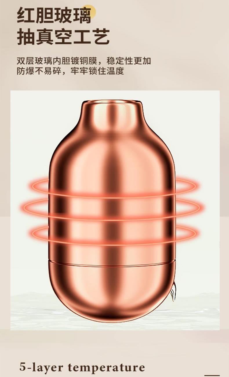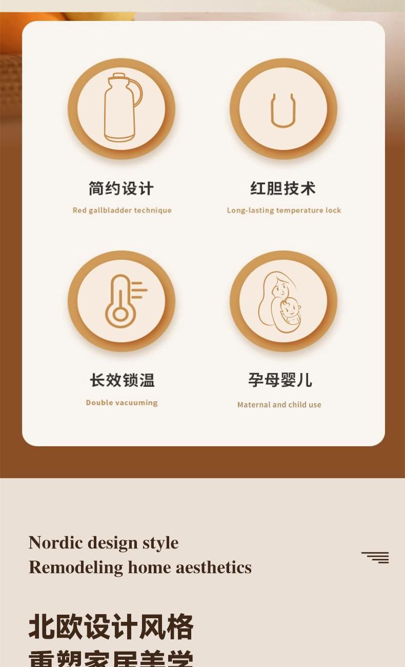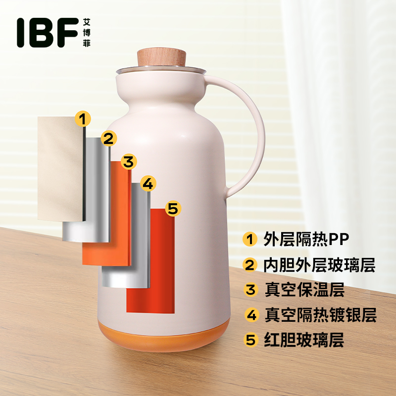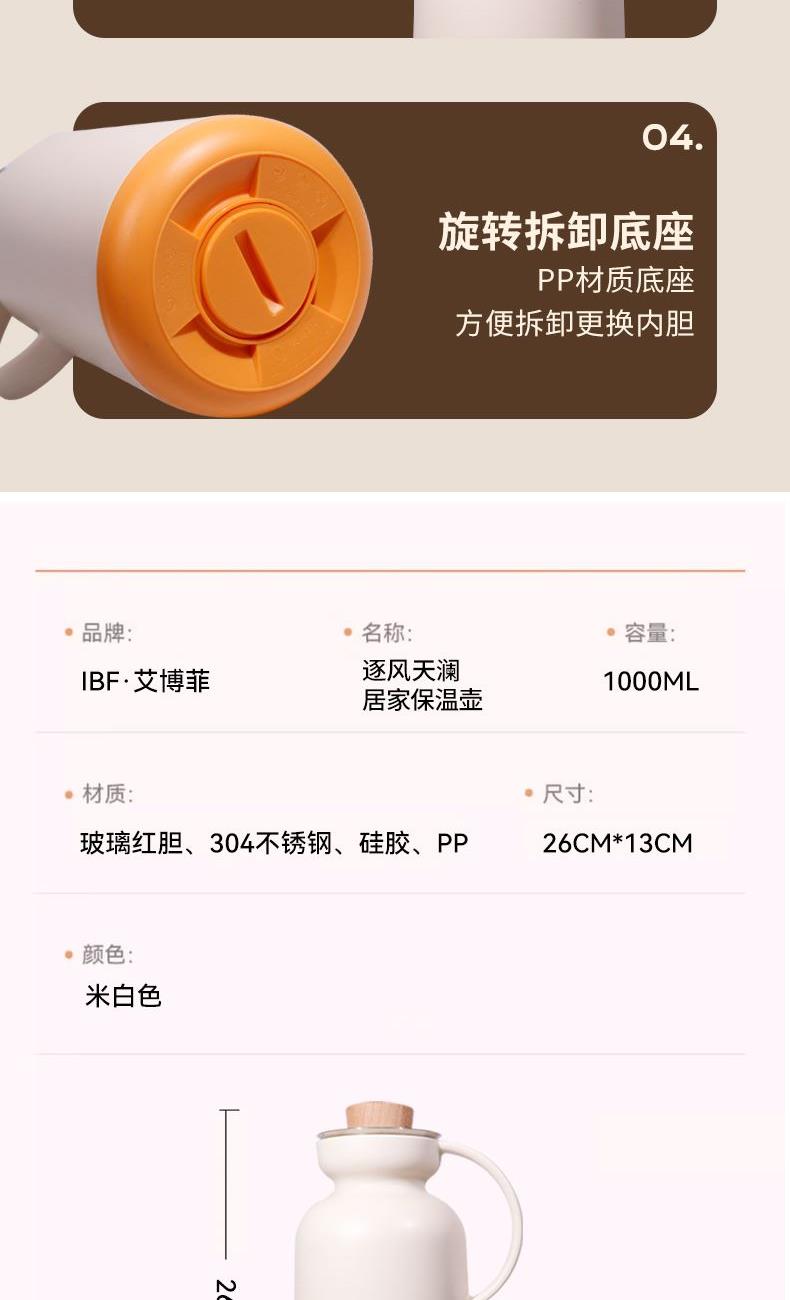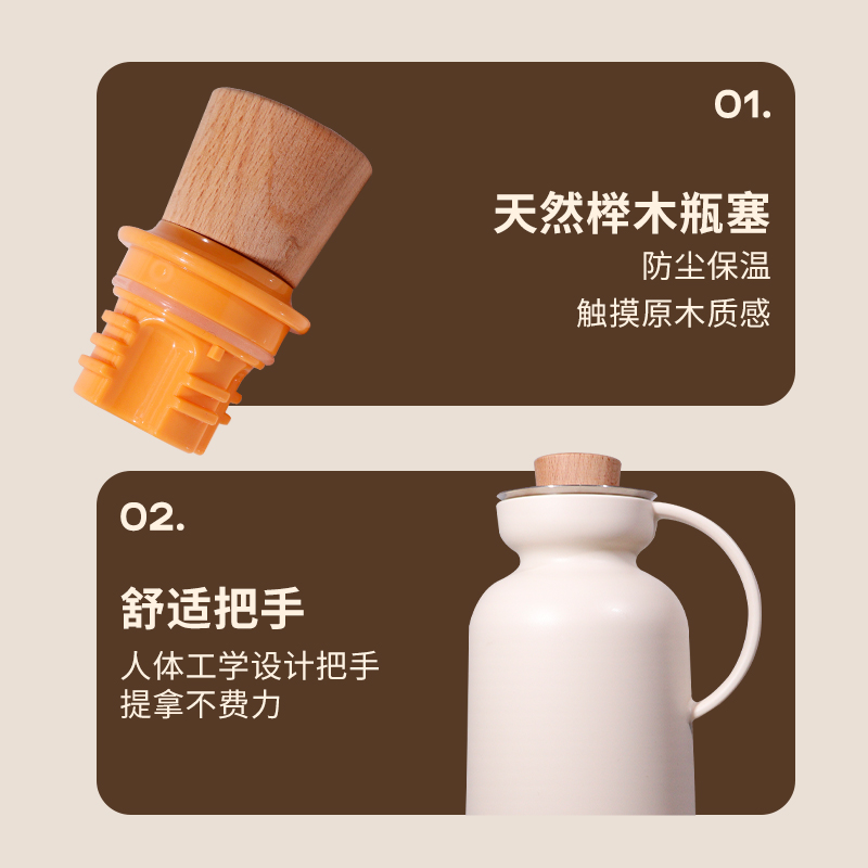 产品材质:PP+玻璃内胆 容 量:1000mL 净 重:0.648kg 彩盒尺寸:28.5x14x13cm 外箱尺寸:54.5x44x30cm 产品条码:6970070173000 执行标准:GB/T 11416-2002 北欧极简设计,融入生活日常、餐桌上的风景线,书房里的温暖陪伴 让每一次倾倒,都成为享受。 高硼硅红胆内壁耐高温(-5℃~120℃),锁住温度更锁住新鲜、晨起的热茶,母婴用水、深夜的暖饮,始终温热如初。 304不锈钢喇叭出水口、流畅断水不滴漏、天然榉木瓶塞、防尘保温,触摸原木质感。 PP外壳:防锈抗冲击,保护脆弱的玻璃内胆。 旋紧式壶盖,倾斜倒水时不易渗漏,适合车载、户外使用。 露营、旅行时保冷(冰水、冷饮、泡茶)或保温(热咖啡、汤粥),轻量化设计便于携带。