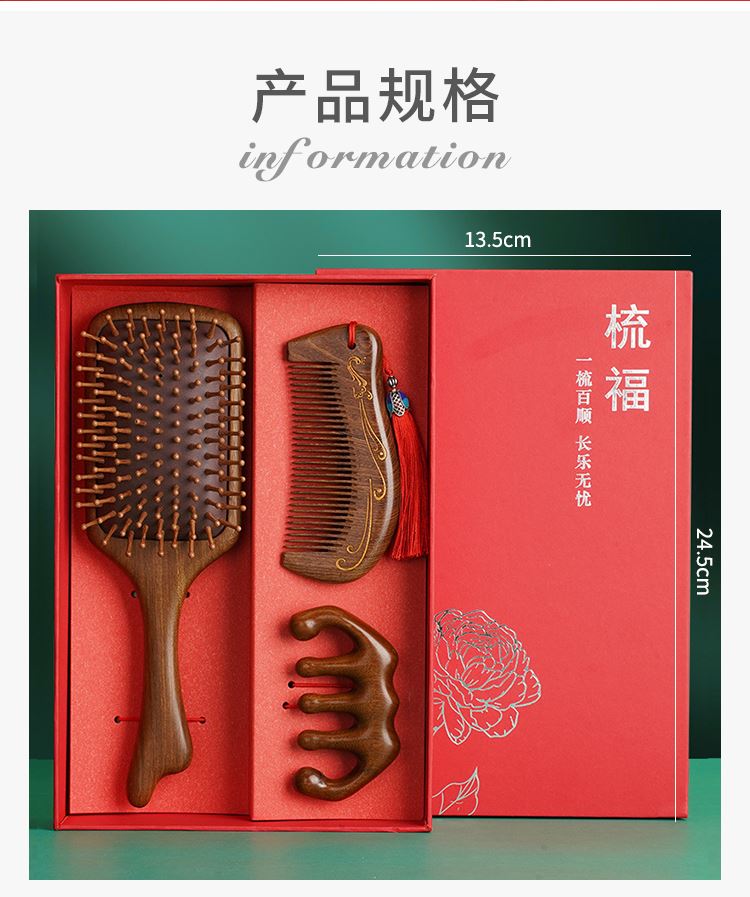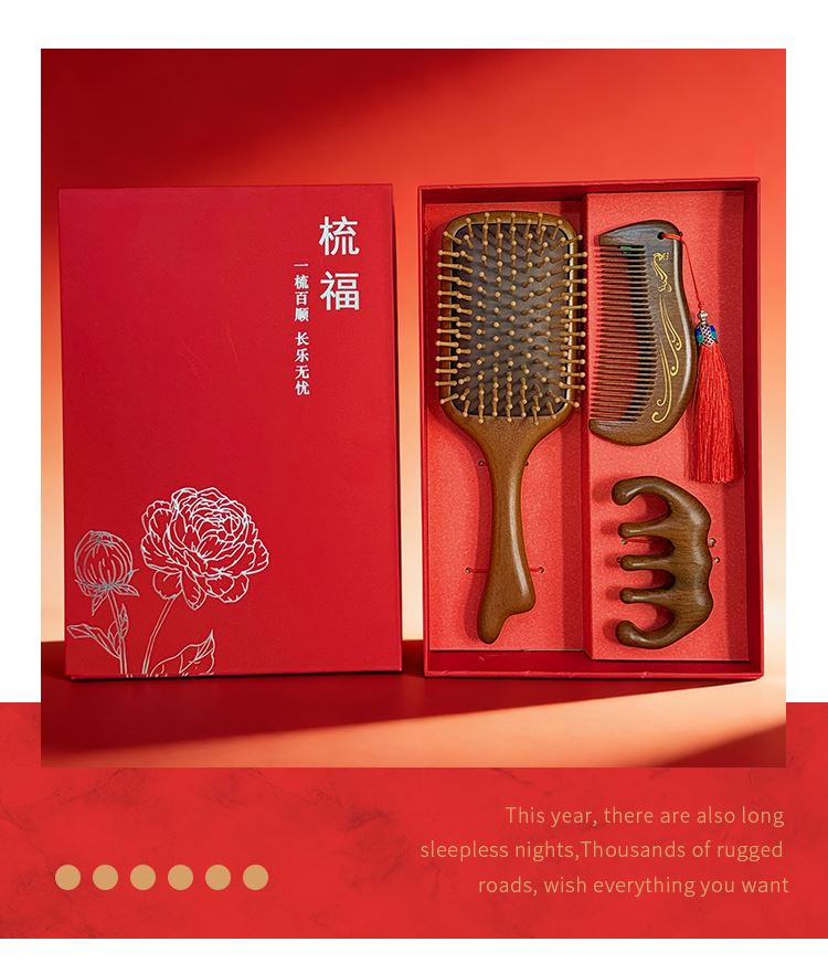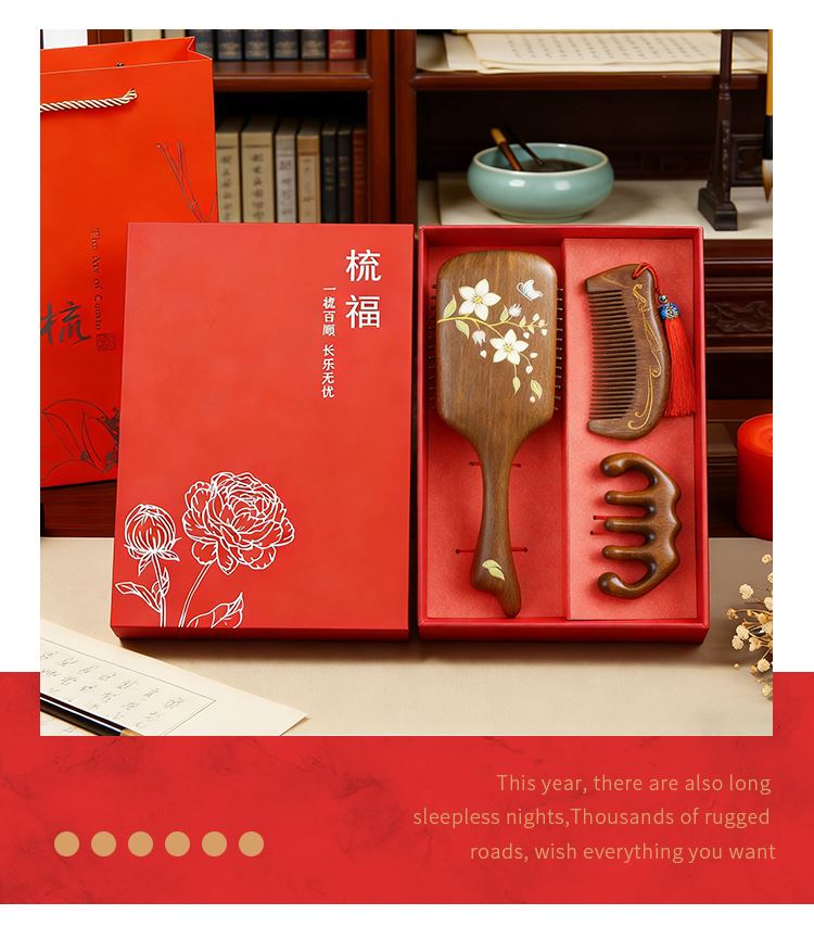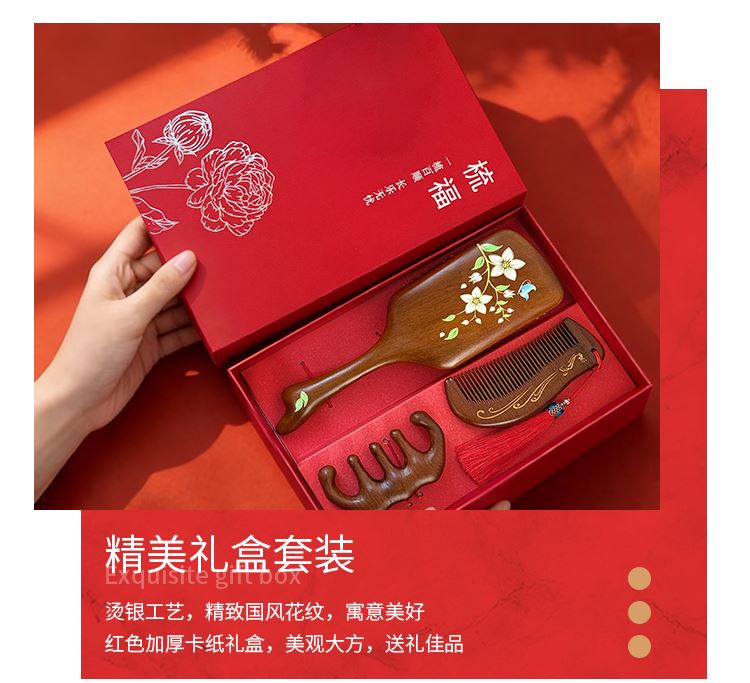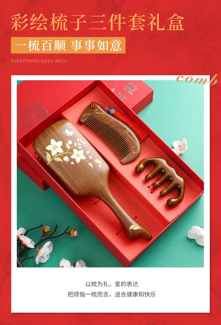 编码:W5054 内配:彩绘梳子礼盒三件套 柄梳、按摩梳、月梳(配流苏)、礼盒、手提袋 尺寸: 彩绘梳-8*24.5cm、月梳-5.5*12.5cm、按摩梳-5*9.5cm 礼盒-长24.5*宽13.5*高3.7cm