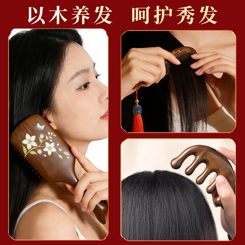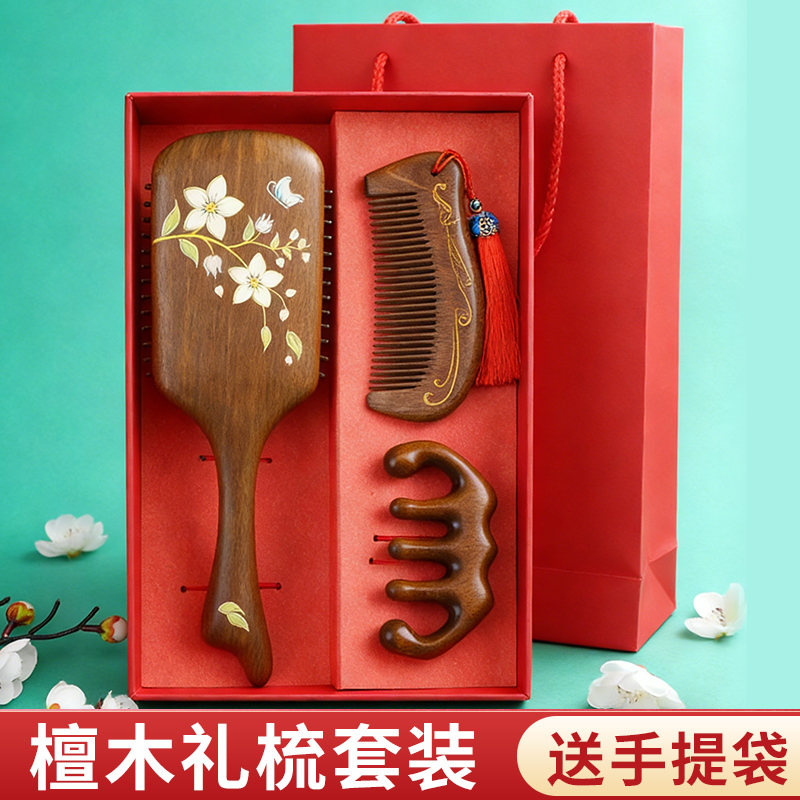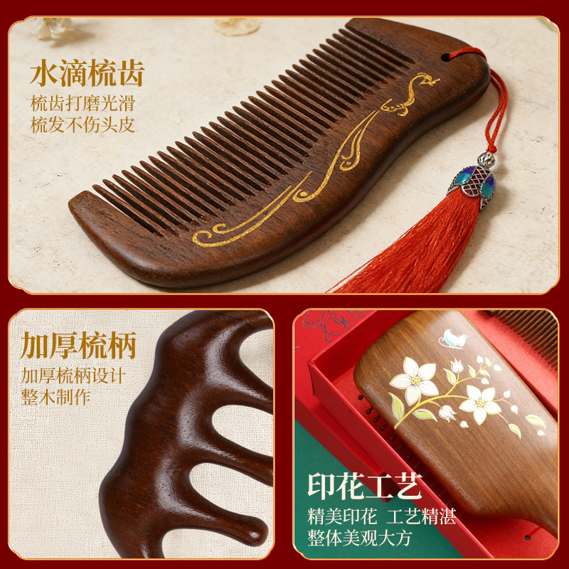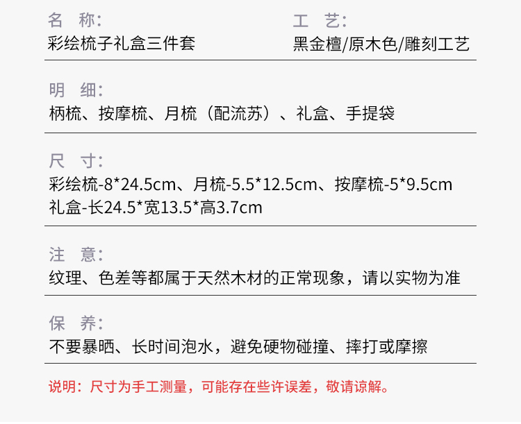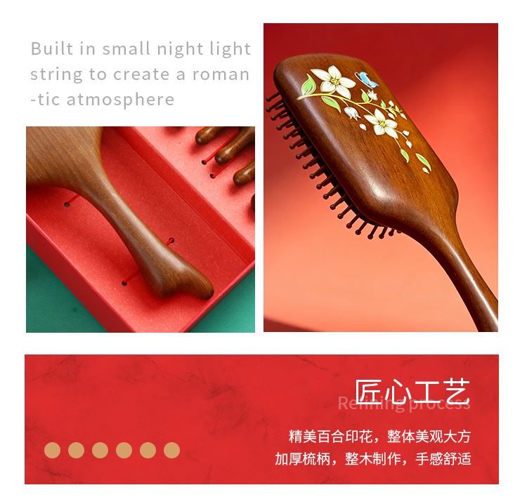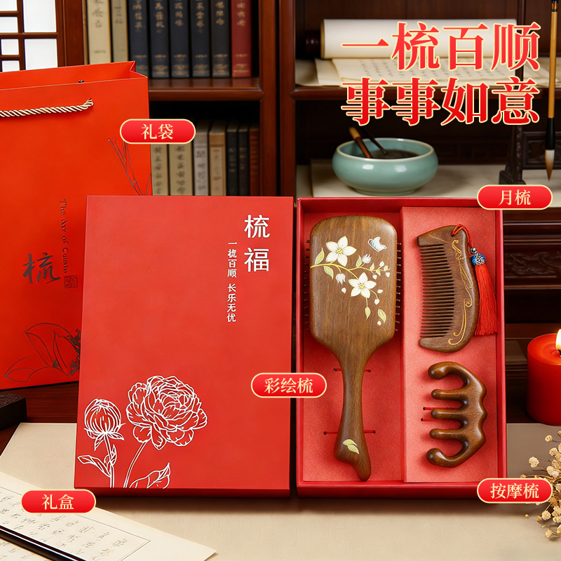 编码:W5054 内配:彩绘梳子礼盒三件套 柄梳、按摩梳、月梳(配流苏)、礼盒、手提袋 尺寸: 彩绘梳-8*24.5cm、月梳-5.5*12.5cm、按摩梳-5*9.5cm 礼盒-长24.5*宽13.5*高3.7cm