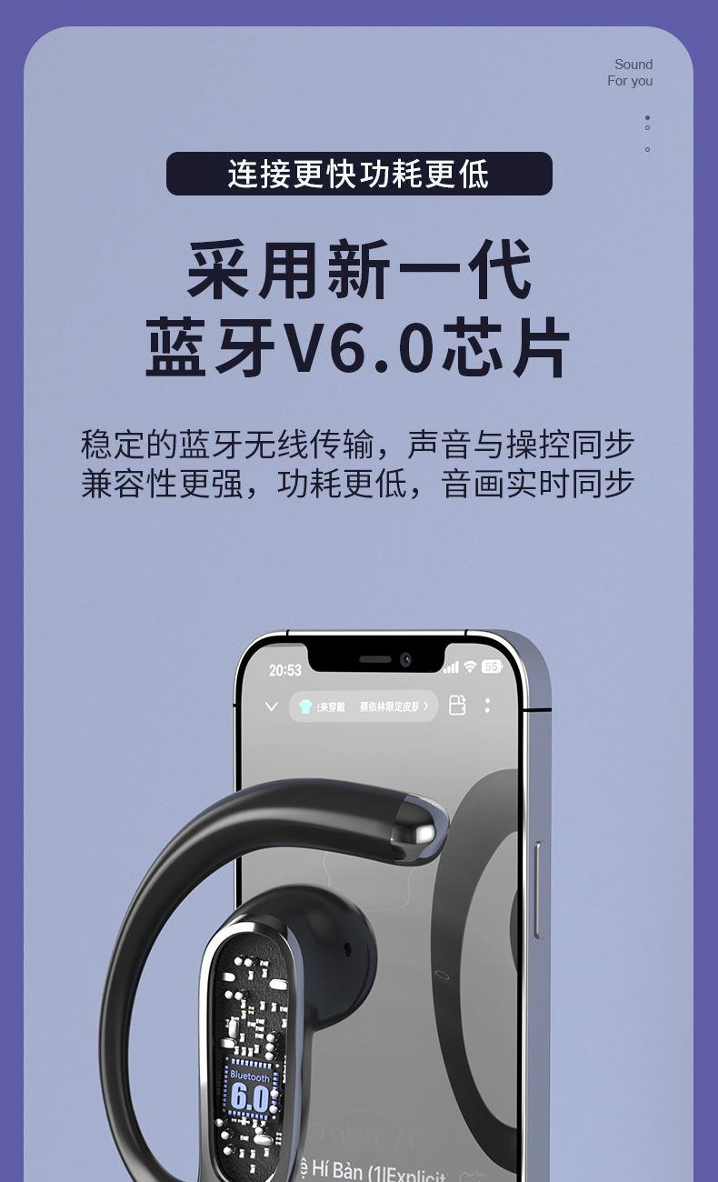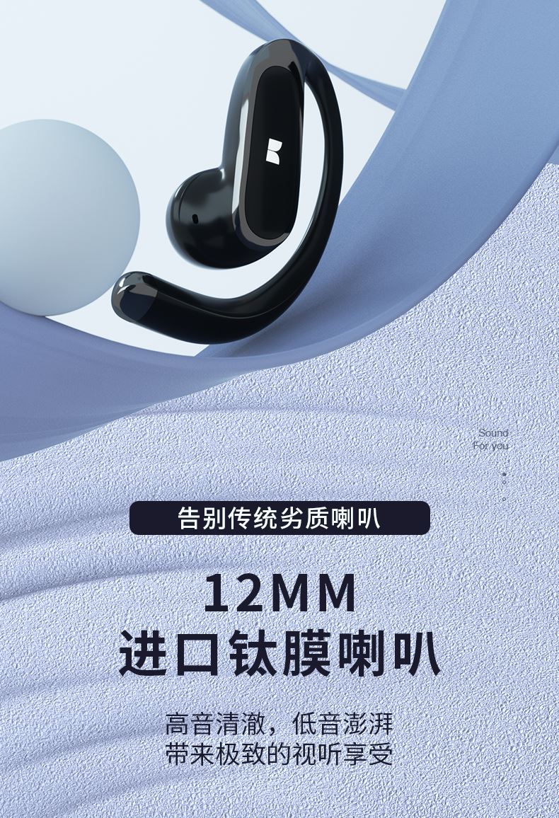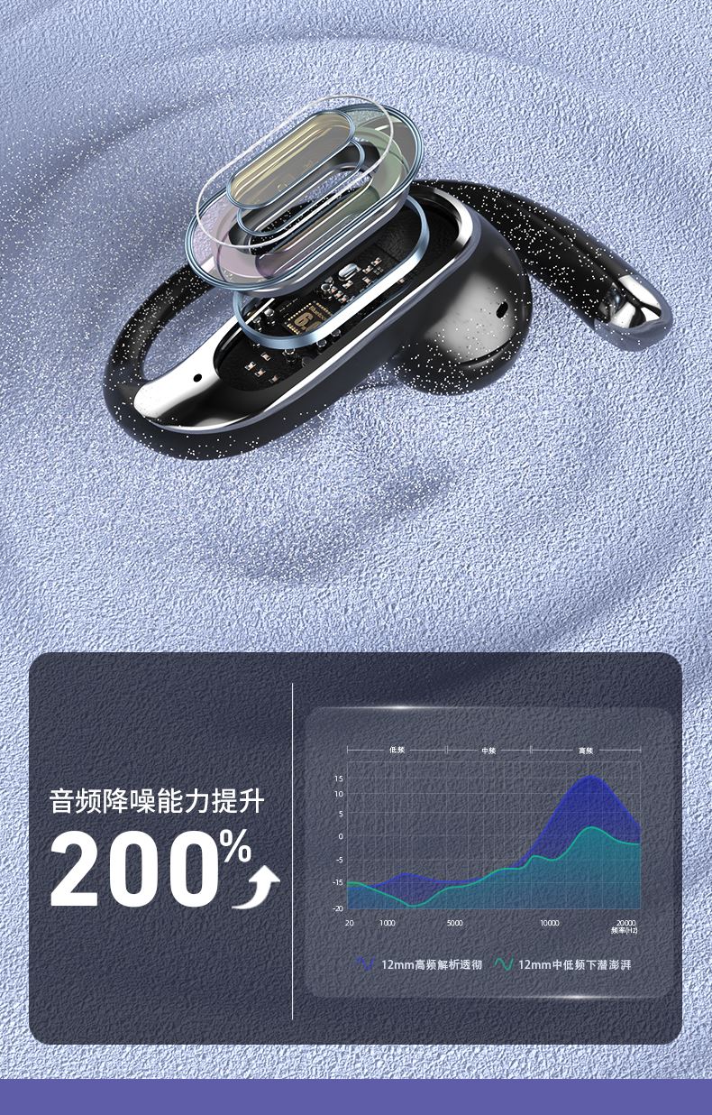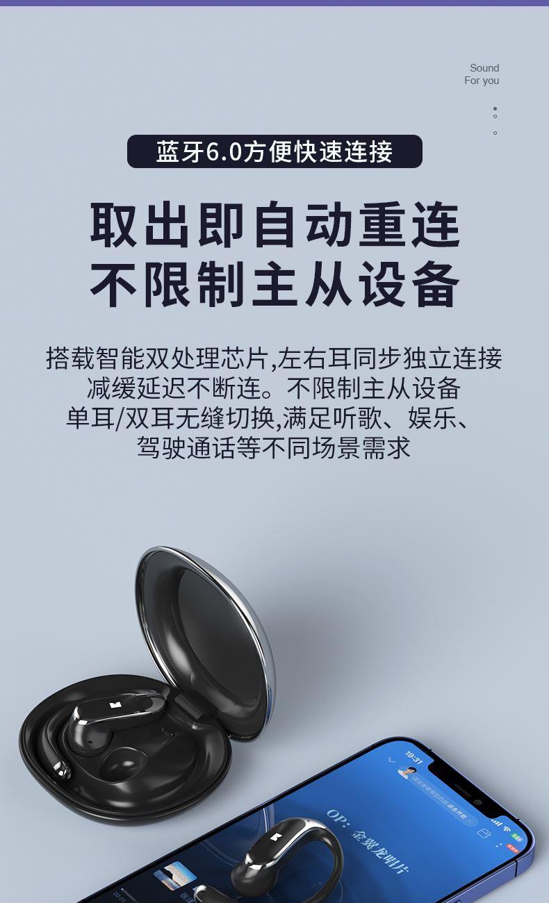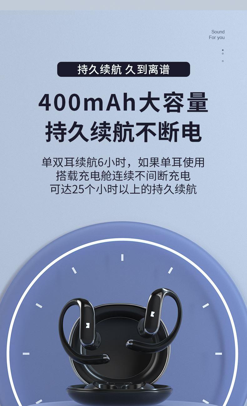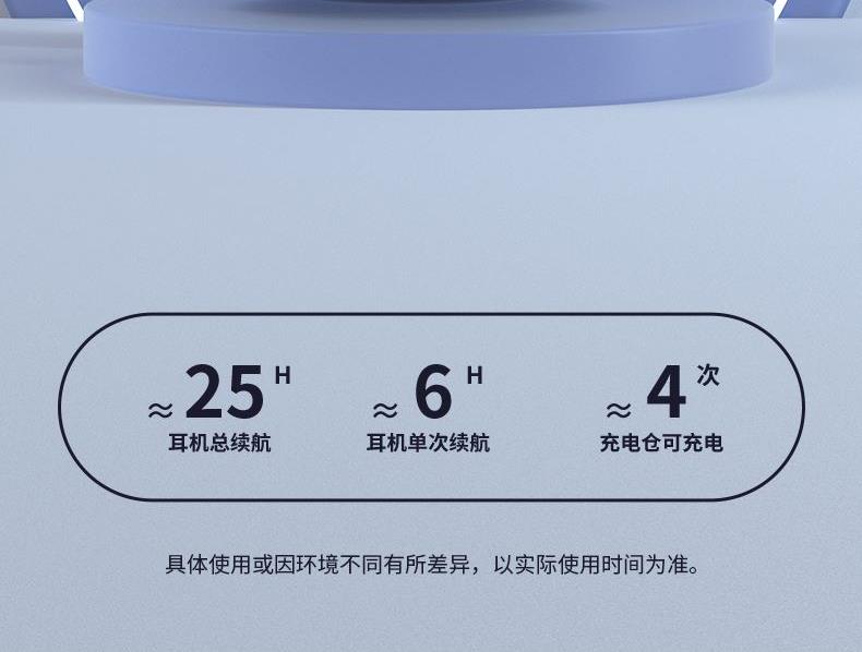 蓝牙:V6.0 喇叭:12mm 频响:20Hz-20KHz 电池:3.7V400mAh(充电仓) 电池:3.7V50mAh(耳机) 充电时间:≈2小时(充电仓) 播放时间:≈6小时(耳机) 播放时间:≈25小时(配合充电仓) • 纯正魔声HIFI级无损音质,蓝牙6.0,性能 再度飙升,传输快,功耗低 • 不入耳设计,云感舒适稳固,全天候佩戴舒适轻盈 • 单双耳续航6小时,使用搭载充电舱连续不间断充电 可达25个小时以上的持久续航 • 银色,黑色,玫瑰金多配色可选 • 内置Ai智能小度,中英互译,随身百事通