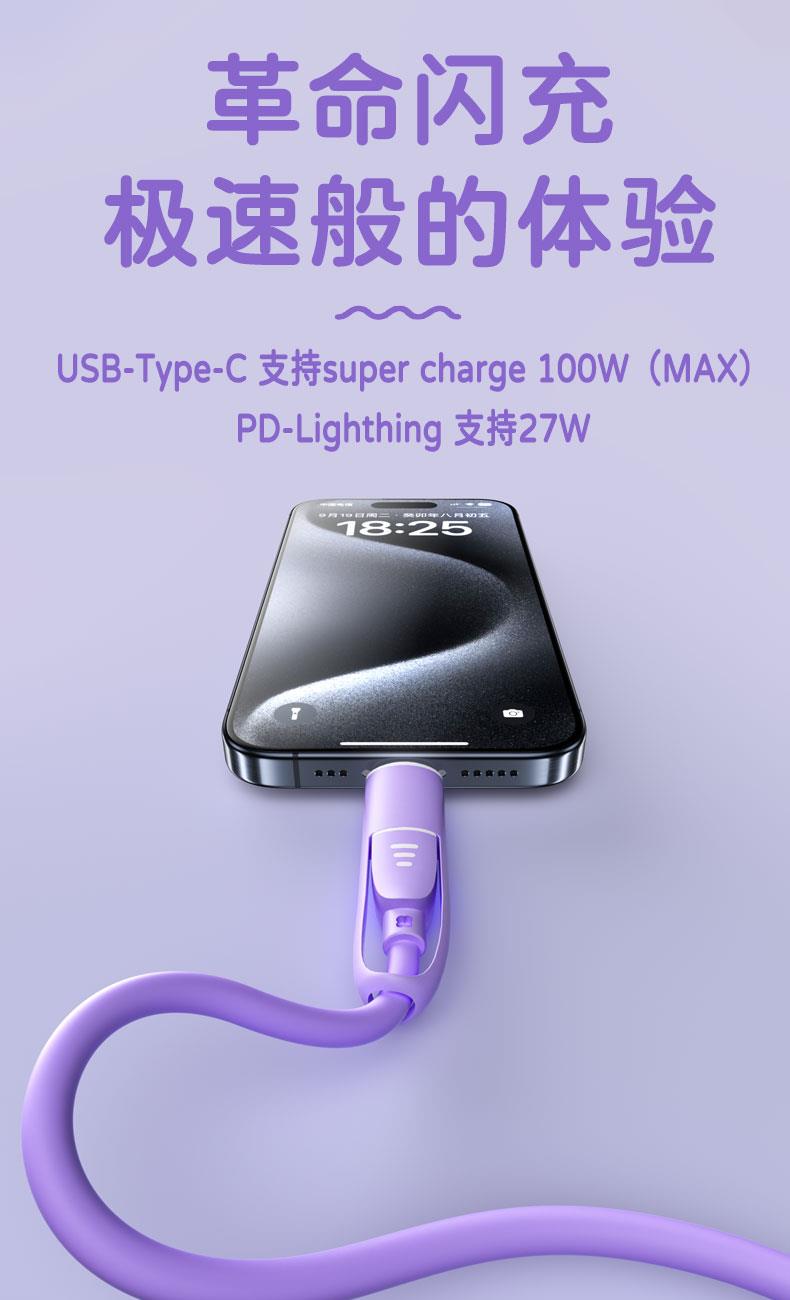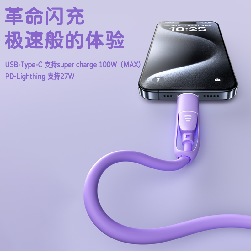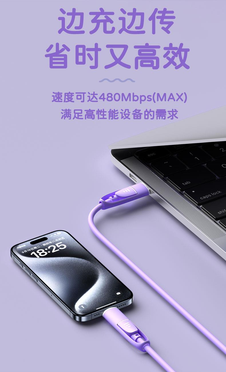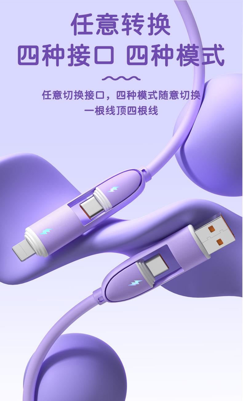 奥苏米S62四合一66W超级快充硅胶数据线 颜色:绿色 紫色 黑色 粉色 白色 材质:编织线 尺寸:1M 包装:彩盒包装 【功能特点】: A/C口二拖二设计,兼容苹果15以上充电 66W超级快充,充电更快, C-C 66W / C-L27W 液态硅胶线,一体成型充电头 1米长度设计,使用方便 亲肤手感,丝滑柔顺不打结
