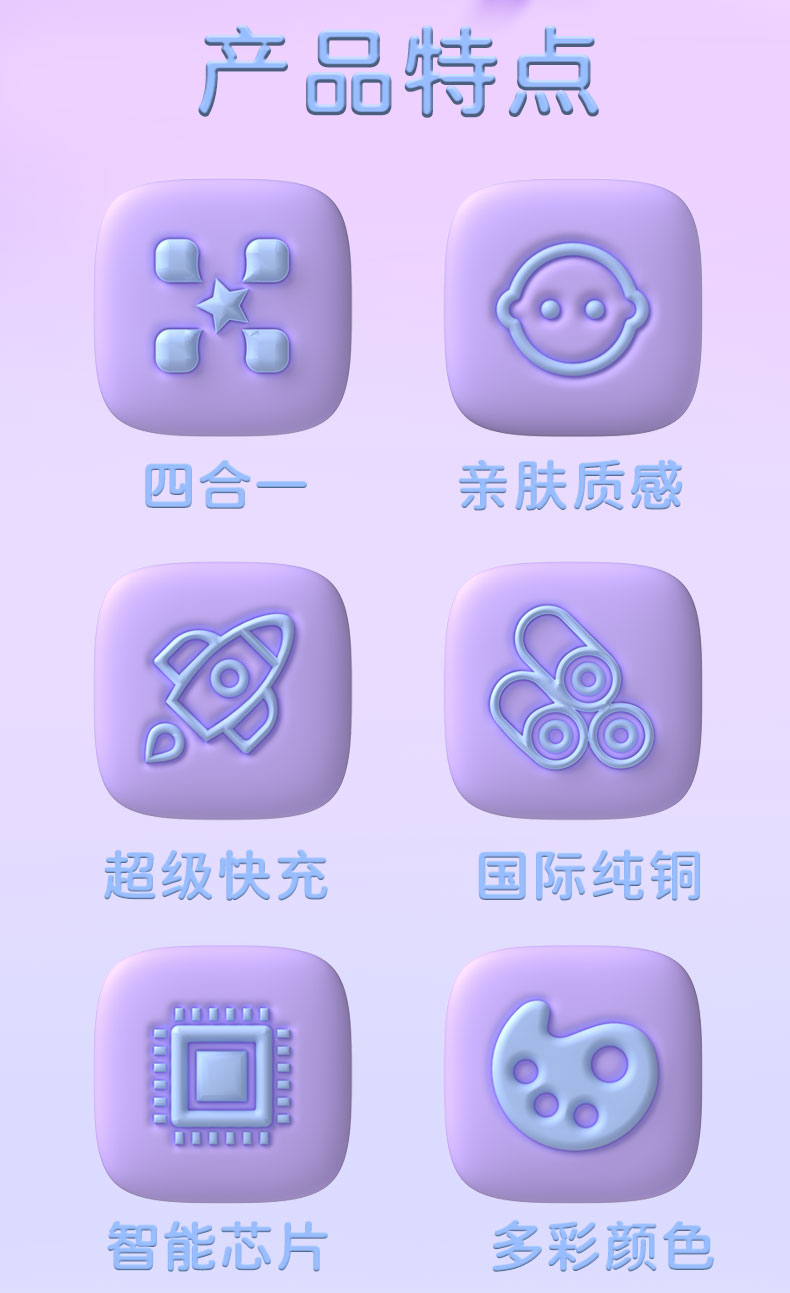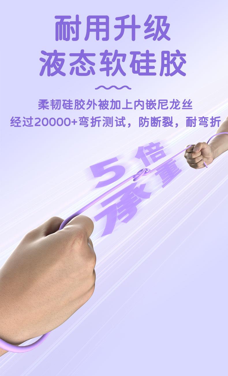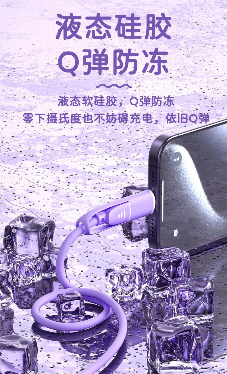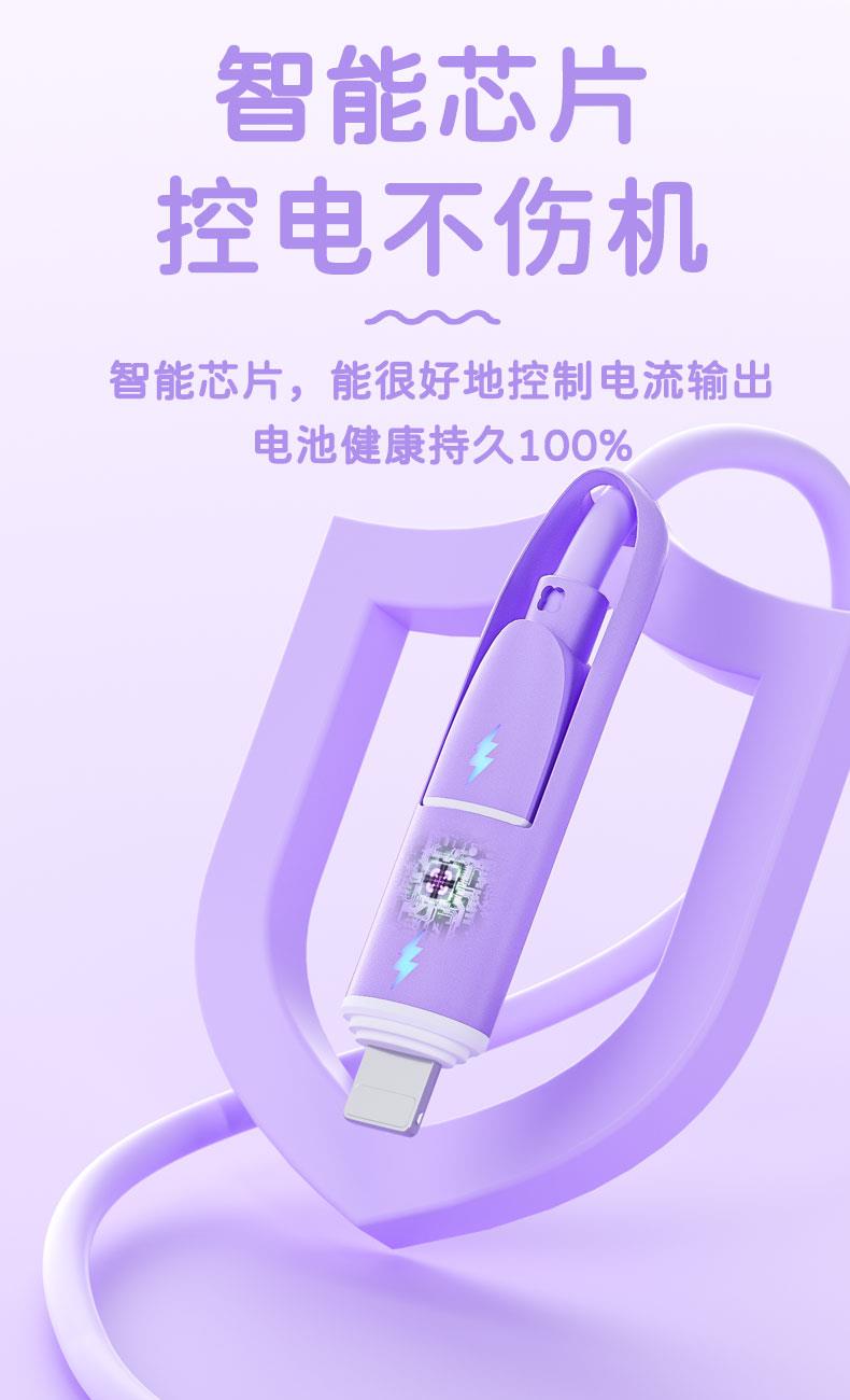 奥苏米S62四合一66W超级快充硅胶数据线 颜色:绿色 紫色 黑色 粉色 白色 材质:编织线 尺寸:1M 包装:彩盒包装 【功能特点】: A/C口二拖二设计,兼容苹果15以上充电 66W超级快充,充电更快, C-C 66W / C-L27W 液态硅胶线,一体成型充电头 1米长度设计,使用方便 亲肤手感,丝滑柔顺不打结