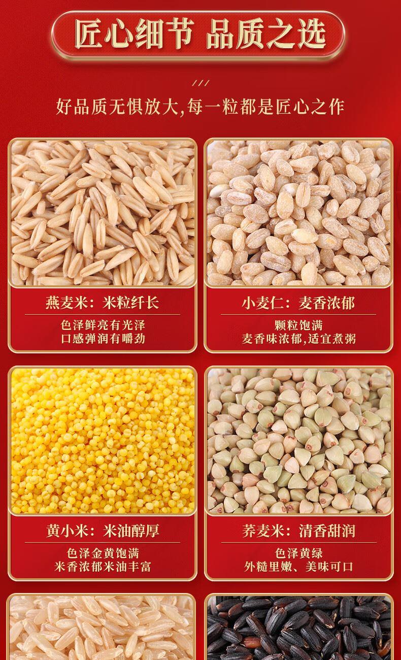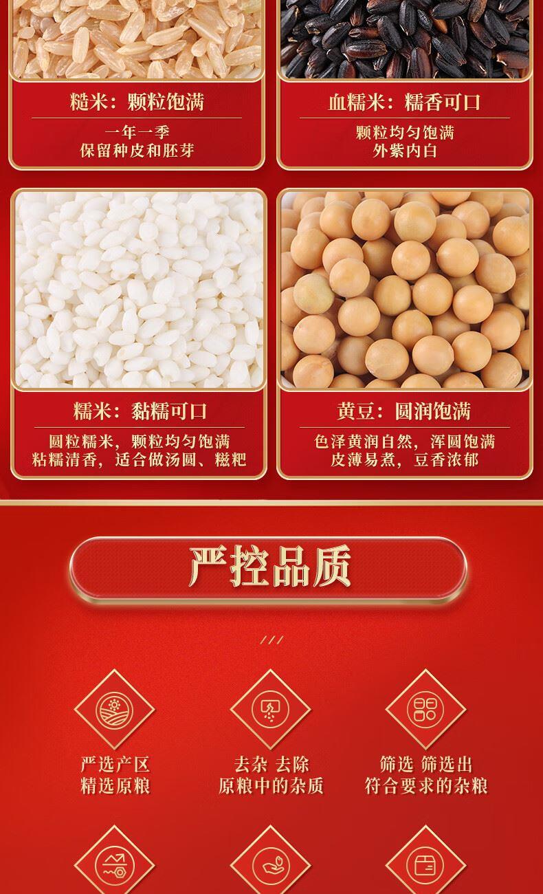 净含量:3.2kg 箱 规:5盒/箱 保质期:18个月 税率:13% 产品组合:黄豆400g、荞麦米400g、小麦仁400g、糯米400g、燕麦米400g、血糯米400g、糙米400g、黄小米400g 产品卖点:产区远离工业区,生态环境良好,精挑细选,颗粒饱满,给你大自然的原色原香