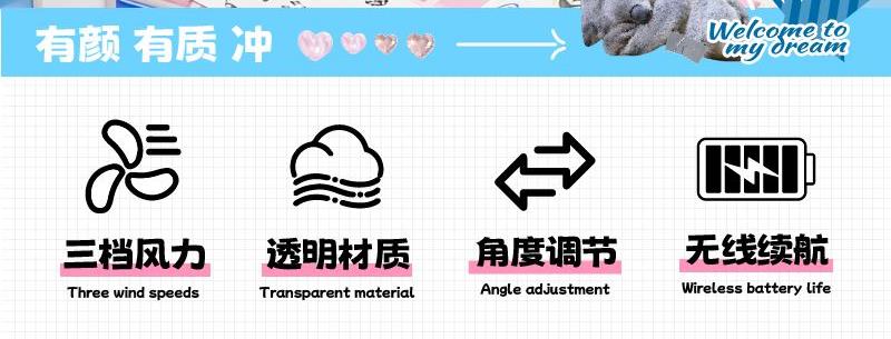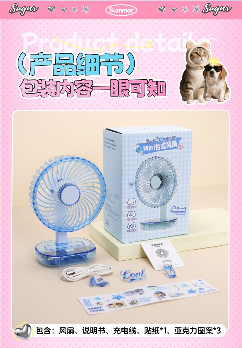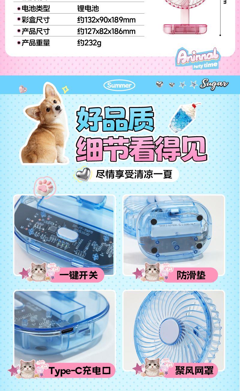 产品颜色:粉色、蓝色、灰色 产品尺寸:127x82x186mm 电池容量:1800mAh 风速档位:3档 充电时间:4H 使用时间:130-280分钟 外箱尺寸:41x39x88CM 整箱毛/净重:16.6/14.6kg 备注:本产品须整箱发货 温馨提示:季节品库存数据波动较大,以当天确认出货时间为准