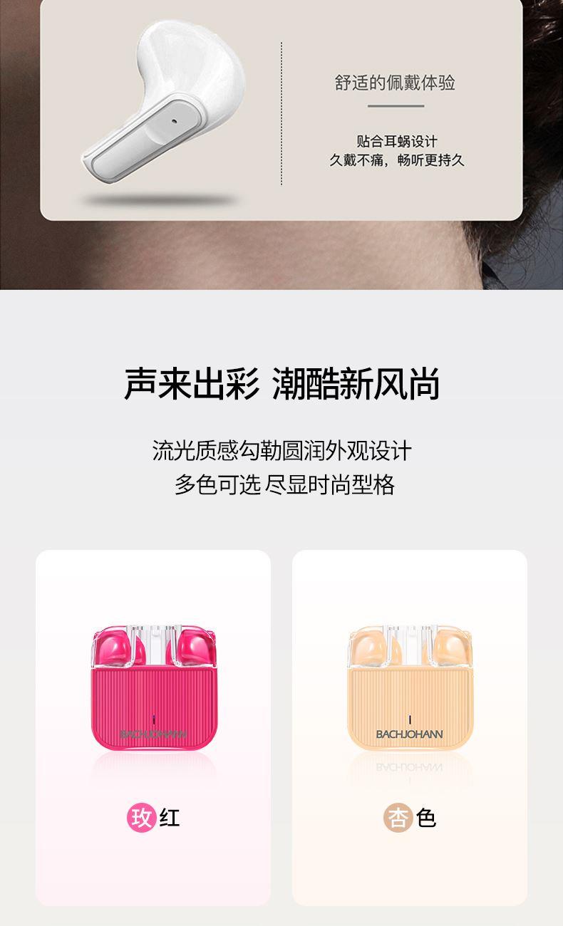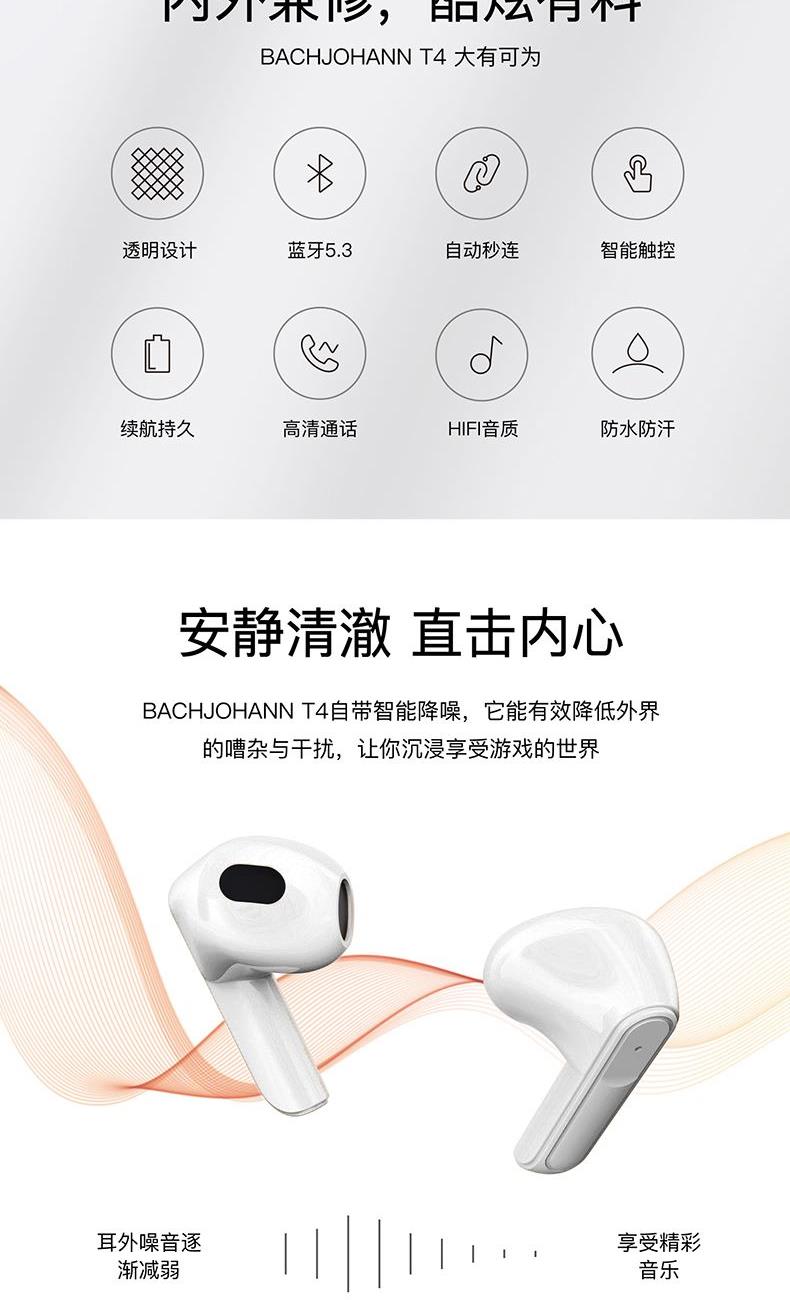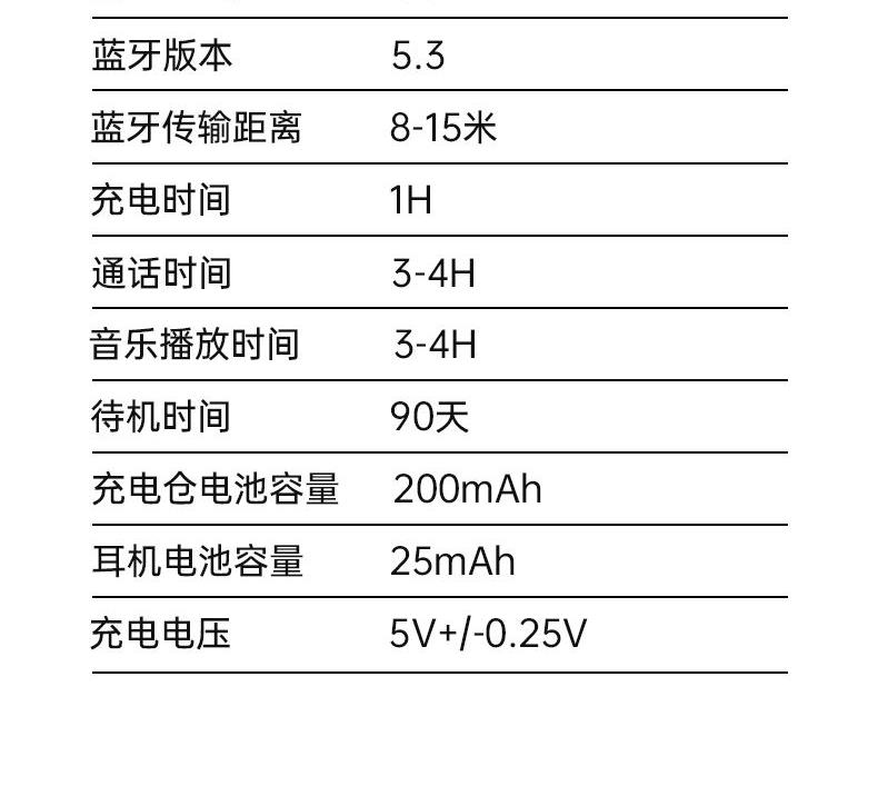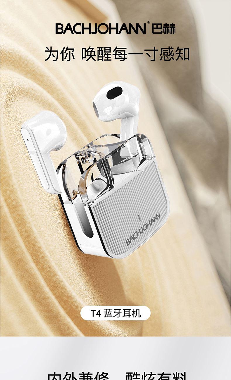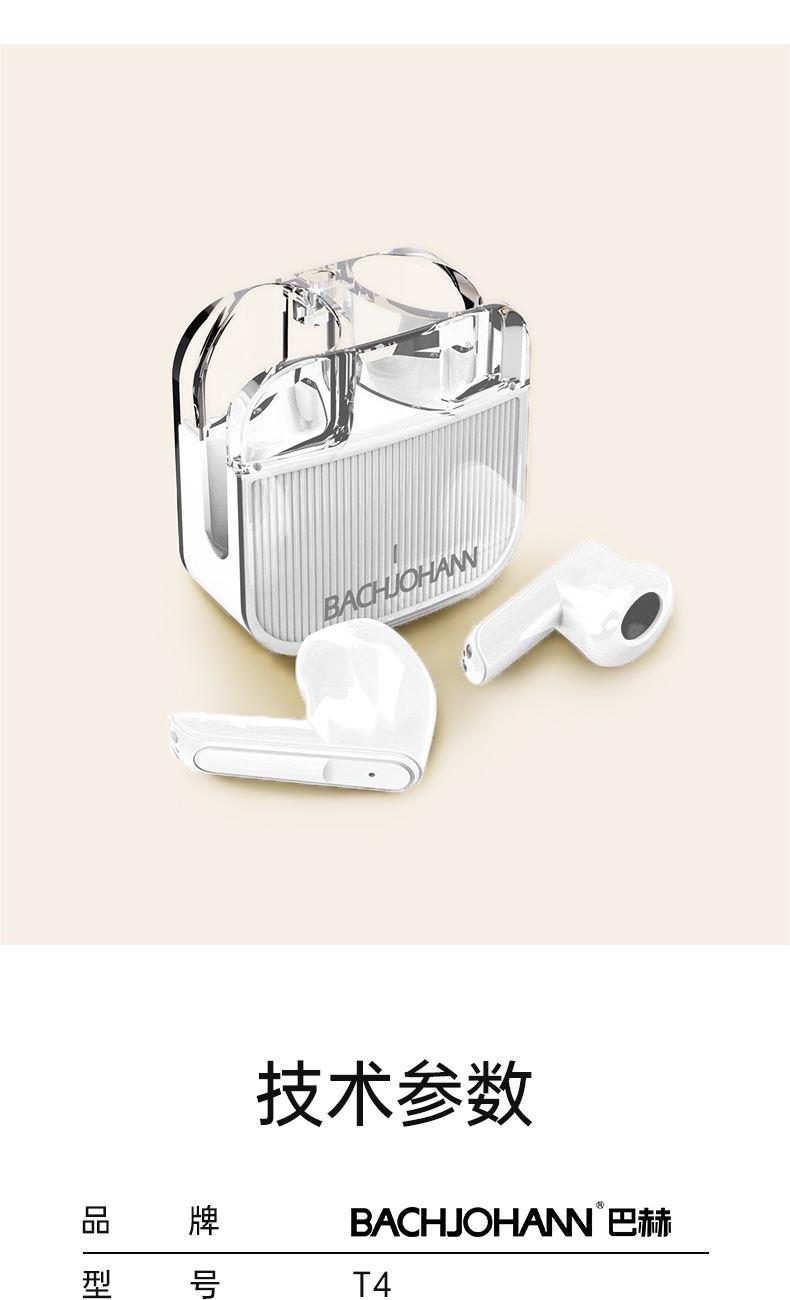 技术参数 产品型号:T4 蓝牙耳机蓝牙:5.3 充电时间:约1小时 待机时间:约90天 工作距离:约8-15米 通话时间:约3-4小时 充电仓容量:200mAh 耳机容量:25mAh 充电接口:Type-C 颜色:白色、粉色、玫红(现货颜色) ◆外壳中部分采用透明设计,内部耳机一眼即见 ◆取出即刻配对连接,低延迟,高效率 ◆大容量充电仓,提供超强的续航能力,使用时间更久 ◆适应人体工学的设计,使得佩戴舒适