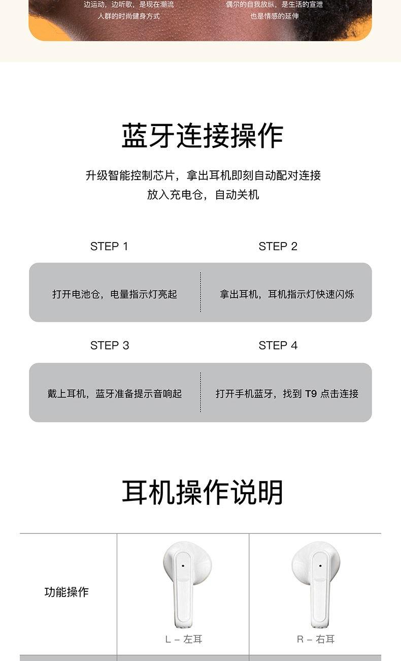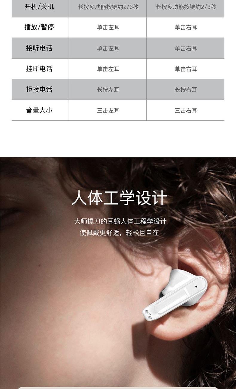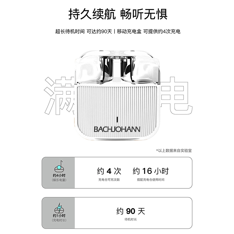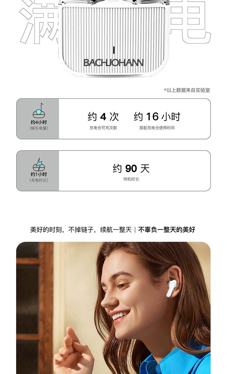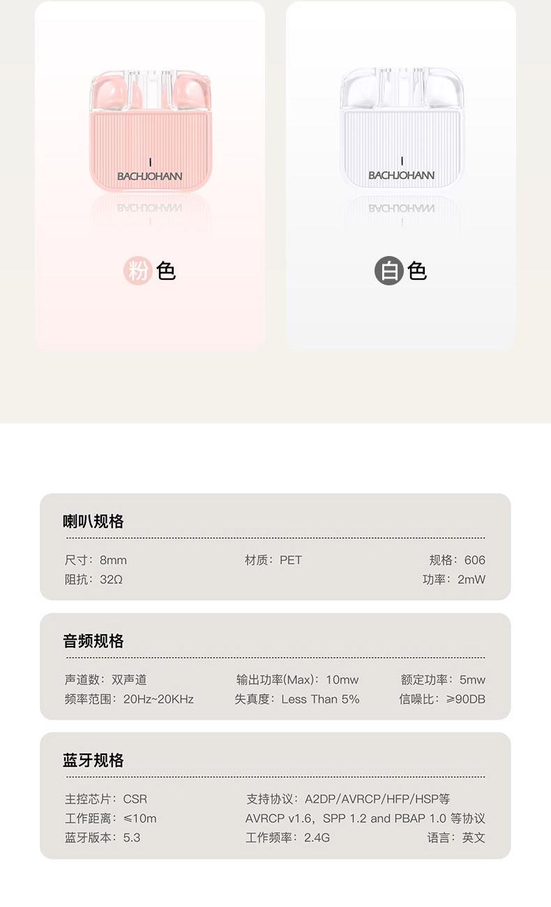 技术参数 产品型号:T4 蓝牙耳机蓝牙:5.3 充电时间:约1小时 待机时间:约90天 工作距离:约8-15米 通话时间:约3-4小时 充电仓容量:200mAh 耳机容量:25mAh 充电接口:Type-C 颜色:白色、粉色、玫红(现货颜色) ◆外壳中部分采用透明设计,内部耳机一眼即见 ◆取出即刻配对连接,低延迟,高效率 ◆大容量充电仓,提供超强的续航能力,使用时间更久 ◆适应人体工学的设计,使得佩戴舒适