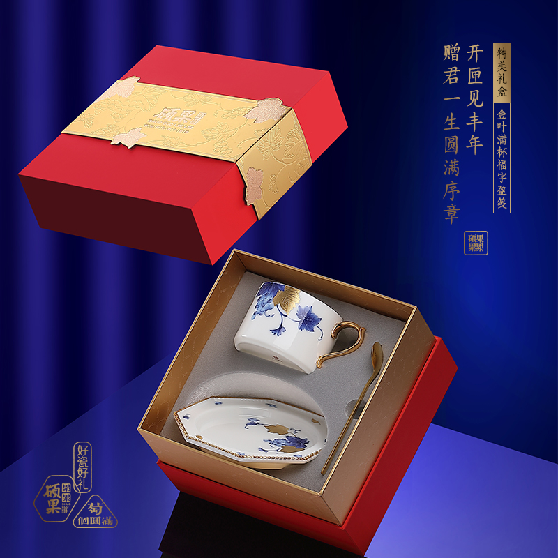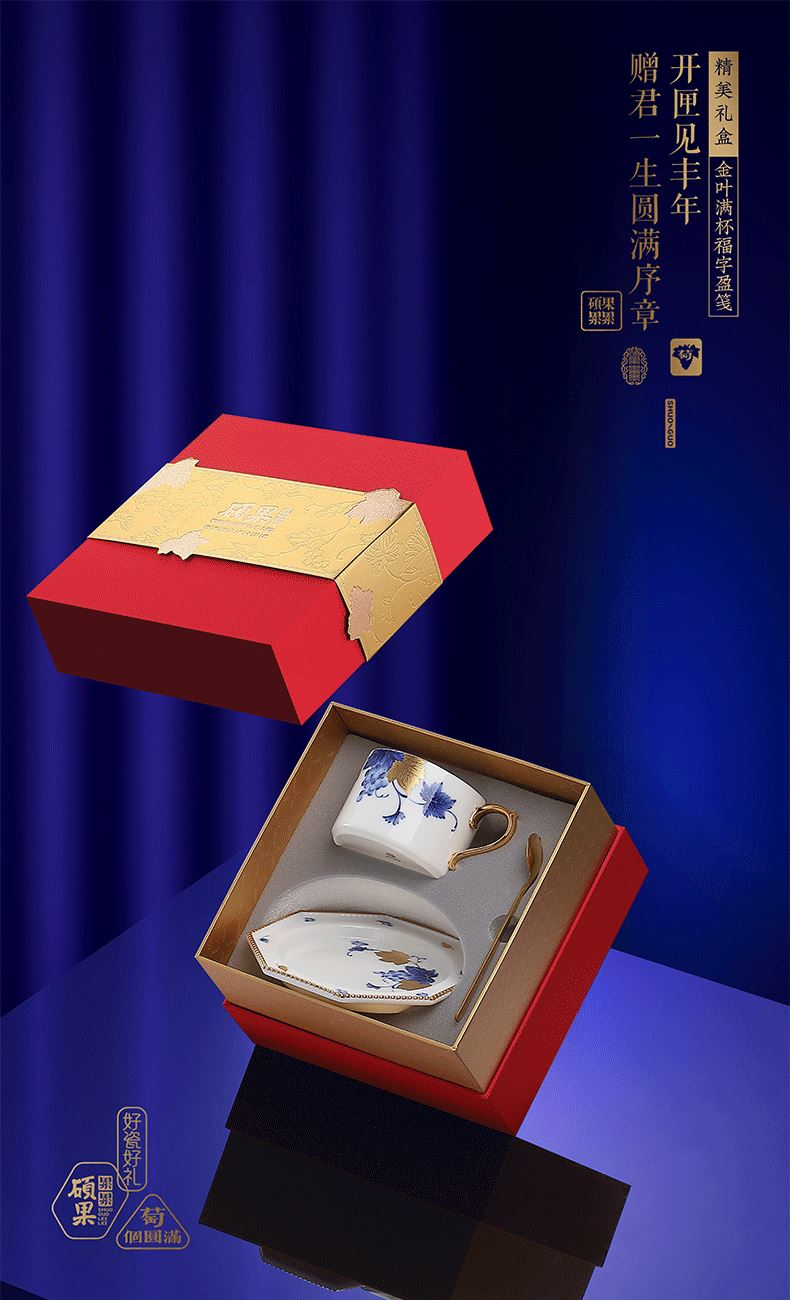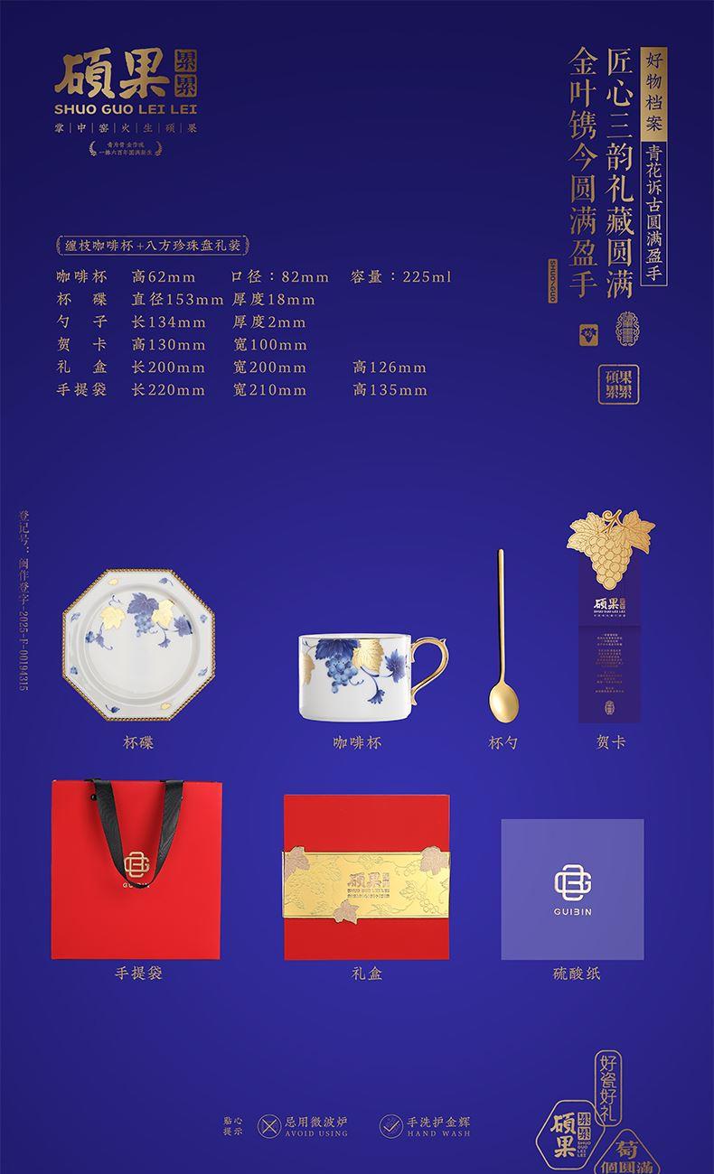缠枝咖啡杯和八方珍珠盘套装 1.咖啡杯:高62mm、口径:82mm、容量:225ml 2.杯贴:直径153mm、厚度18mm 3.勺 子:长134mm、厚度2mm 4.贺卡:高130mm、宽100mm 5.礼盒:长200mm、宽200mm、高126mm 6.手提袋:长220mm、宽210mm、高135mm