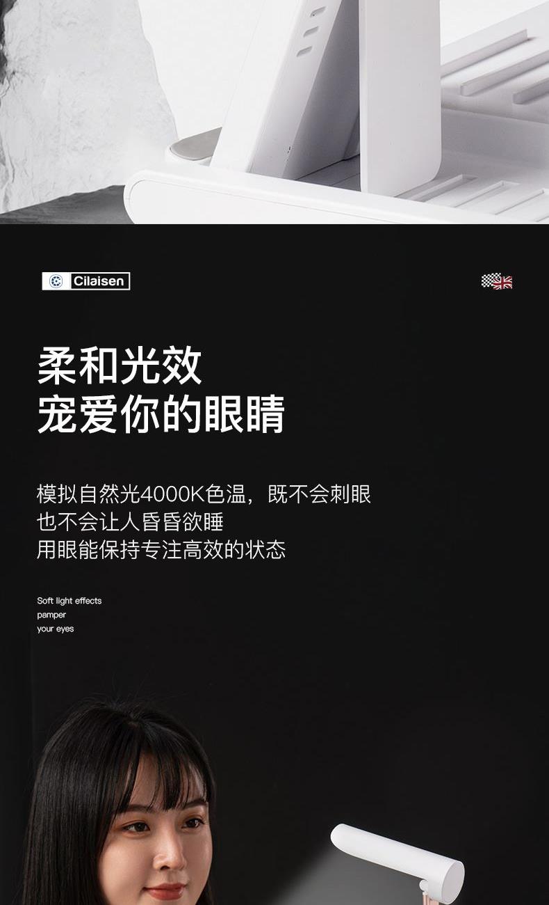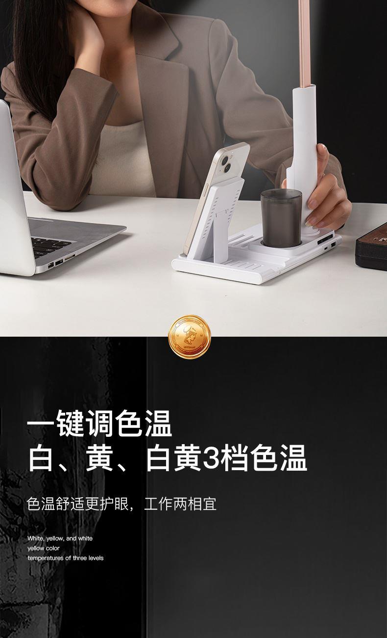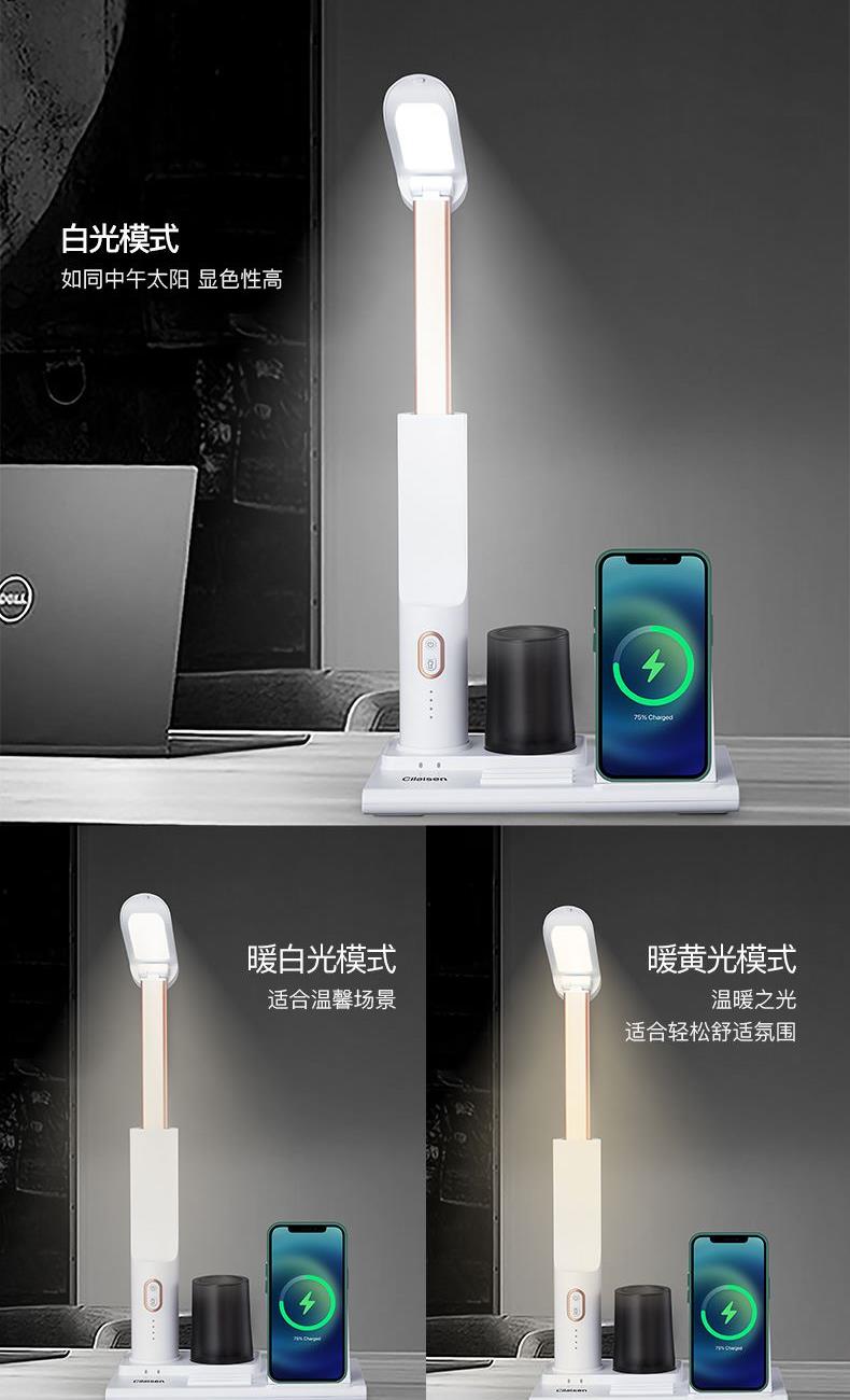 产品参数: 产品型号:CP-TW1 额定电压 : 5V 额定功率:23W 电池容量:1000mAh 商品条码 : 6972831860716 产品毛重 : 605g 产品尺寸:200X130X225mm(折叠尺寸) 彩盒尺寸:235X150X85mm 包装清单:无线充电底座x1、折叠台灯x1、笔筒x1、 充电线x1、说明书x1