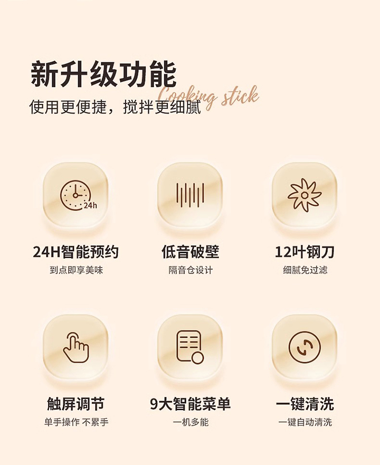 产品重量:净重1.8kg / 毛重2.2kg 产品容量:热饮1000ml;冷饮1200ml 包装尺寸:240*240*347mm 产品尺寸:215x168x307mm 颜色:白色 额定功率:加热800W / 搅拌200W 产品卖点:1、升级12叶刀头 多角度切割,粉碎食材,无需过滤,搅打更细腻 2、轻音破壁,配置隔音罩 轻音搅拌,破壁不扰人 3、高硼硅玻璃内胆 高硼硅玻璃杯体,骤冷骤热不易破裂,使用更安全 4、预约保温 24小时预约,早八上班不匆忙,热饮自动保温4小时 5、内置感温探头 控温,熬煮不糊底, 6、 冷热双破壁 9大功能菜单,冷饮/热饮皆可,一机多用