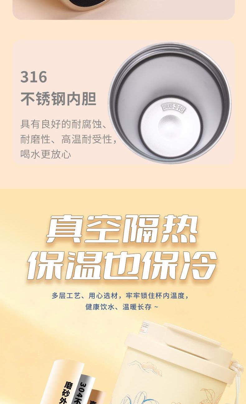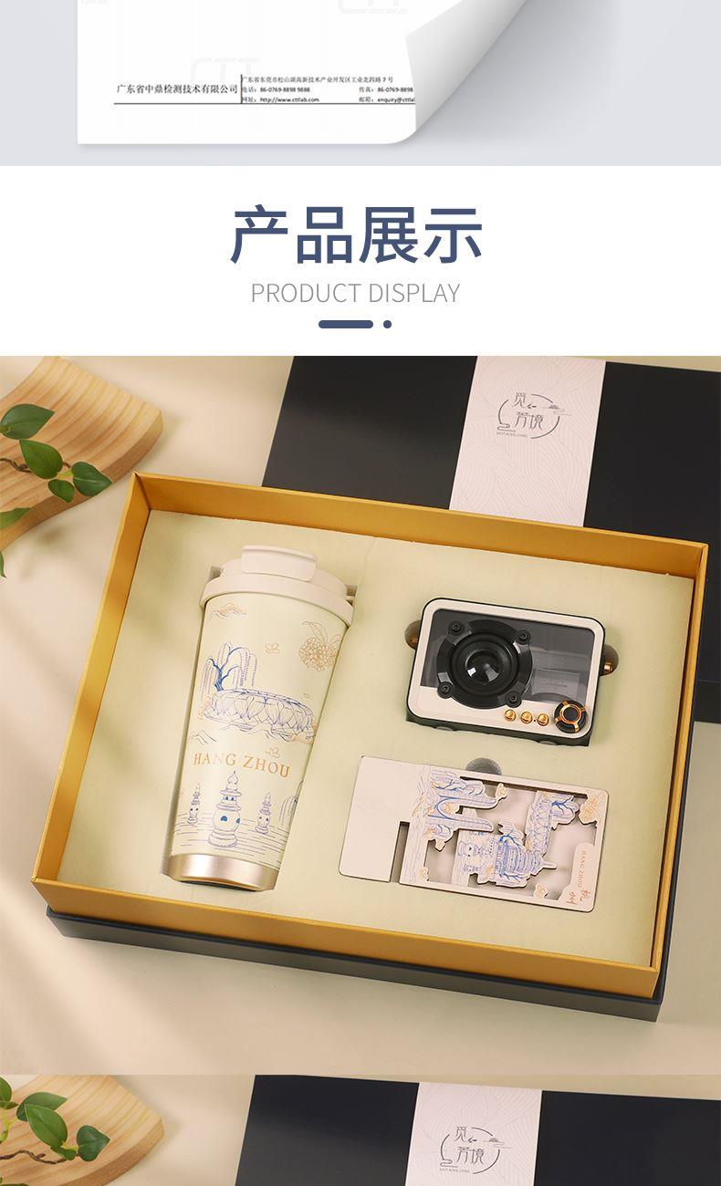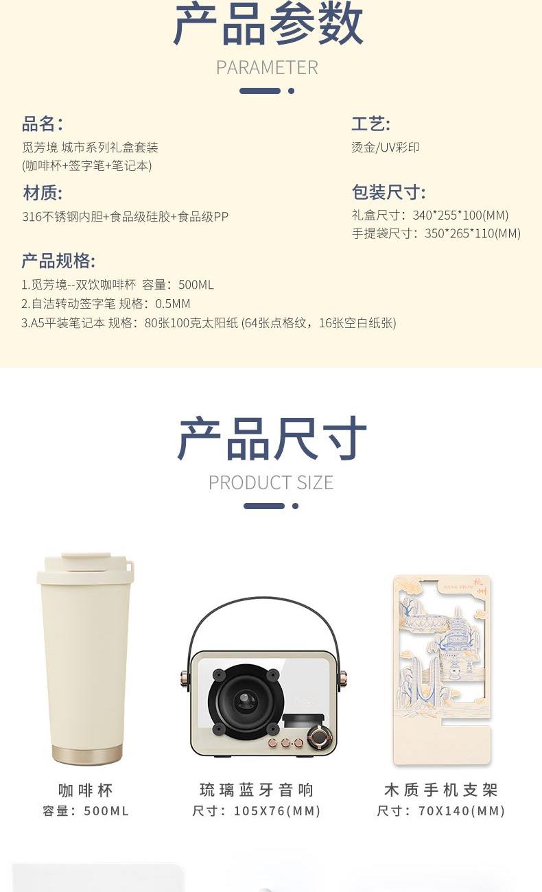 1.觅芳境--双饮咖啡杯 容量:500ml 内胆:316 外壳:304 杯盖:食品级PP 吸管:食品级硅胶 吸嘴:食品级PP 密封圈:食品级硅胶 2.自洁转动签字笔 规格:0.5mm 3.A5平装笔记本 规格:80张100克太阳纸 (64张点格纹,16张空白纸张) 礼盒尺寸:340*255*100(MM) 手提袋尺寸:350*265*110(MM)