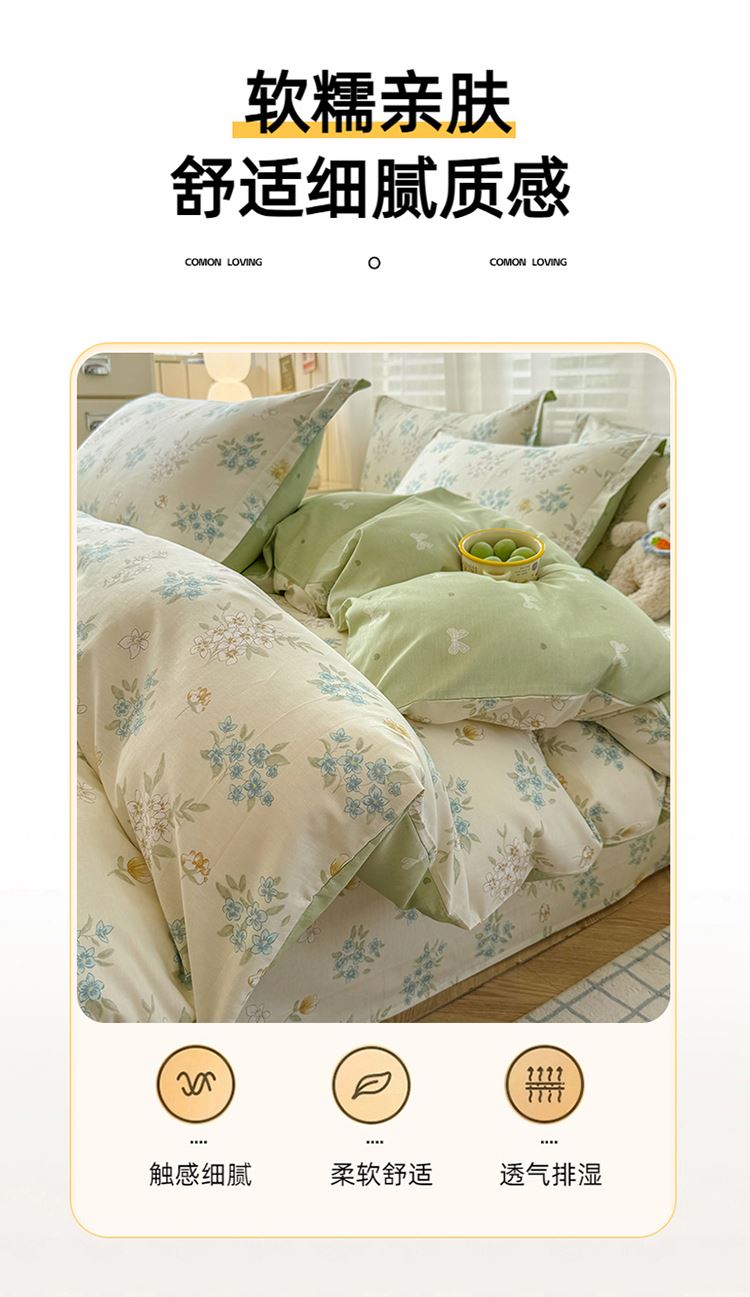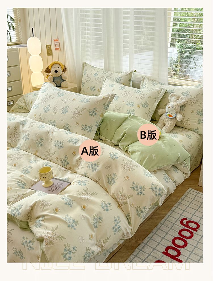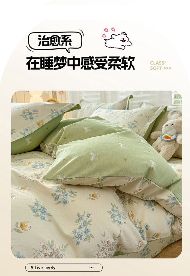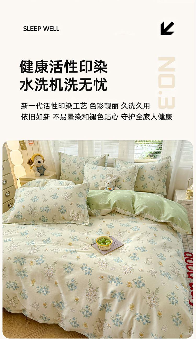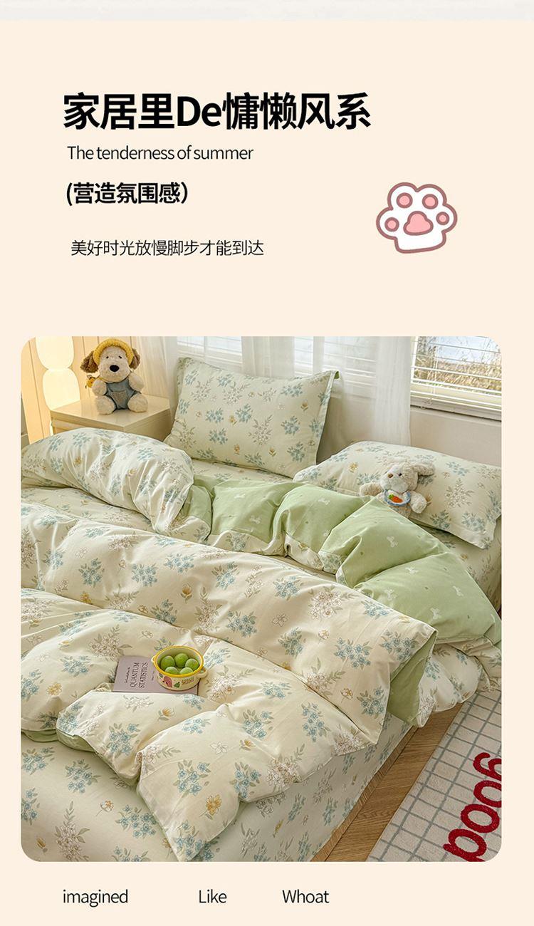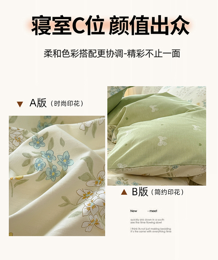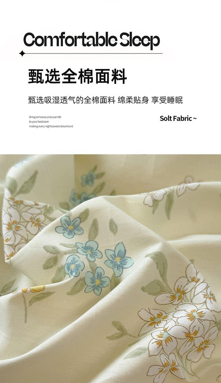 1:从内而外皆是棉与身体接触的每一寸都是天然阳光棉, 2:软糯亲肤舒适细腻质感, 触感细腻 柔软舒适 透气排湿 3:AB双版精心搭配的版型设计 给床品增添层次 愈睡愈爱 尺寸:1.8m床被套200*230cm*1床单:230*245cm *1 枕套:48*74cm*2 包装:彩盒