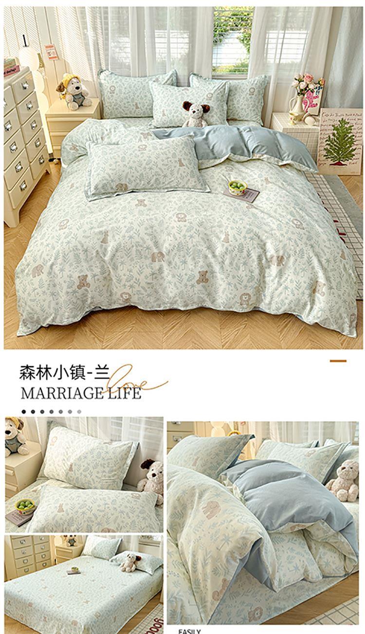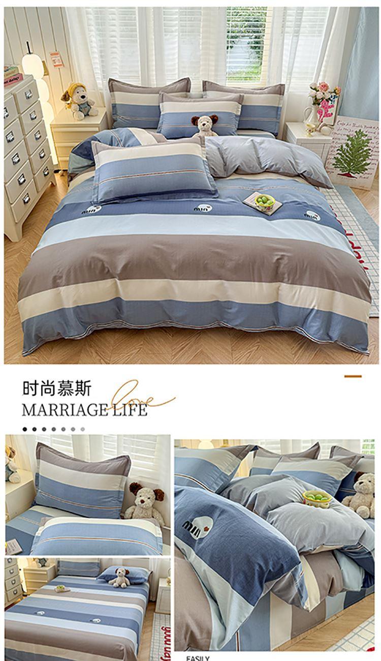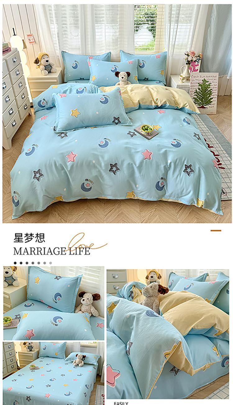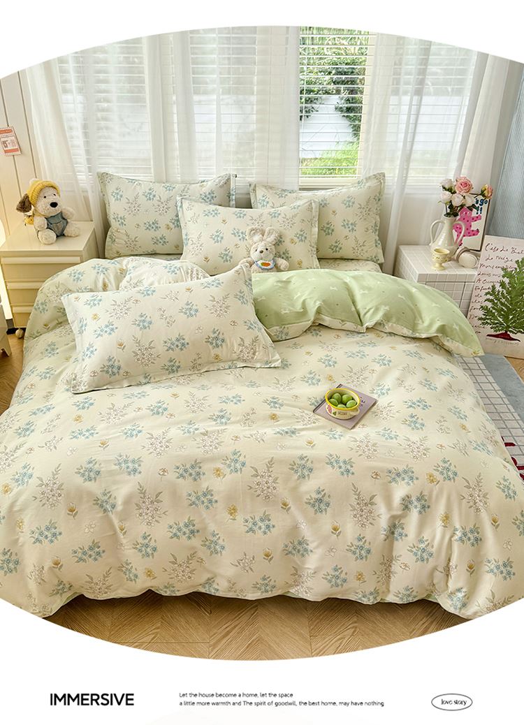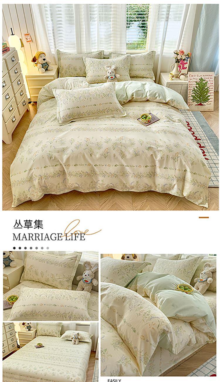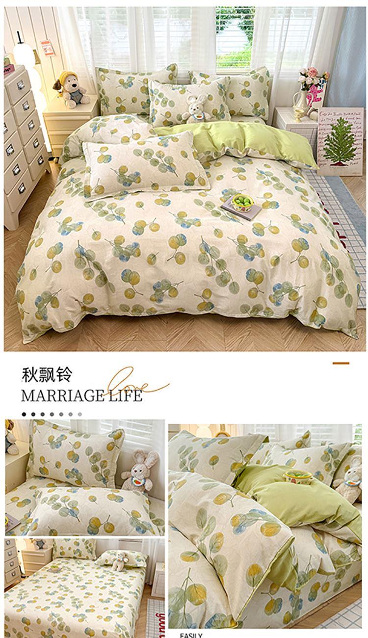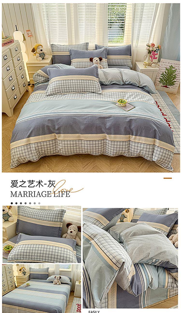 1:从内而外皆是棉与身体接触的每一寸都是天然阳光棉, 2:软糯亲肤舒适细腻质感, 触感细腻 柔软舒适 透气排湿 3:AB双版精心搭配的版型设计 给床品增添层次 愈睡愈爱 尺寸:1.8m床被套200*230cm*1床单:230*245cm *1 枕套:48*74cm*2 包装:彩盒