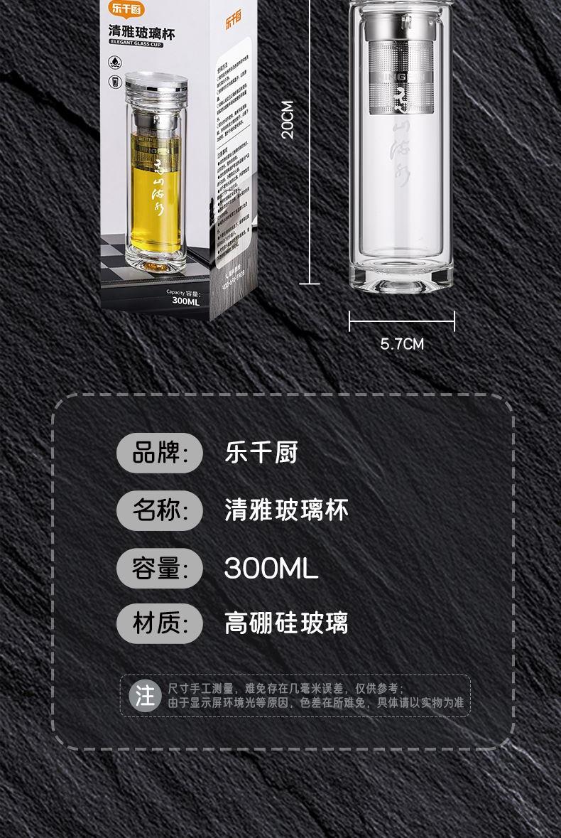 材 质:高硼硅玻璃 容 量:300ml 彩盒尺寸:6.9*6.9*21cm 1. 双层高硼硅玻璃材质,经800℃高温烧制,环保无有害物质,双层设计隔热防烫 2. 304不锈钢边可视盖,可拧开投茶,操作简单便捷 3. 304不锈钢加长管茶漏,轻提即实现茶水分离,茶汤清澈无茶渣