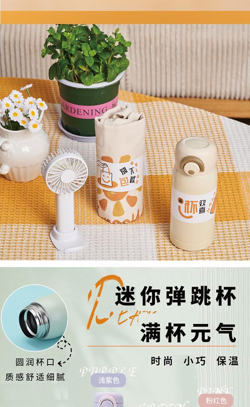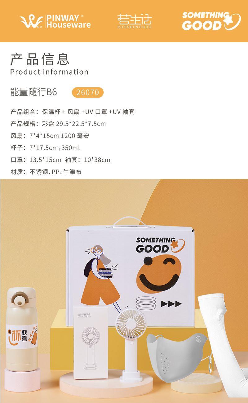 产品型号:26027 产品组合:保温杯+风扇+UV口罩+UV袖套 风扇:7*4*15cm 1200毫安 杯子:7*17.5cm,350ml 口罩:13.5*15cm 袖套: 10*38cm 材质:不锈钢、PP、牛津布 包装:彩盒 备注:口罩、袖套颜色随机