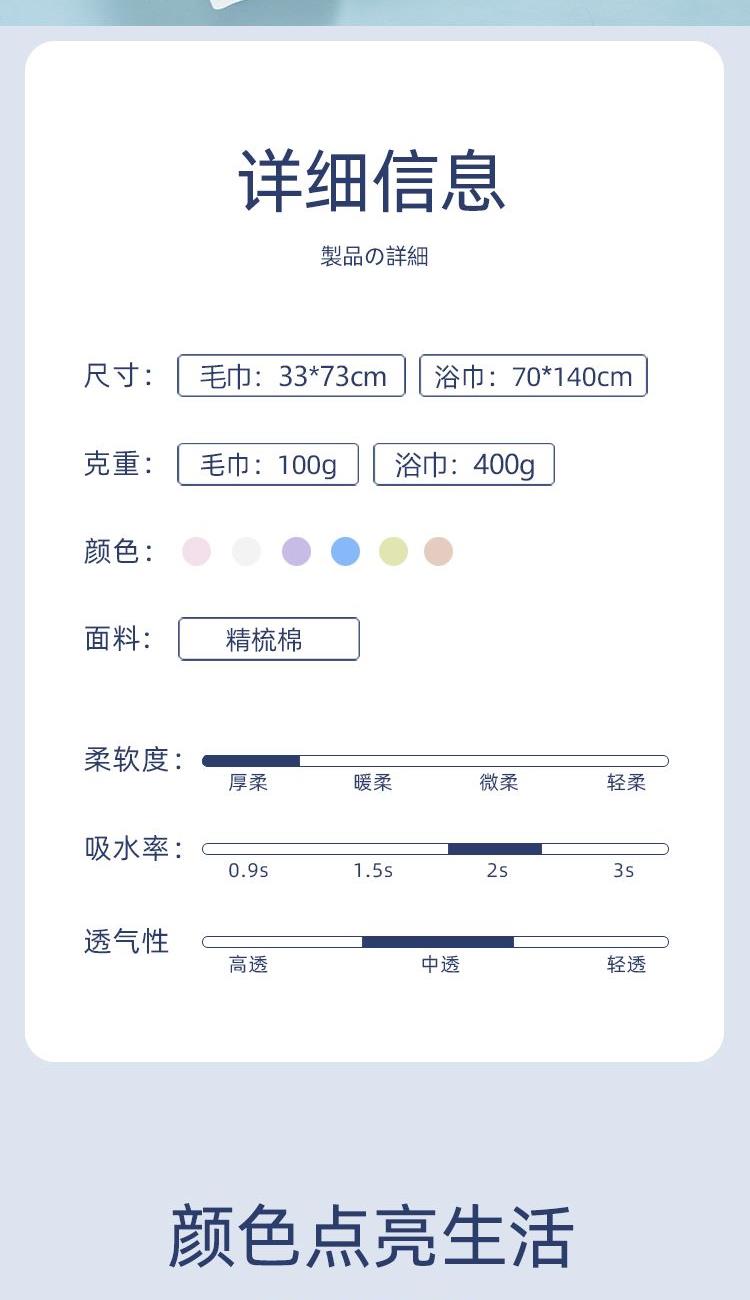 产品型号:美丽色彩-4 规格:毛巾33*73cm*4 克重:毛巾100g 材质:纯棉(长绒棉) 颜色:随机 包装盒尺寸:21*29.5*7.1cm 组装形式:4毛巾 5A抗 菌,杜绝一切有害添加, 新疆长绒棉,柔软亲肤, 耐摩擦,环保印染不掉色, 带给您至臻的使用体感。