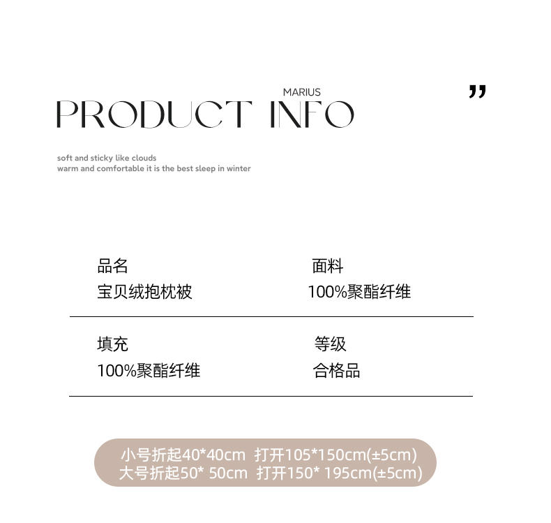 1:宝贝绒抱枕被系列软糯的触感染于指带给梦境一丝甜蜜 2:舒适宝贝绒面料手感细腻给肌肤柔软亲肤舒适,给你不一样的体验 尺寸:40*40cm展开105*145cm 包装:彩盒 重量:1000克