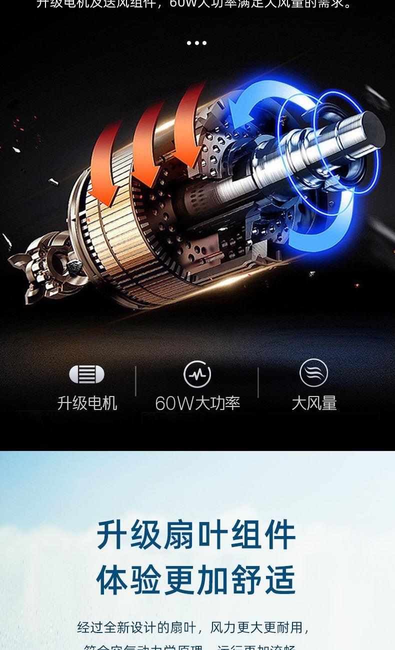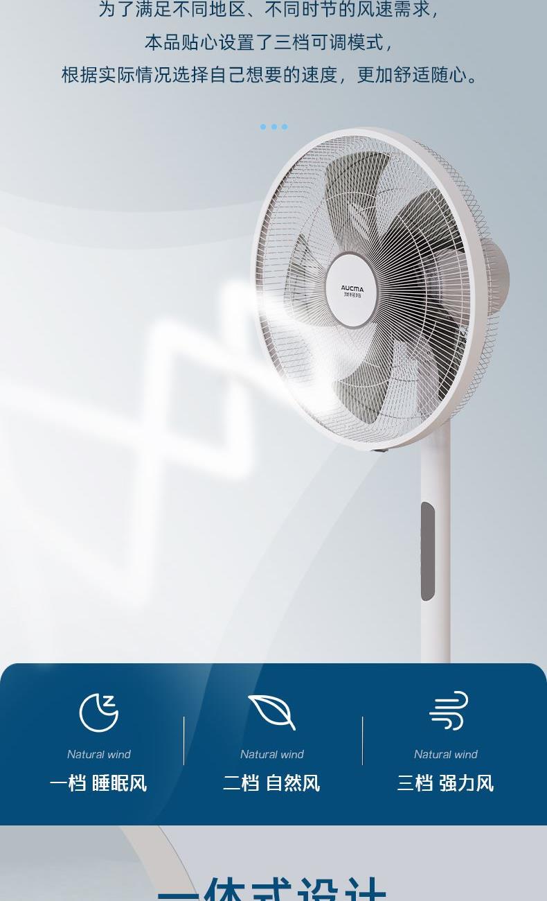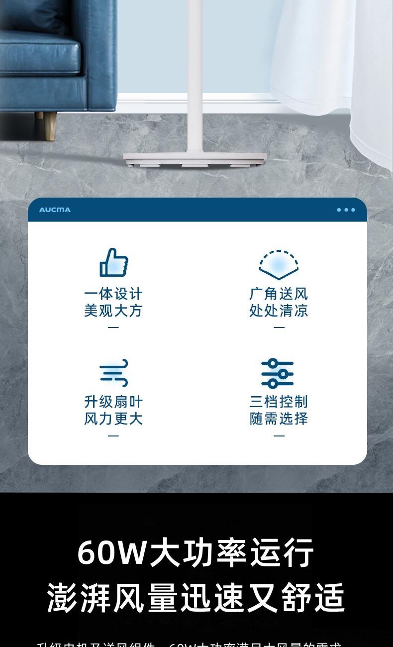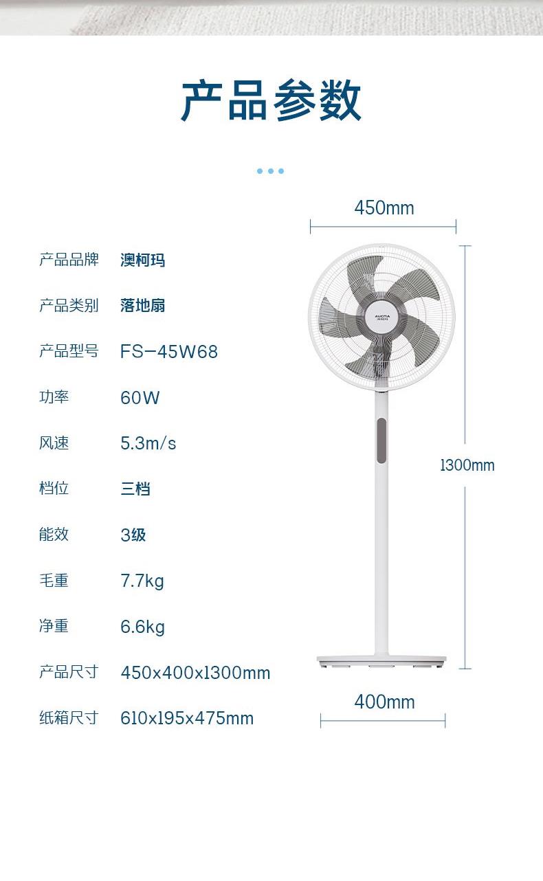 网罩:450mm铁网 扇叶:400mm 高度:1300mm 电机:71-18七系高效电机 立柱:两节ABS 包装尺寸:610*195*475mm 档位:三档 升级电机及送风组件,60W大功率满足大风量的需求。 经过全新设计的扇叶,风力更大更耐用,符合空气动力学原理,运行更加流畅。 自动左右摇头,俯仰手动调节出风角度,送风无死角,体感更舒适。 满足不同时节的风速需求,设置三档可调模式,根据实际情况选择速度,更加舒适随心。 一体式设计,浑然一体更时尚