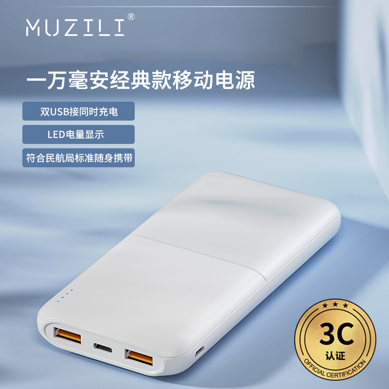 MUZILI·3C认证移动电源+快充数据线套装MZL-8 1、1万毫安经典商务款移动电源 一万毫安 经典外观设计 双USB接口同时充电 3C符合民航局标准,可随身携带 2、66W超级快充一拖三伸缩数据线 兼容苹果15系列 五档伸缩调节 1.2米长度设计 TPE材质经久耐用 三种充电接口满足各种手机 (备注:不含手提袋)