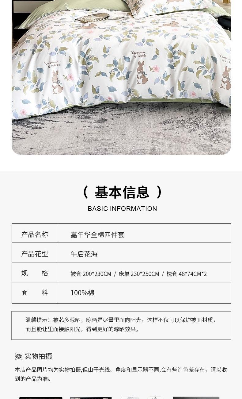 花 型:午后花海 面 料:100棉 规 格:被套200×230cm 床单230×250cm 枕套48×74cm×2
