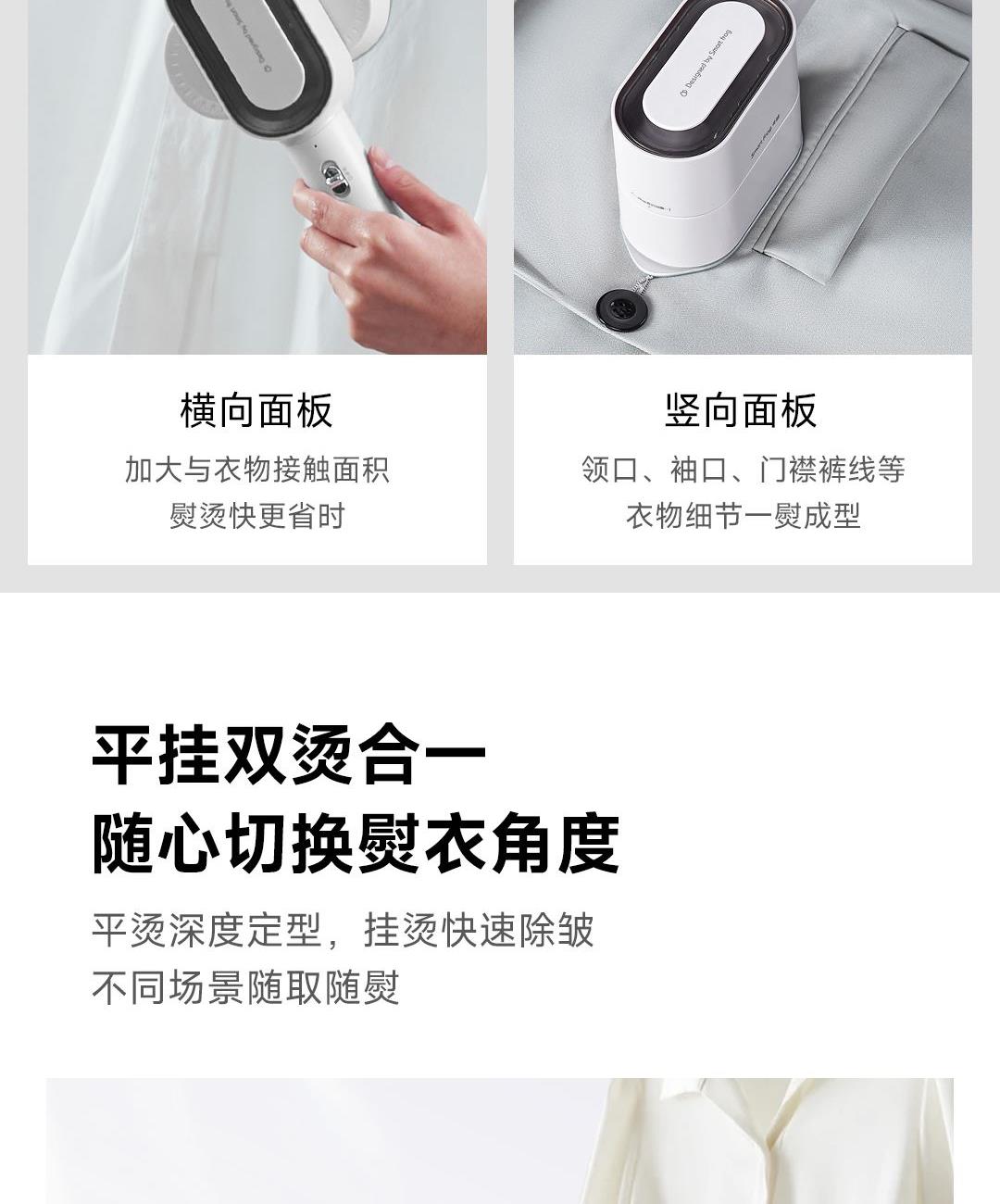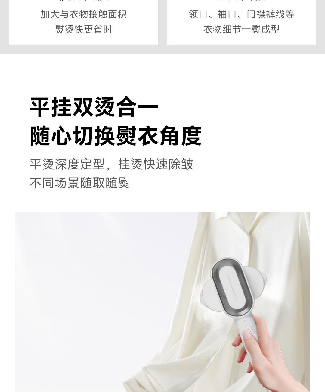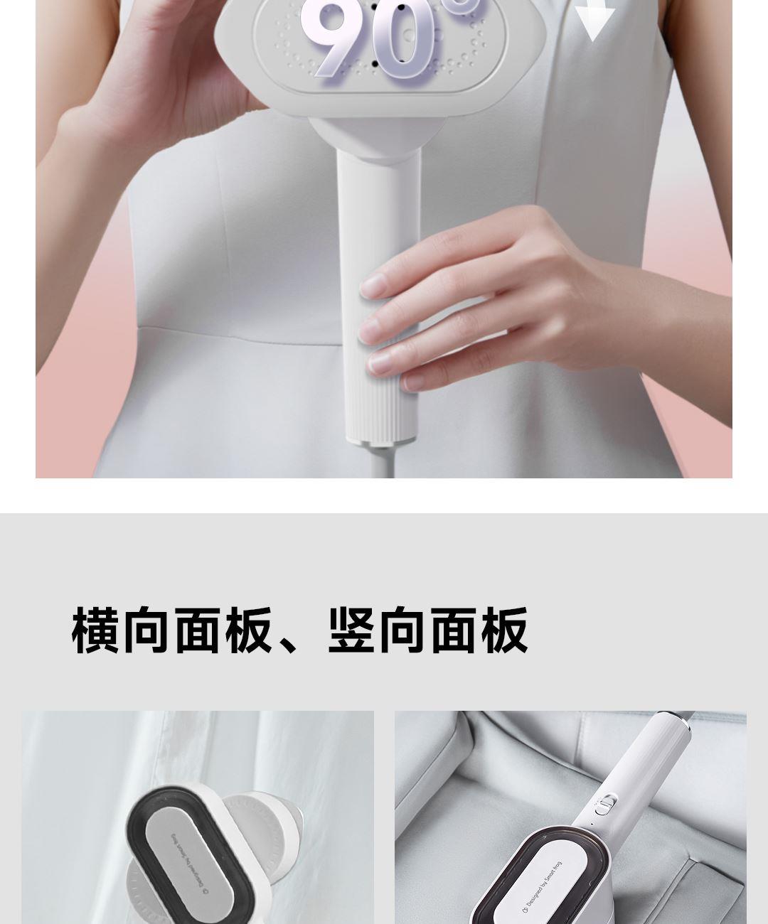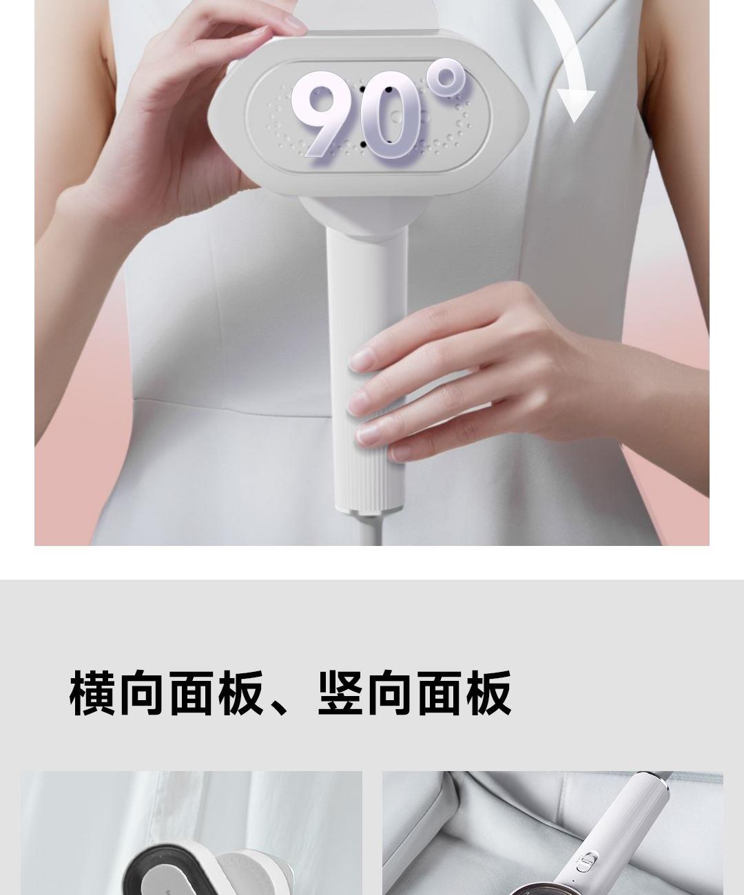 1.90°可旋转面板,64/129mm熨烫面自由切换 2.强脉冲式增压蒸汽系统,即熨即穿 3.平挂干湿多合一,不同场景随取随熨 4.高温蒸汽净菌除螨 5.控温精熨,不伤衣物,真丝也能熨 6.Alalloy加大面板,同样时间多熨一件 7.719g净重,零负担握感,久熨不累手 8.可视化大容量水箱,一次熨多件衣服 9.轻盈小体积,够轻才顺手