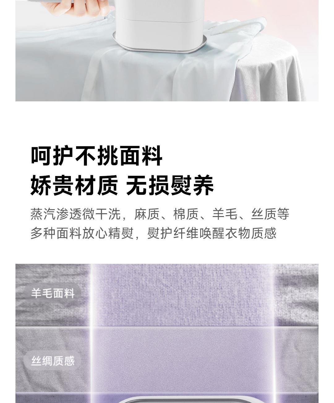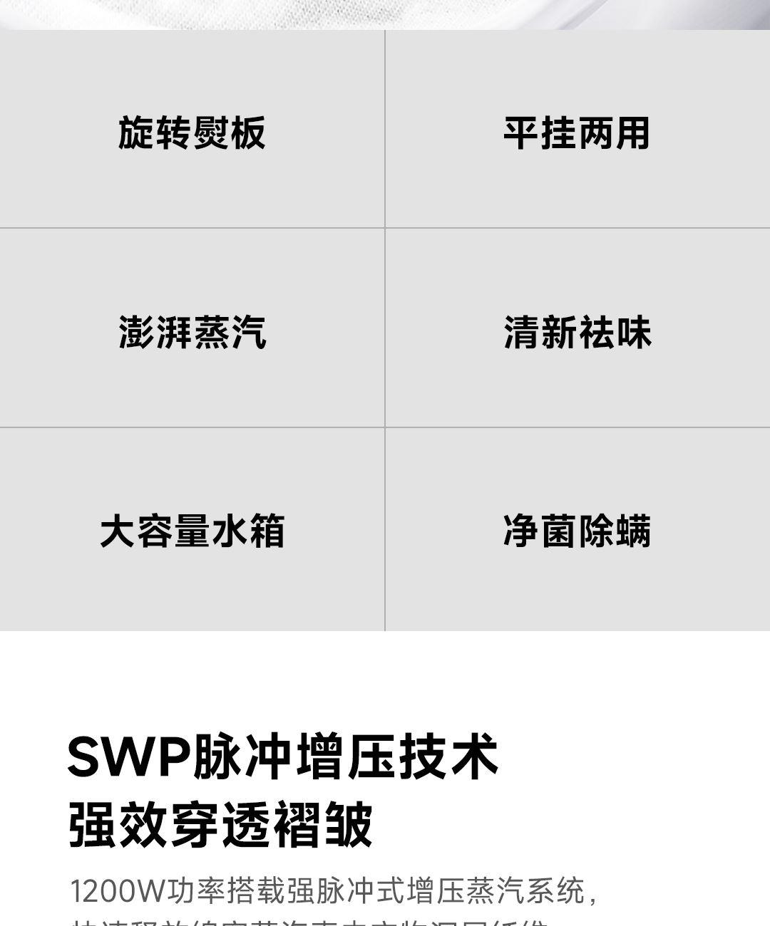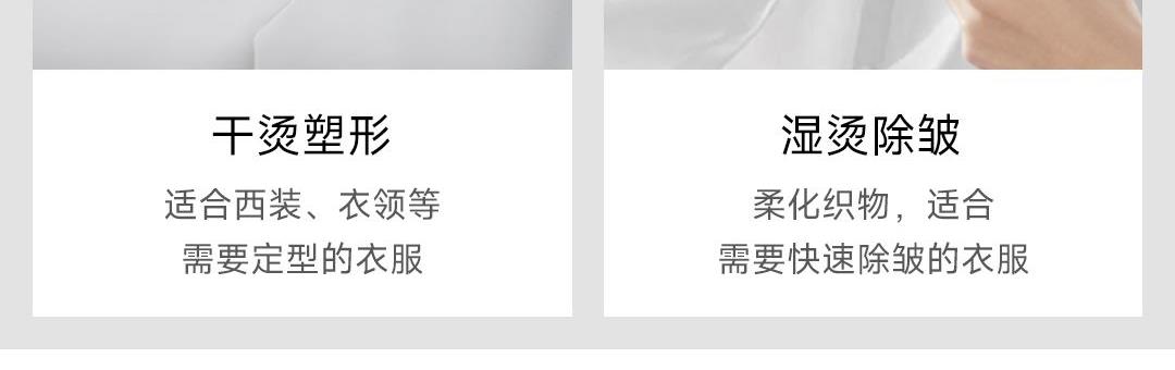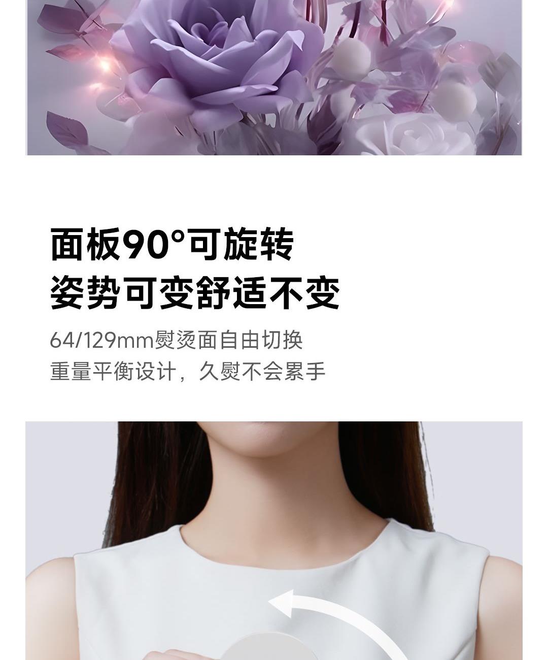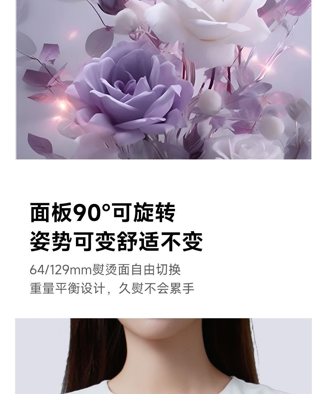 1.90°可旋转面板,64/129mm熨烫面自由切换 2.强脉冲式增压蒸汽系统,即熨即穿 3.平挂干湿多合一,不同场景随取随熨 4.高温蒸汽净菌除螨 5.控温精熨,不伤衣物,真丝也能熨 6.Alalloy加大面板,同样时间多熨一件 7.719g净重,零负担握感,久熨不累手 8.可视化大容量水箱,一次熨多件衣服 9.轻盈小体积,够轻才顺手