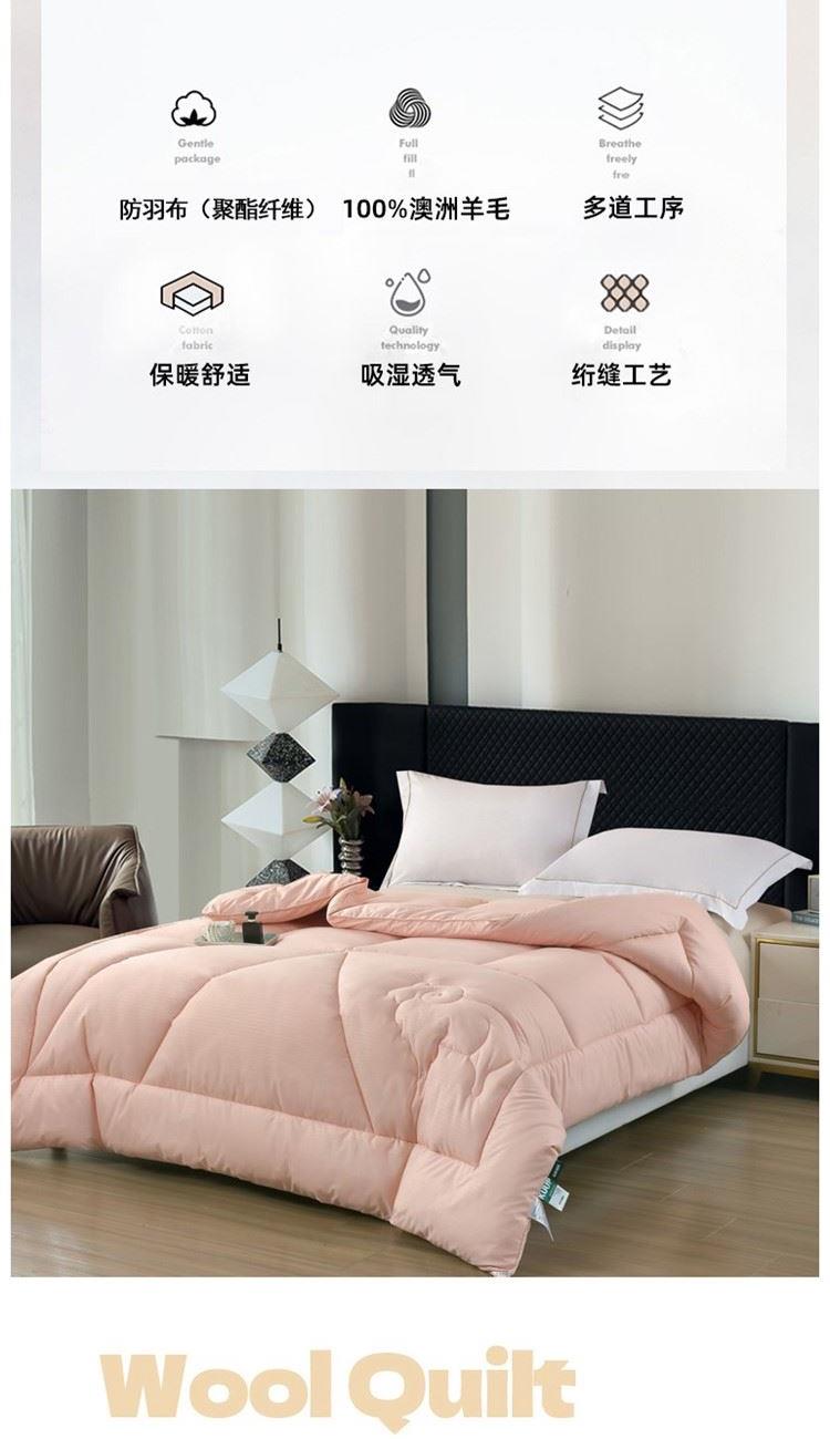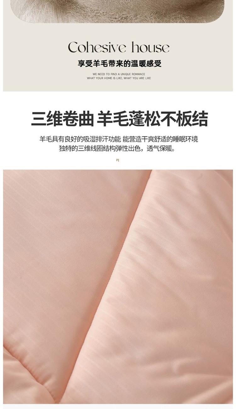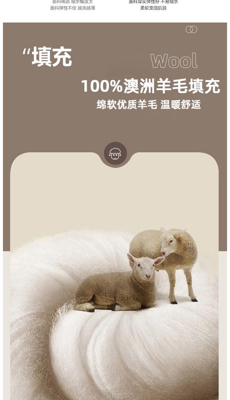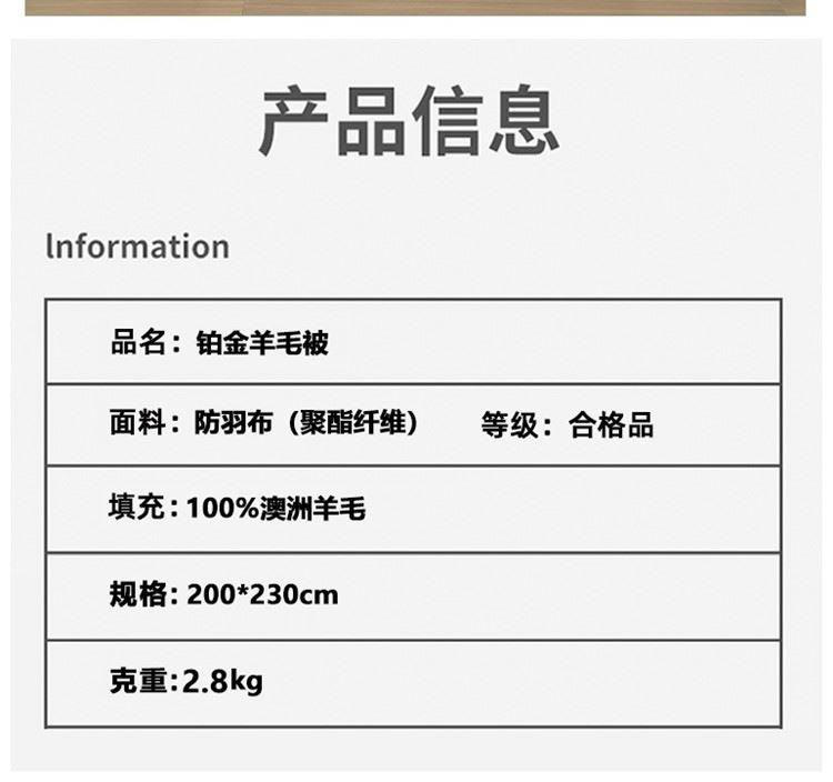 规格:200*230cm 填充:澳洲羊毛 面料:防羽布(聚酯纤维) 重量:2.8kg 1.澳洲羊毛自身的卷曲性使被子蓬松透气,同时能够很好的锁住温度,使热量均衡不流失,保持温暖,整晚舒适 2.防羽布触感细腻温暖,洁净避免异味,透气保湿性好,带来冬日舒适温暖体验 3.针脚细密,固定被芯,走线流畅均匀,不易板结变形,品质保证