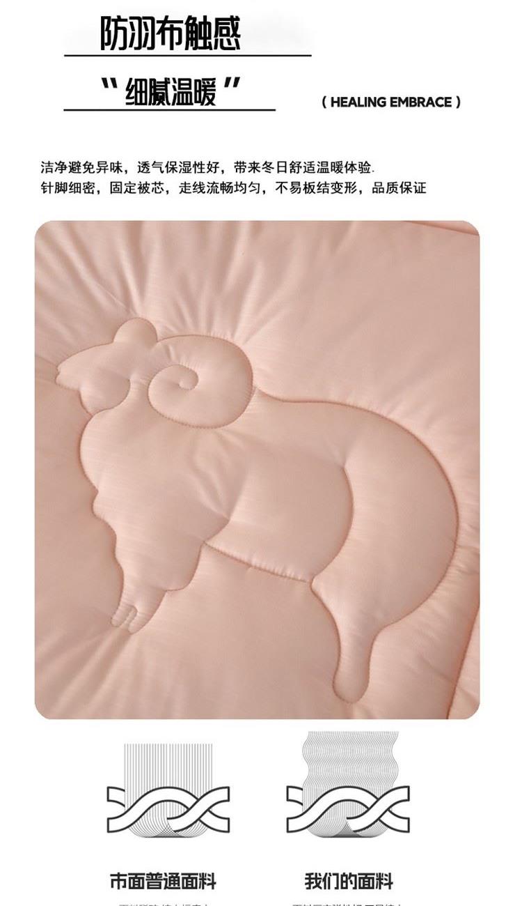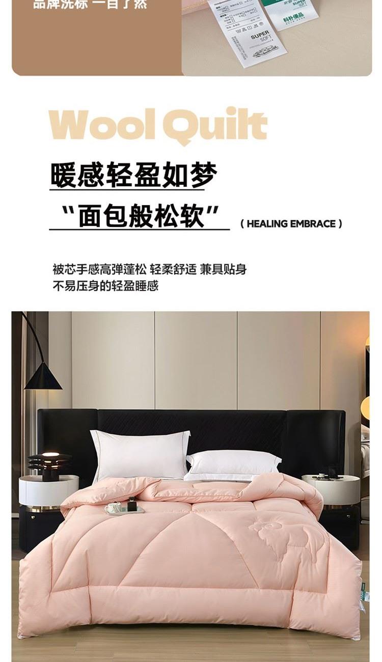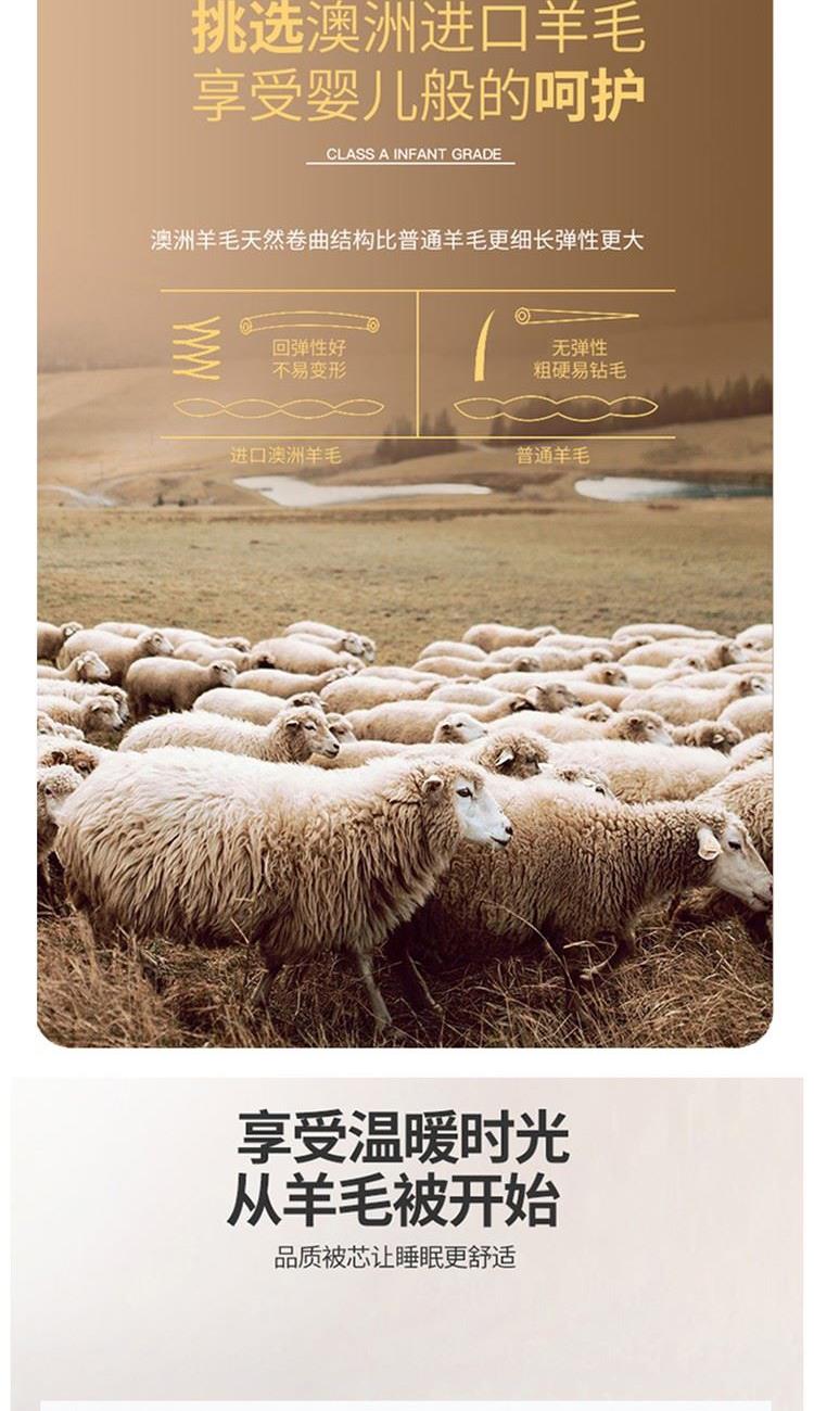 规格:200*230cm 填充:澳洲羊毛 面料:防羽布(聚酯纤维) 重量:2.8kg 1.澳洲羊毛自身的卷曲性使被子蓬松透气,同时能够很好的锁住温度,使热量均衡不流失,保持温暖,整晚舒适 2.防羽布触感细腻温暖,洁净避免异味,透气保湿性好,带来冬日舒适温暖体验 3.针脚细密,固定被芯,走线流畅均匀,不易板结变形,品质保证