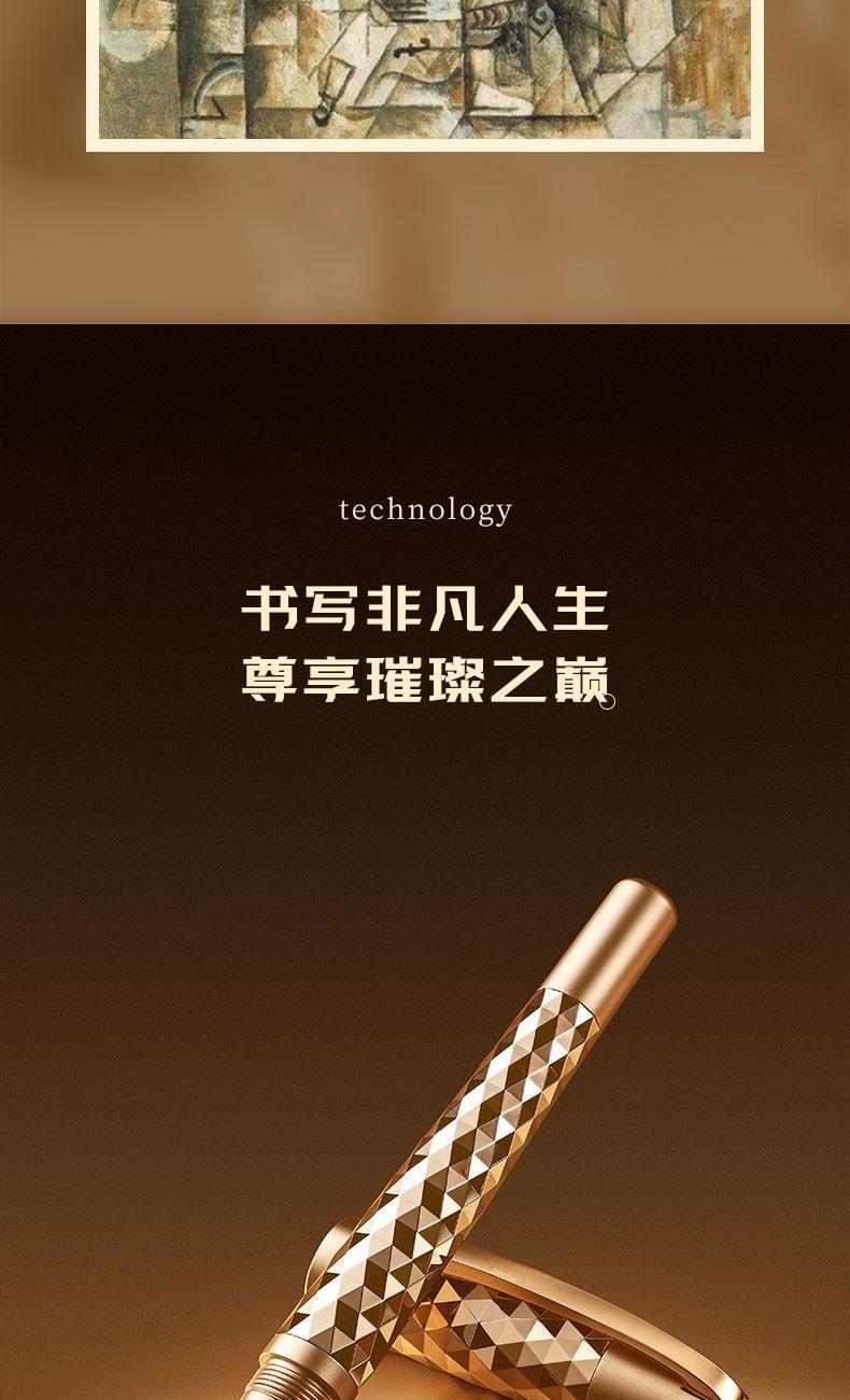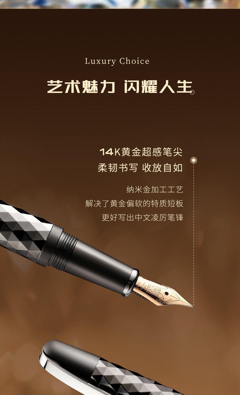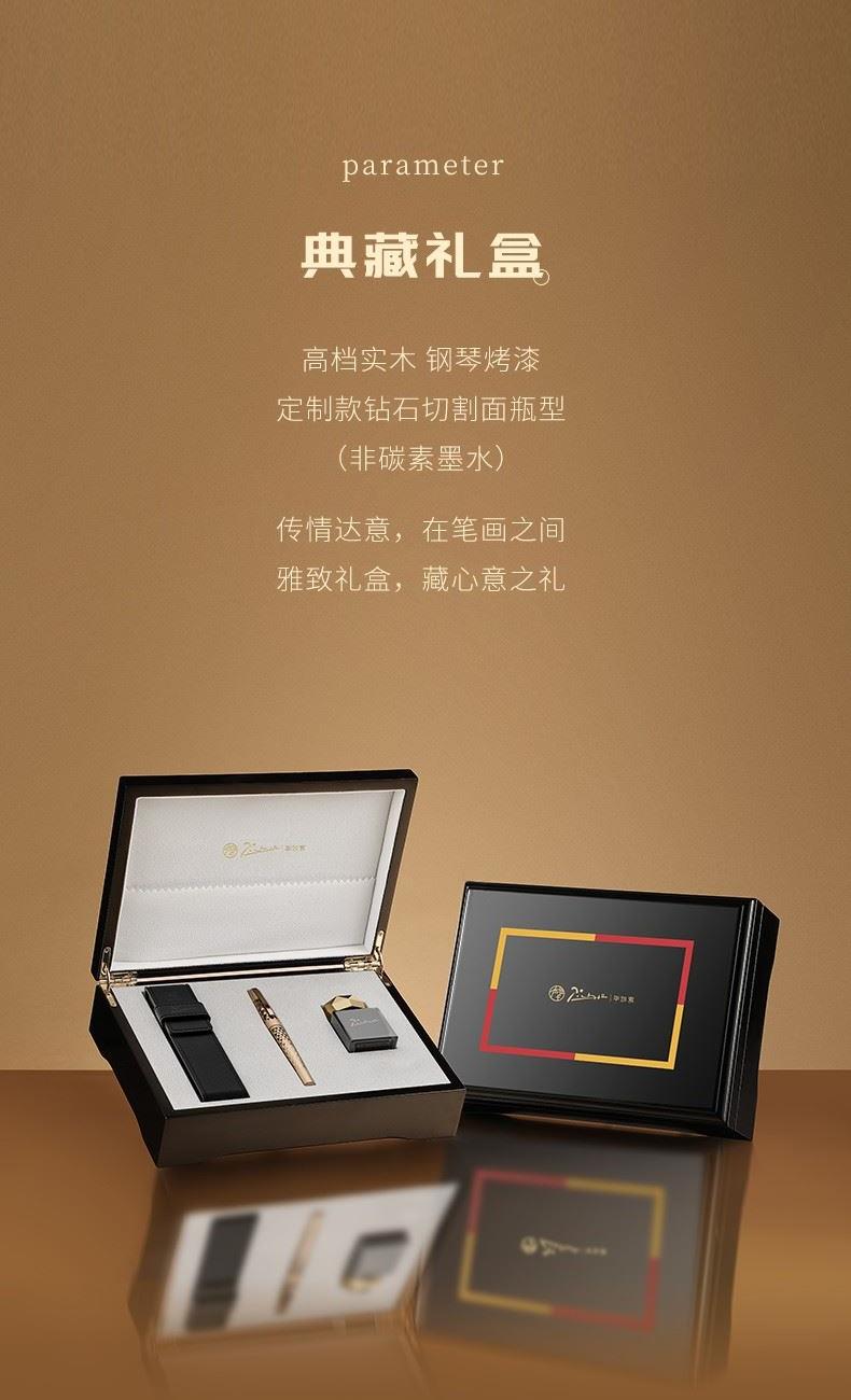 【礼盒包装】 钢笔、笔袋、墨水38ml、包装盒、外彩盒、手提袋、合格证、说明书 立体多维结构,不断突破边界 激发强烈感官,自带超强气场