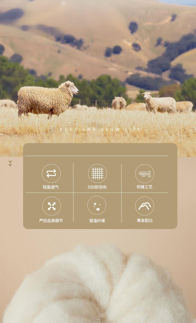 规 格 : 200×230cm 面 料 : 50D防羽布 填 充 : 85%绵羊毛(超细)+15%聚酯纤维(保温)+外层锁温纤维 克 重 : 2600G 超细绵羊毛冬季保暖吸湿透气的良好特性,AB双面羊毛卷曲特性能够存储大量空气体温不易流散,采用50D双层防羽面料,光泽柔和,富有弹性,常年使用仍能保持舒适性。