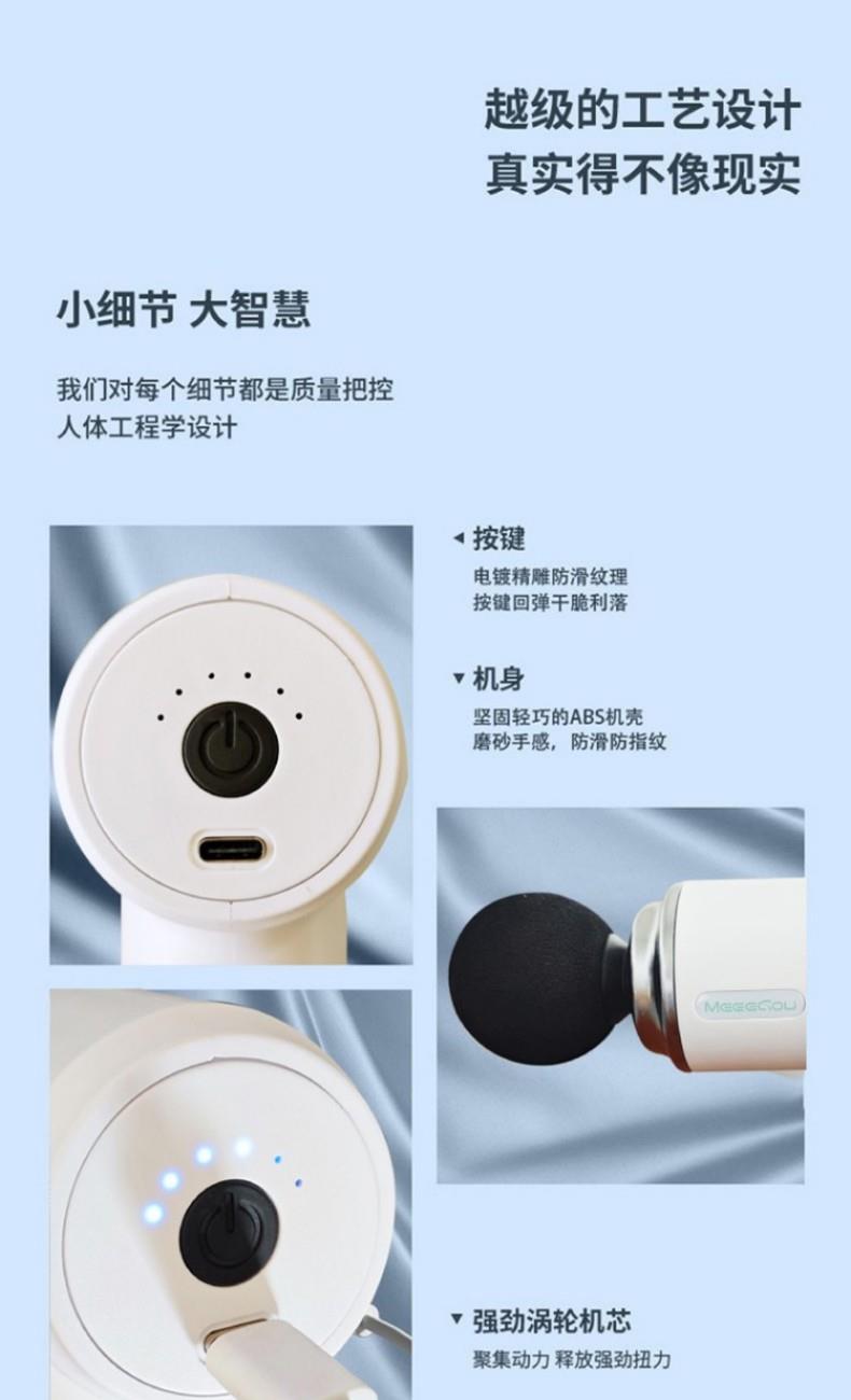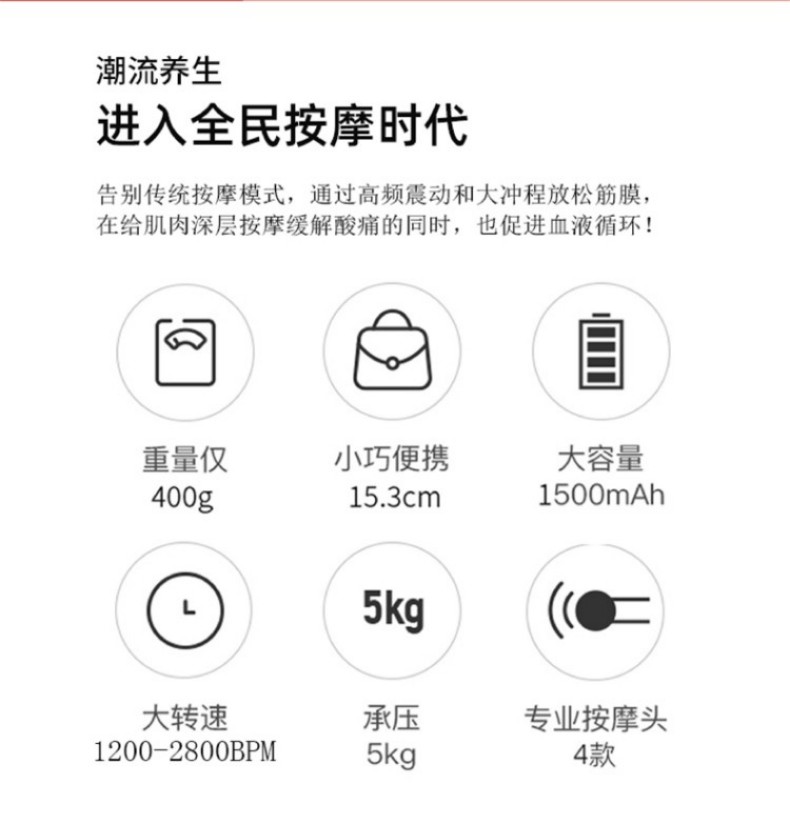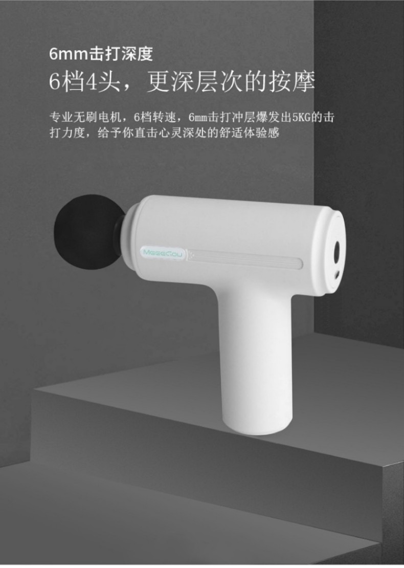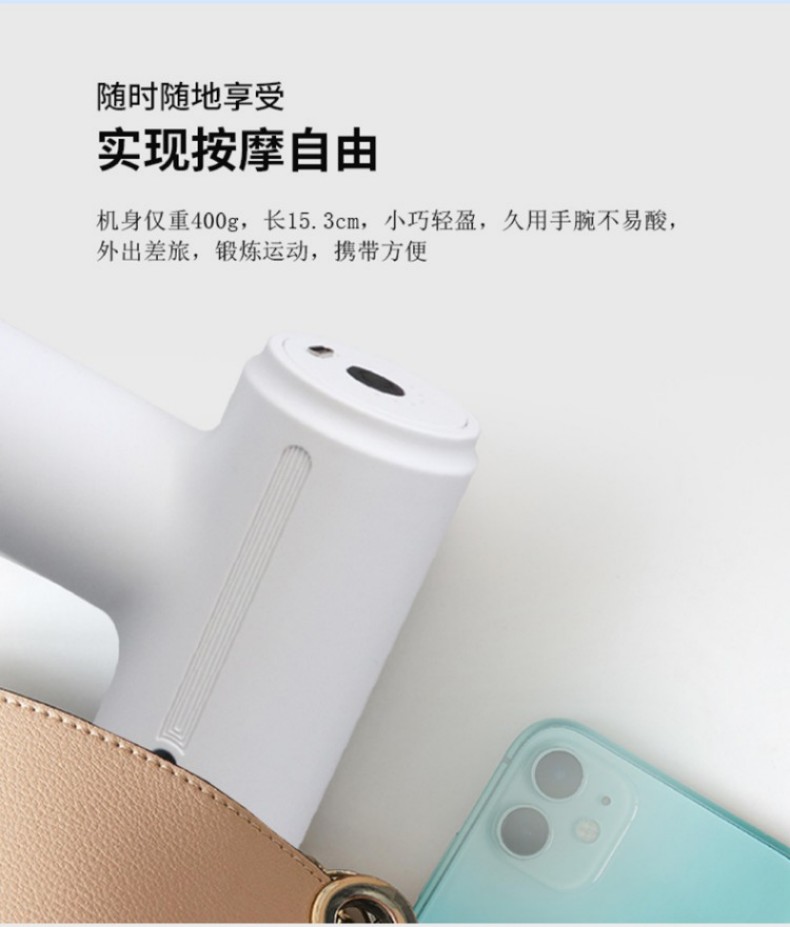 1、小巧轻盈,久用手腕不易酸,外出差旅,锻炼运动,携带方便 2、强劲涡轮机芯、 Type-c充电、防滑手柄设计 3、6档4头,更深层次的按摩,专业无刷电机,6档转速,6mm击打冲层爆发出5KG的击打力度,给予你直击心灵深处的舒适体验感